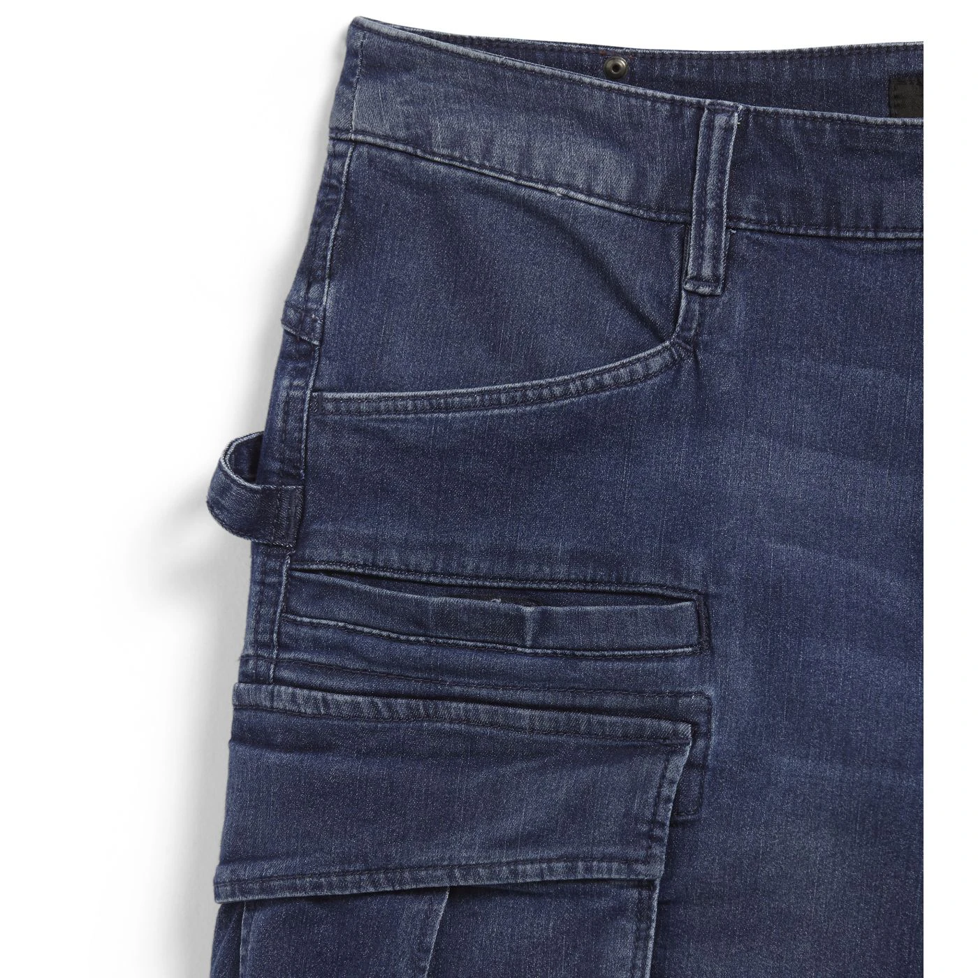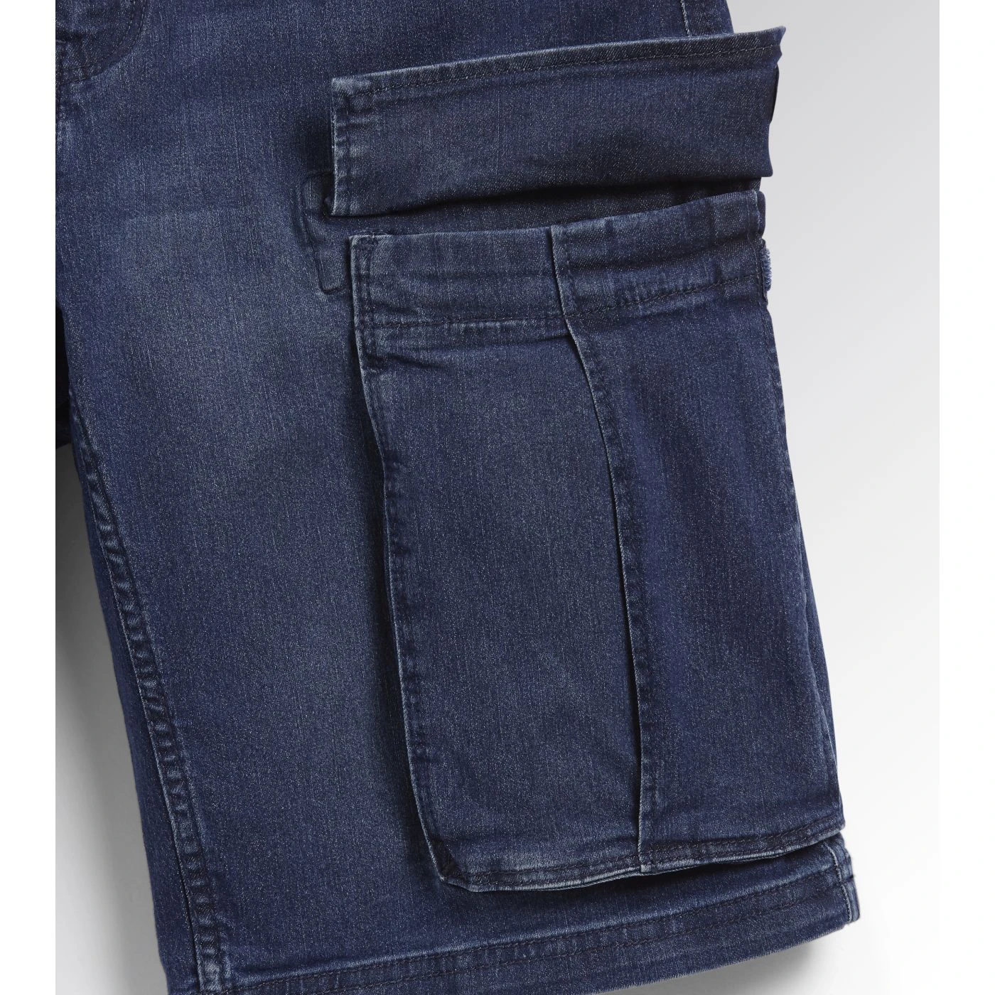 Lightweight stonewashed stretch cargo denim Bermuda shorts. Fabric treatments and attention to detail typical of Italian jeans design. Three large side pockets and hammer holder and two back pockets with Velcro fastening. Relaxed fit with a modern cut.