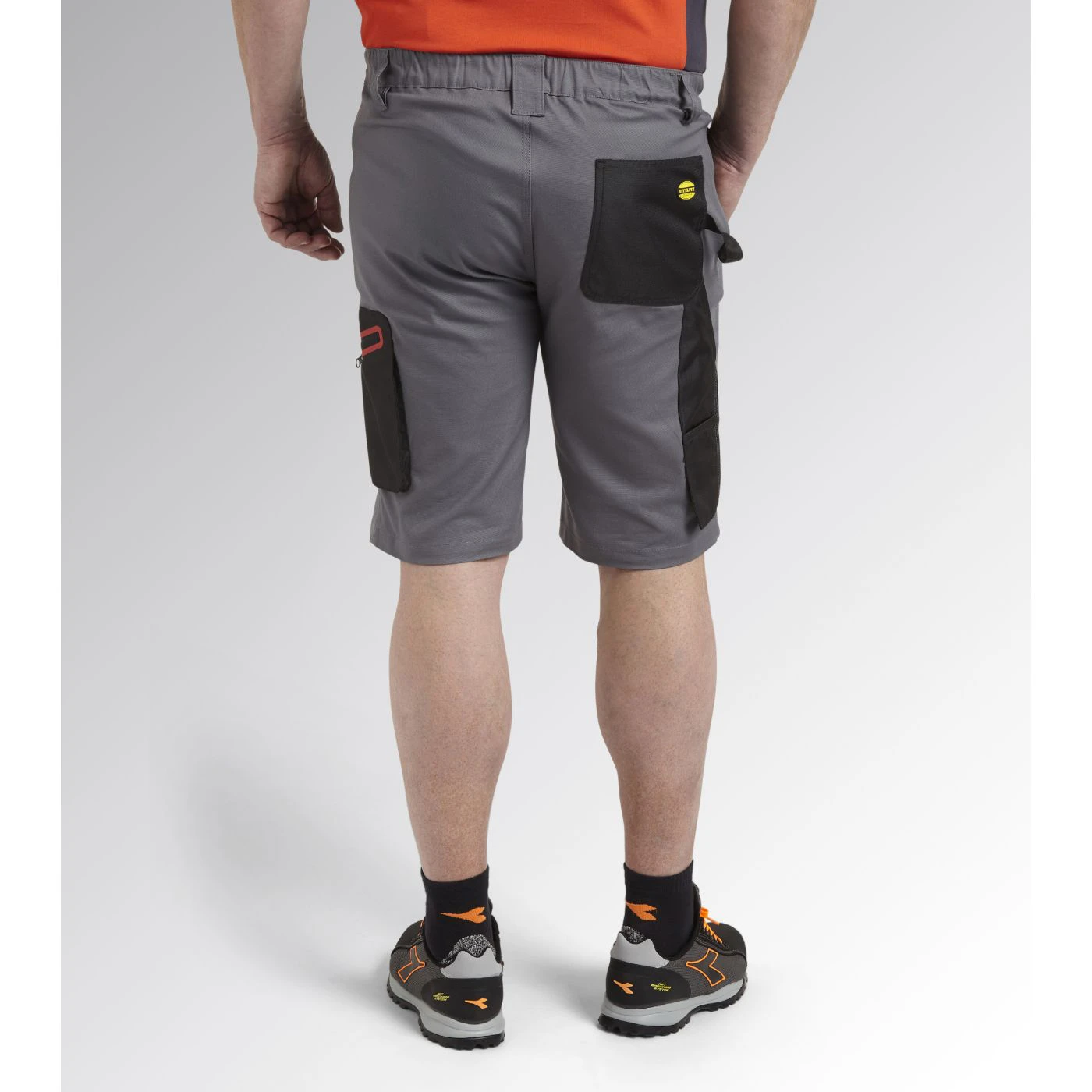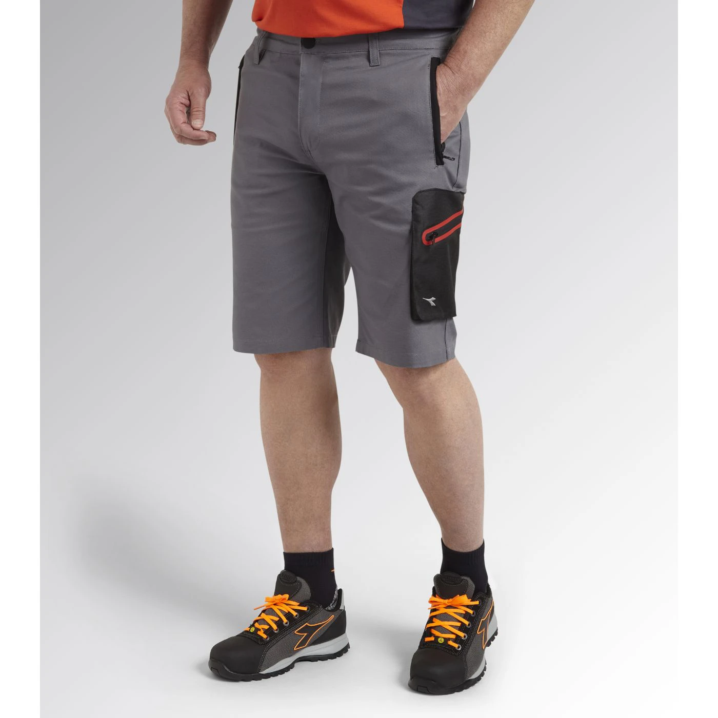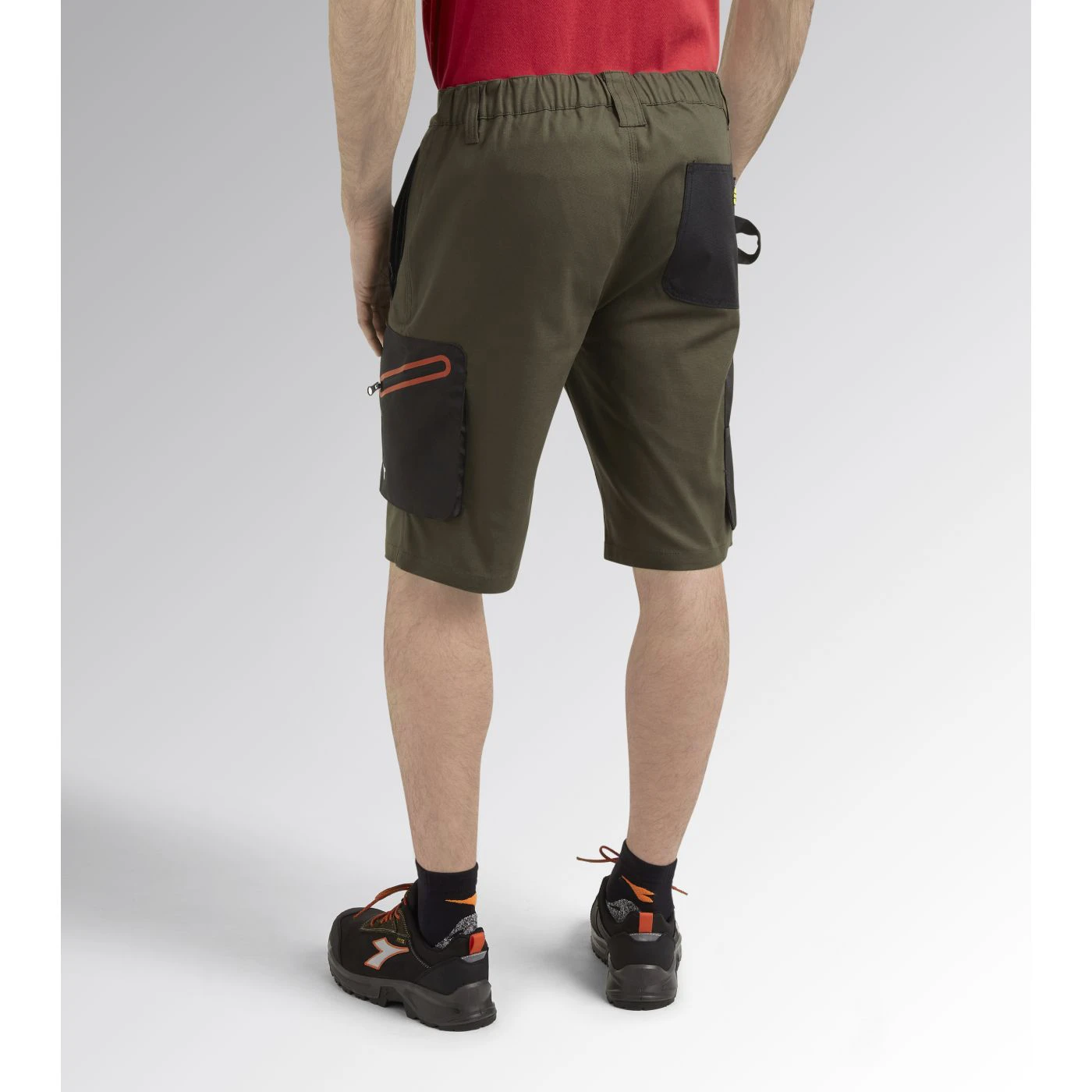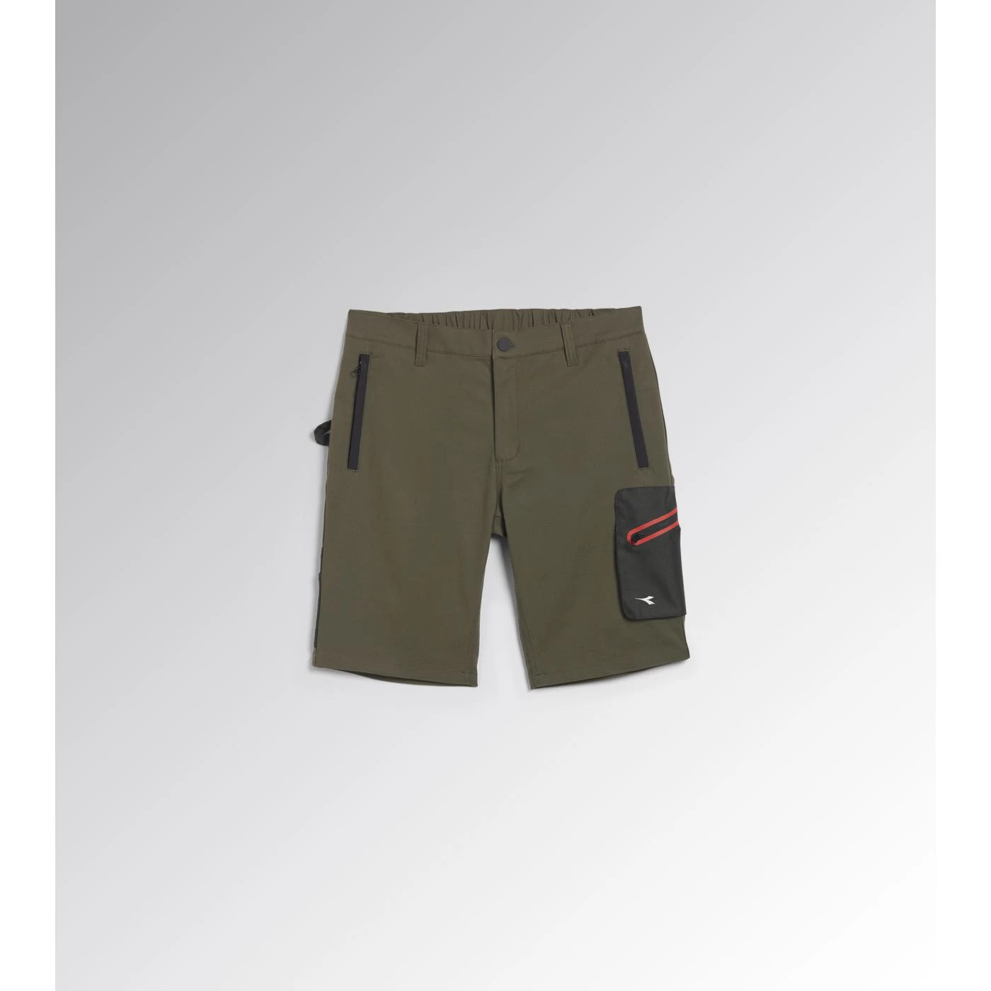 Stretch cotton canvas Bermuda shorts with zip side pocket in abrasion-resistant polyester Oxford fabric and red heat-taped detailing and zip hand pockets. Elasticated waist, ruler and hammer holder, triple stitching.
