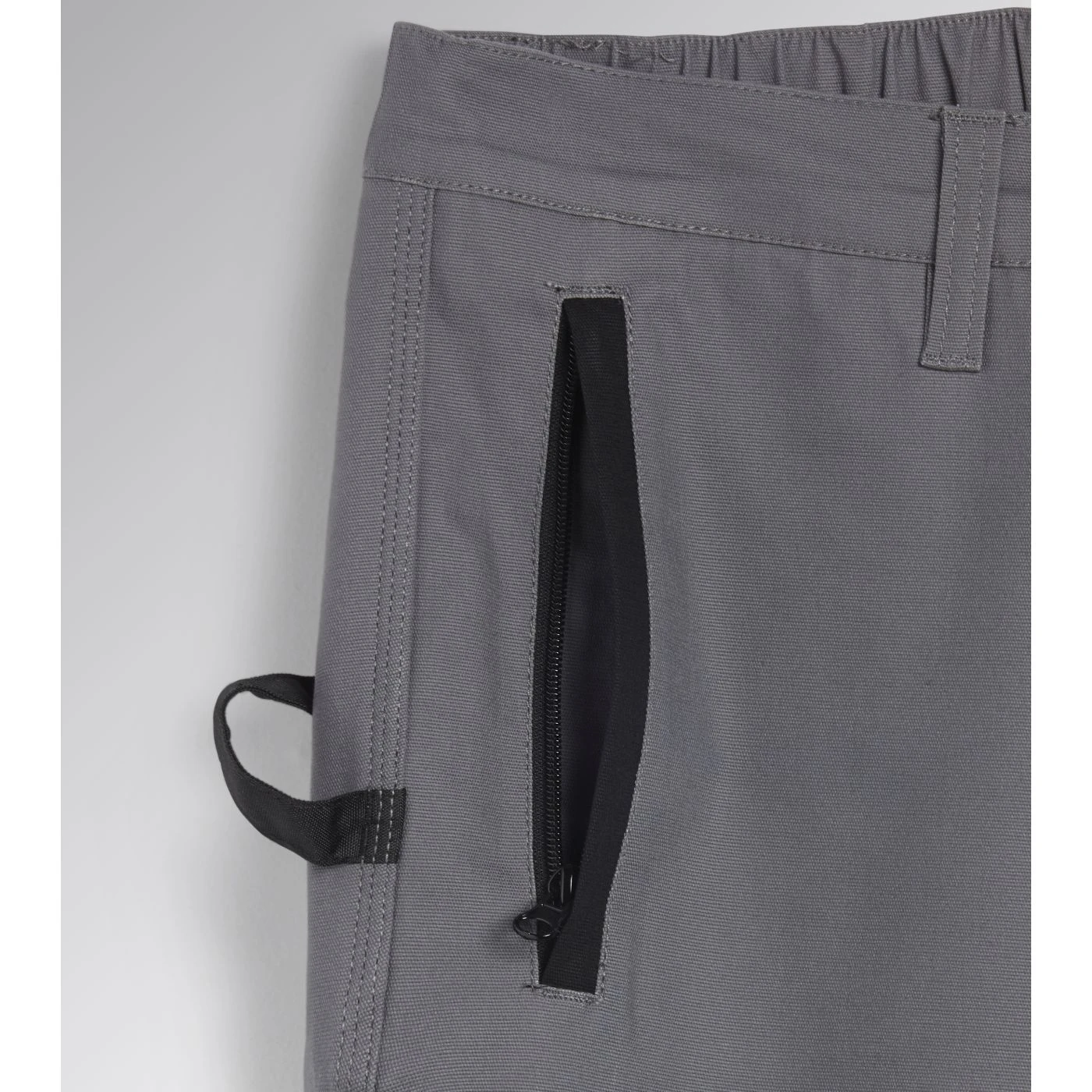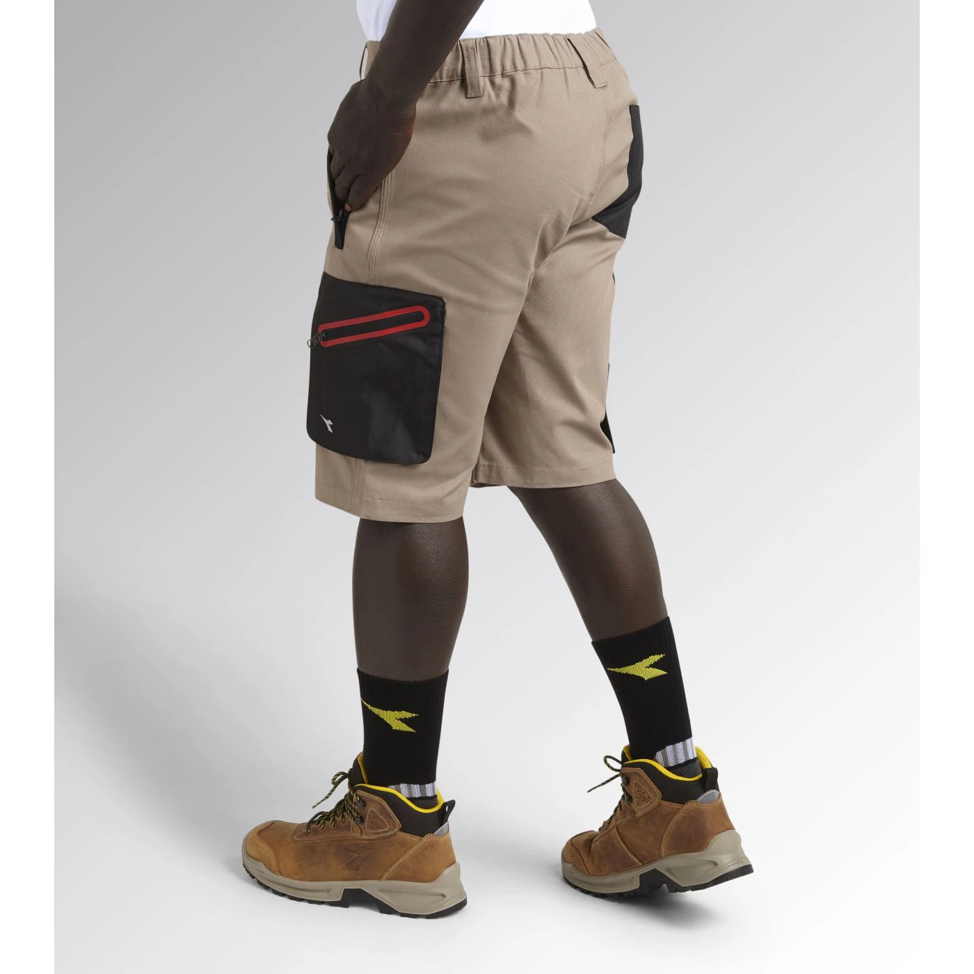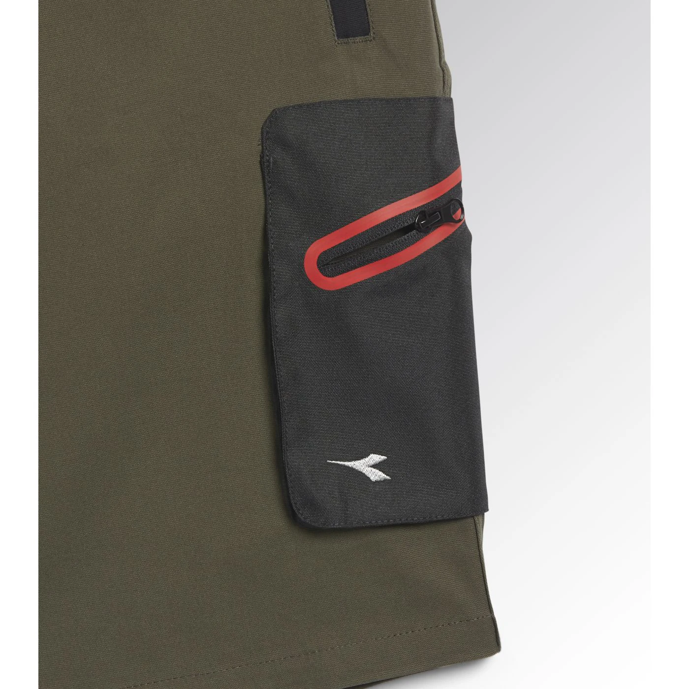 Stretch cotton canvas Bermuda shorts with zip side pocket in abrasion-resistant polyester Oxford fabric and red heat-taped detailing and zip hand pockets. Elasticated waist, ruler and hammer holder, triple stitching.