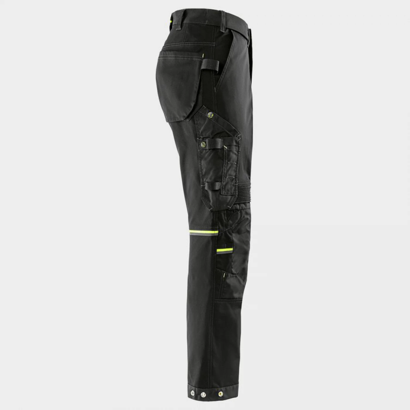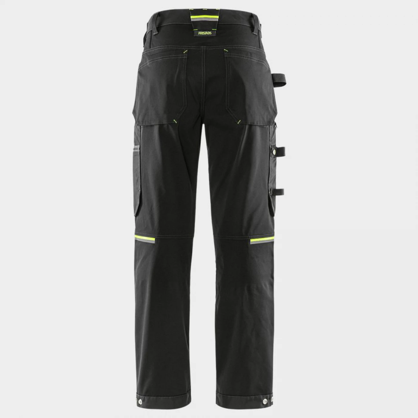 Pantaloni de lucru multifuncționali, din material complet elastic, compatibili cu sistemul modular Flex de la Fristads pentru atașarea buzunarelor suspendate cu magneți.