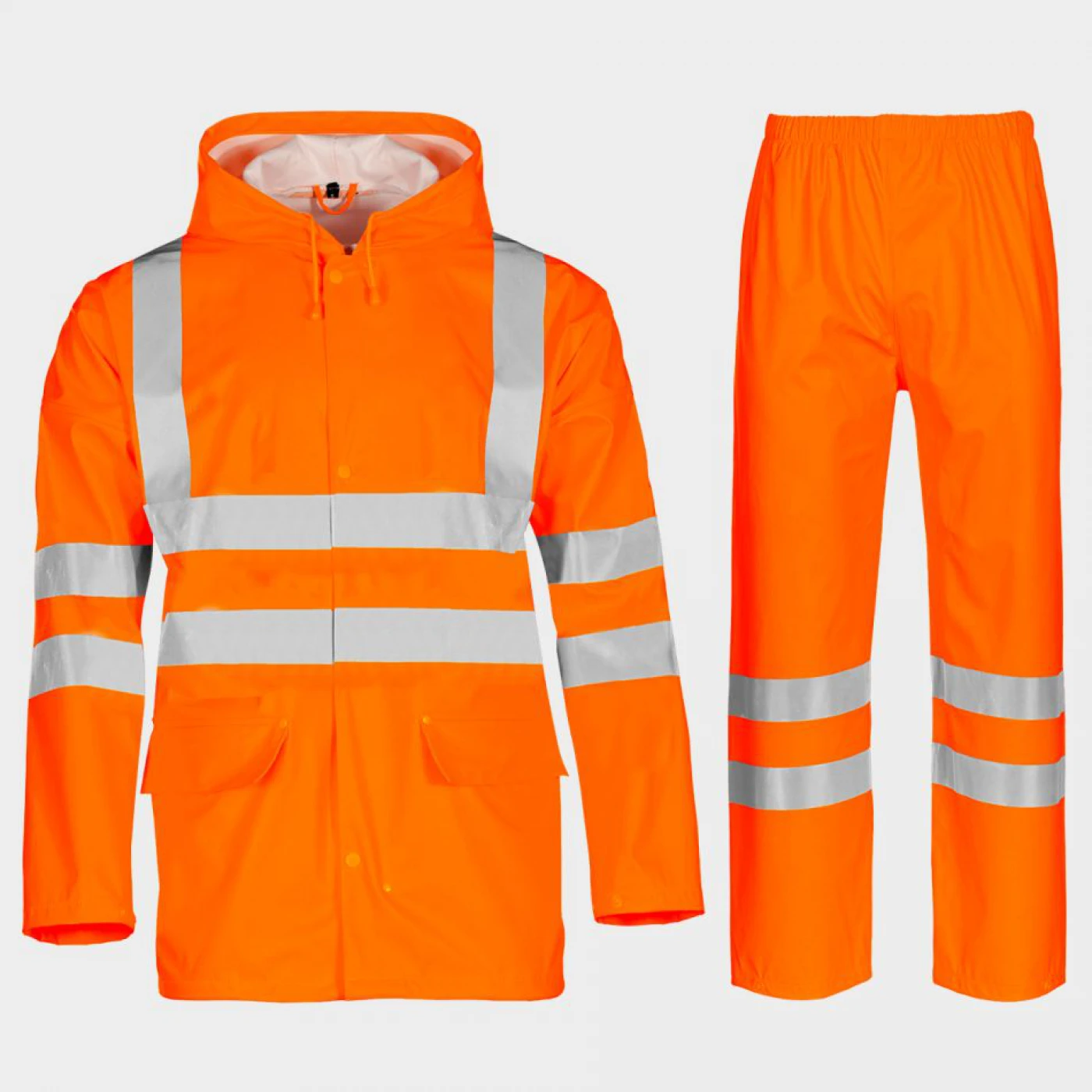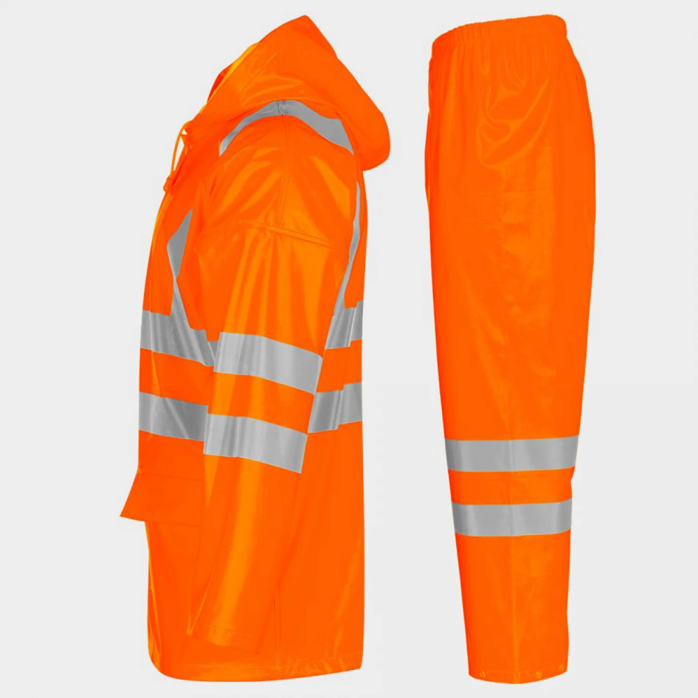 Jachetă și pantaloni de protecție impermeabili, cu benzi reflectorizante de 5 cm. Jachetă cu glugă ajustabilă cu șnururi, care poate fi ascunsă în guler. Închidere cu fermoar și capse, fermoarul este bidirecțional. Capse și la manșete pentru ajustare suplimentară. Pantaloni cu talie elastică și ajustare suplimentară la tivuri cu capse. MATERIAL: poliester/poliuretan, strat PU, 200 g/m²; coloană de apă 5000 mm.