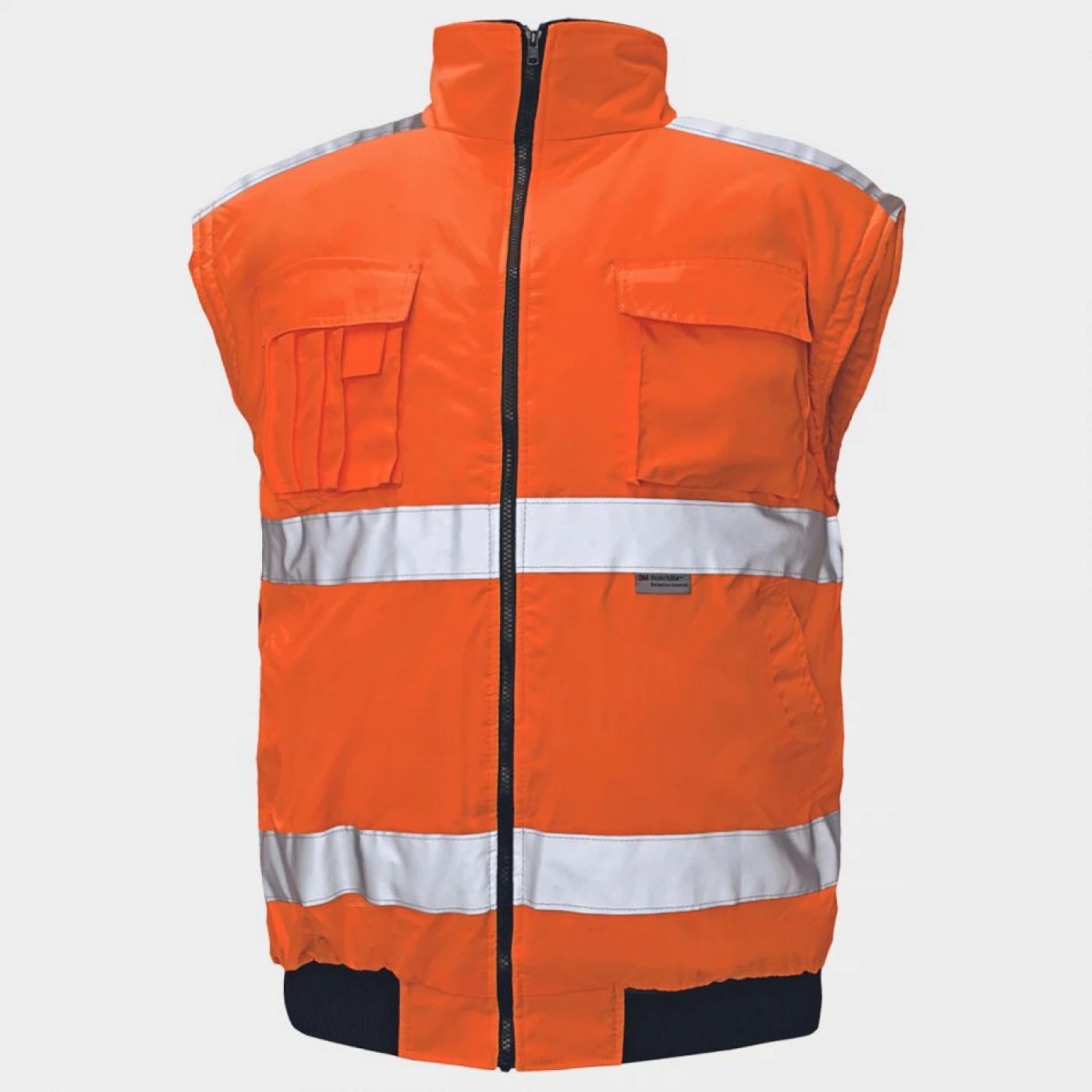 Jachetă de semnalizare 2 în 1 cu benzi reflectorizante. Mâneci detașabile și o vestă care poate fi purtată separat. Glugă ascunsă în guler. Cusături sigilate. Accesorii reflectorizante 3M. Impermeabil clasa 3, material respirabil clasa 1, conform standardului EN 343