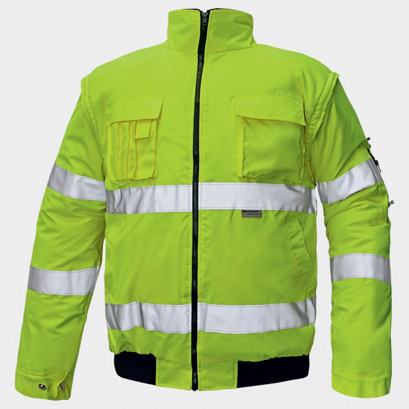 Jachetă de semnalizare 2 în 1 cu benzi reflectorizante. Mâneci detașabile și o vestă care poate fi purtată separat. Glugă ascunsă în guler. Cusături sigilate. Accesorii reflectorizante 3M. Impermeabil clasa 3, material respirabil clasa 1, conform standardului EN 343