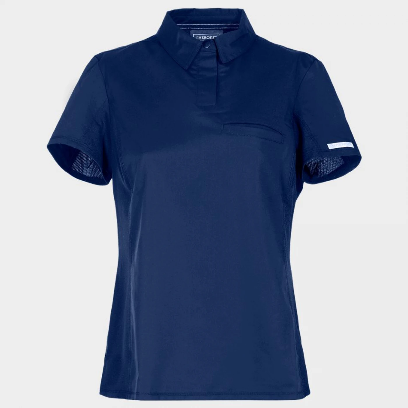 Tunică medicală de damă cu guler polo, oferind un aspect elegant și profesional. Face parte din colecția Cherokee Revolution, combinând confortul, elasticitatea și funcționalitatea.