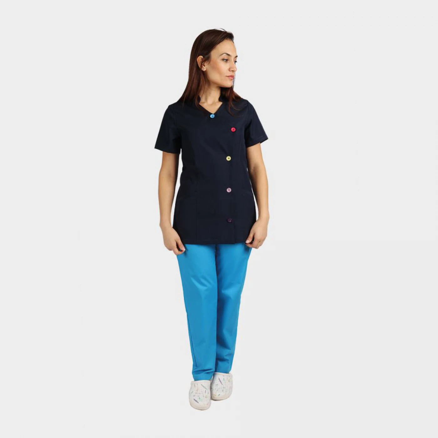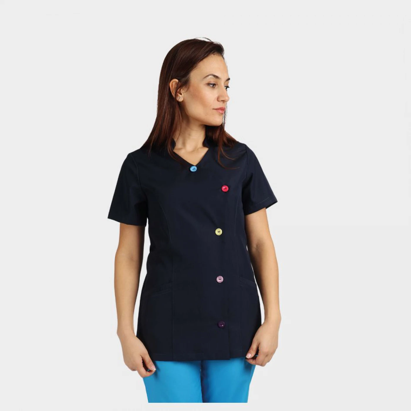 Tunica pentru dame cu mâneca scurta, două buzunare, închidere cu nasturi colorați. MATERIAL: viscoză/poliester, 140 g/m²
