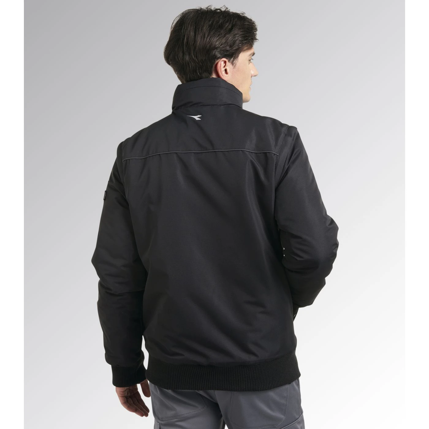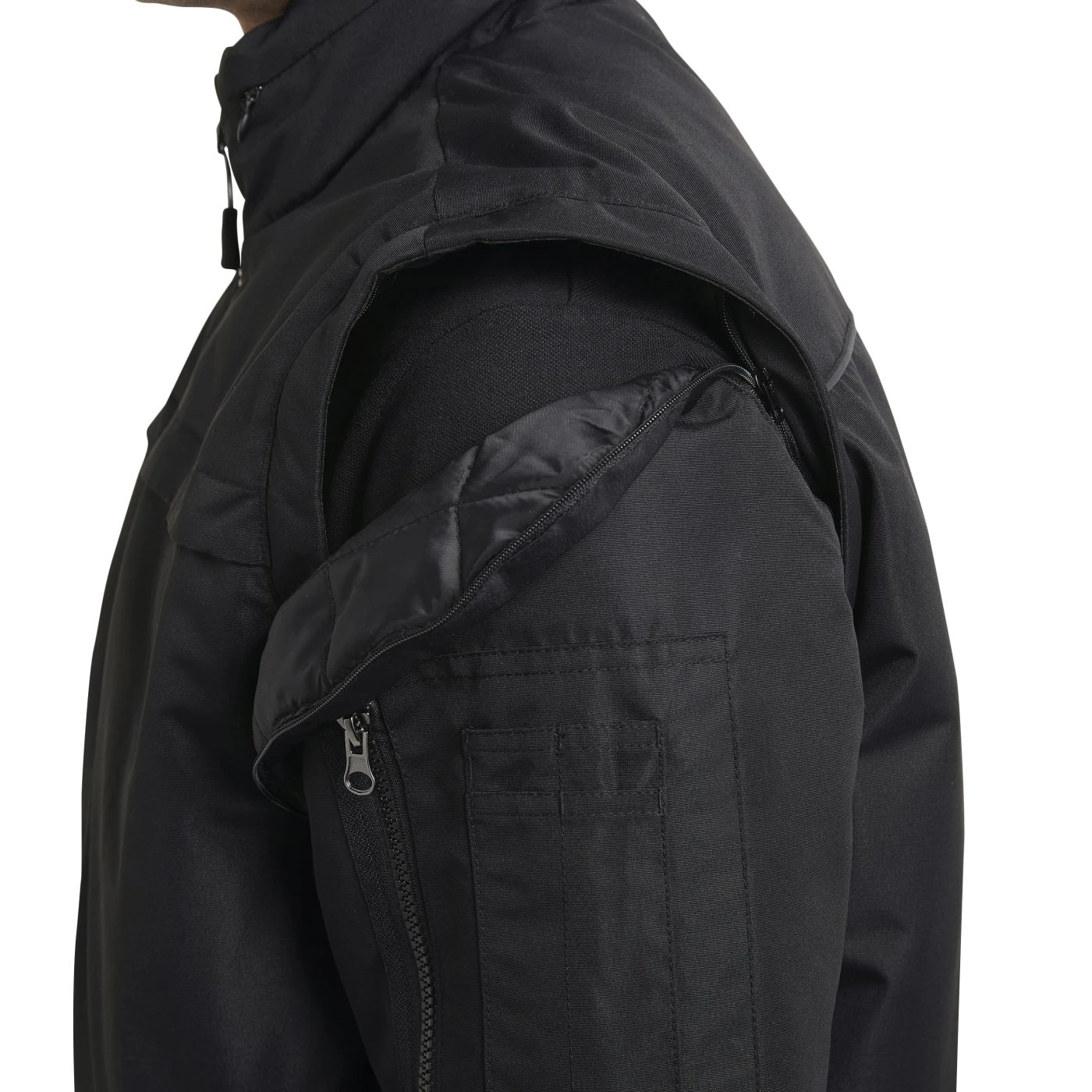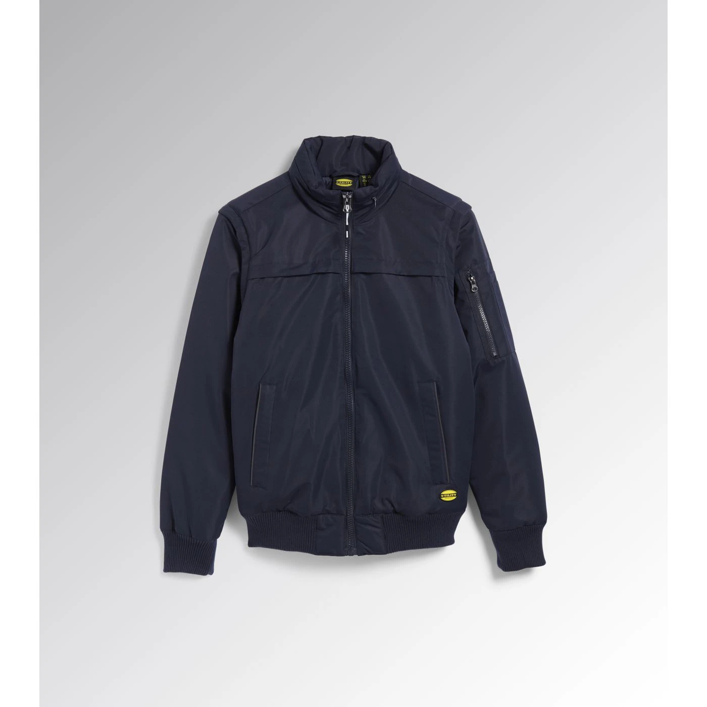 Padded bomber jacket with removable sleeves in abrasion-resistant and water-repellent Ottoman polyester fabric, nylon service hood, soft lining for a warm feel, removable badge holder in chest pocket, reflective details on the back and pocket trim for improved visibility, left side left ree for customisation, ribbed hem and cuffs for greater comfort, cartridge pocket on left sleeve, inside pocket.