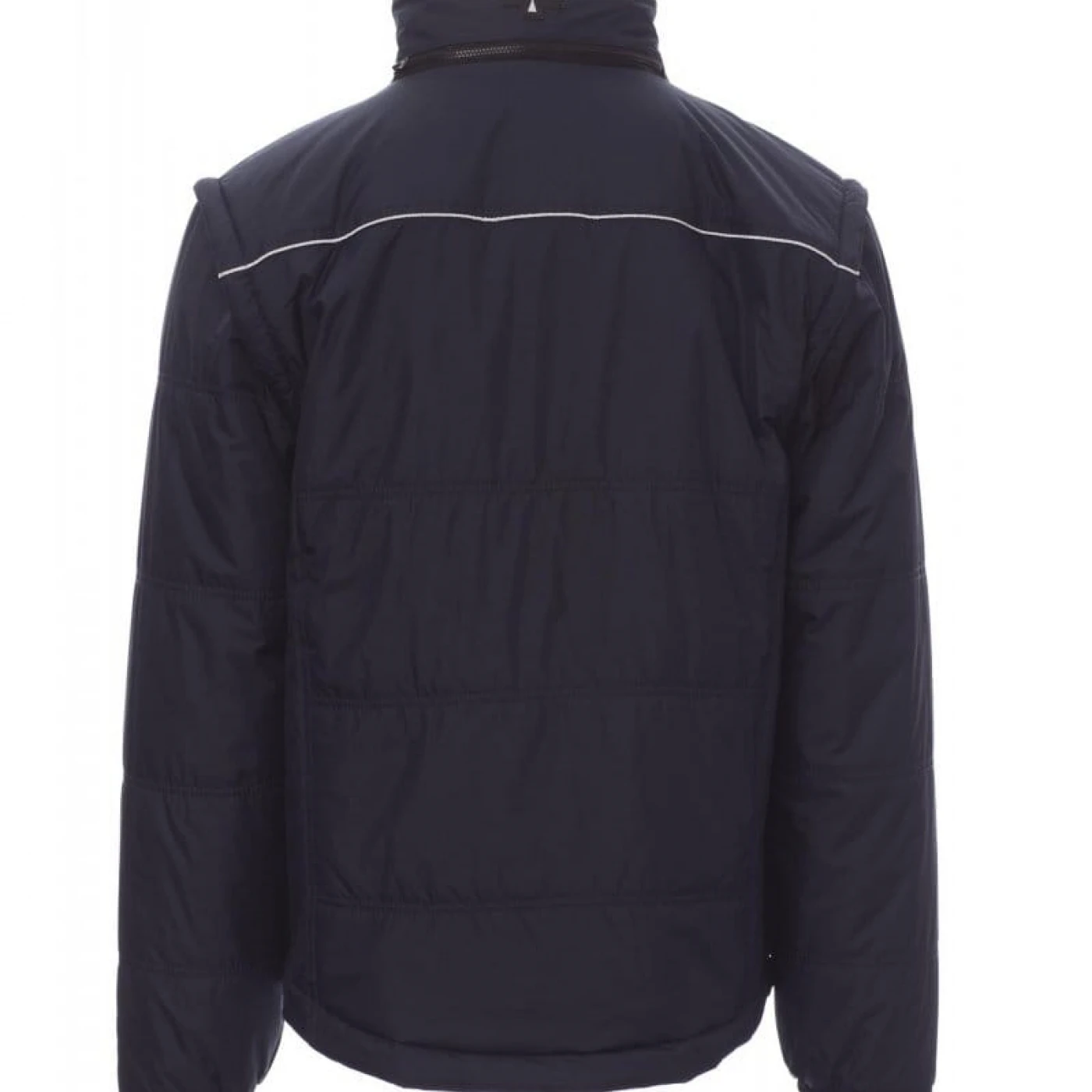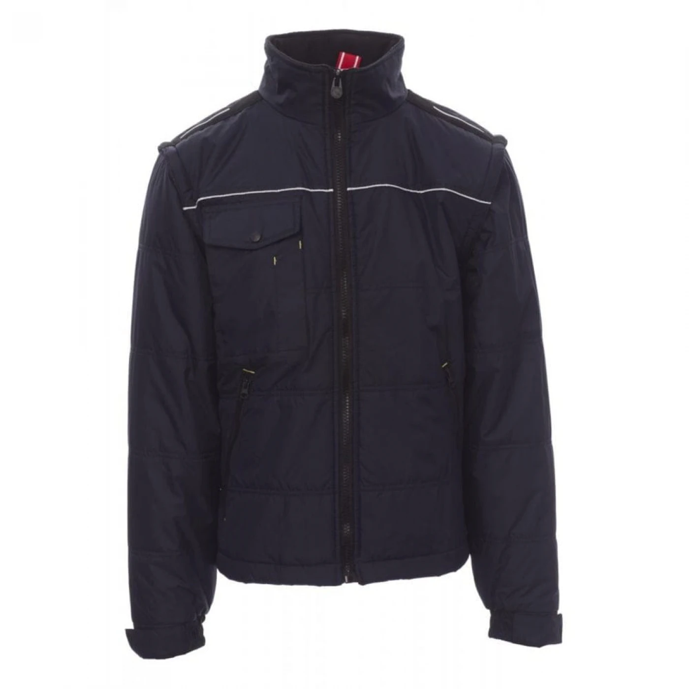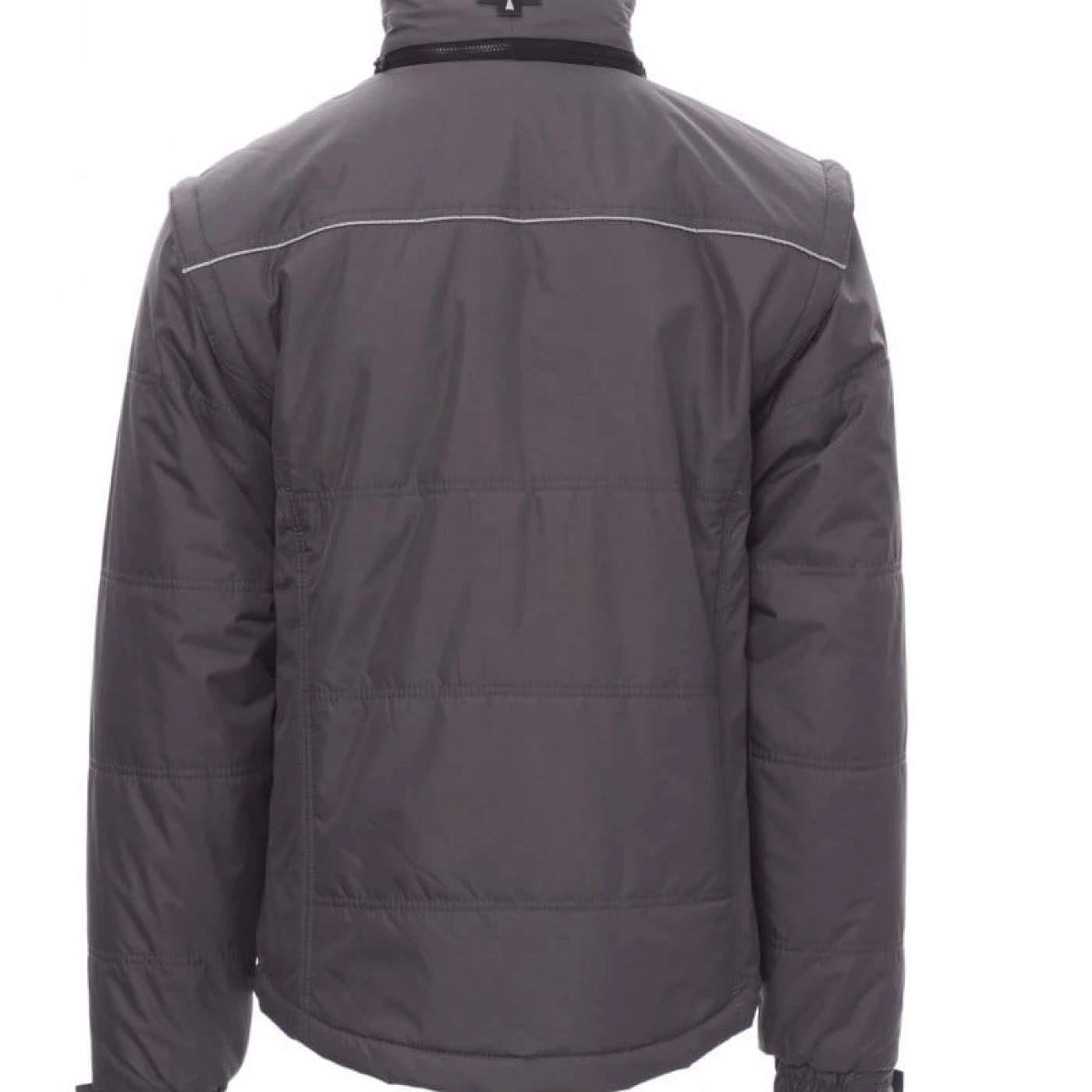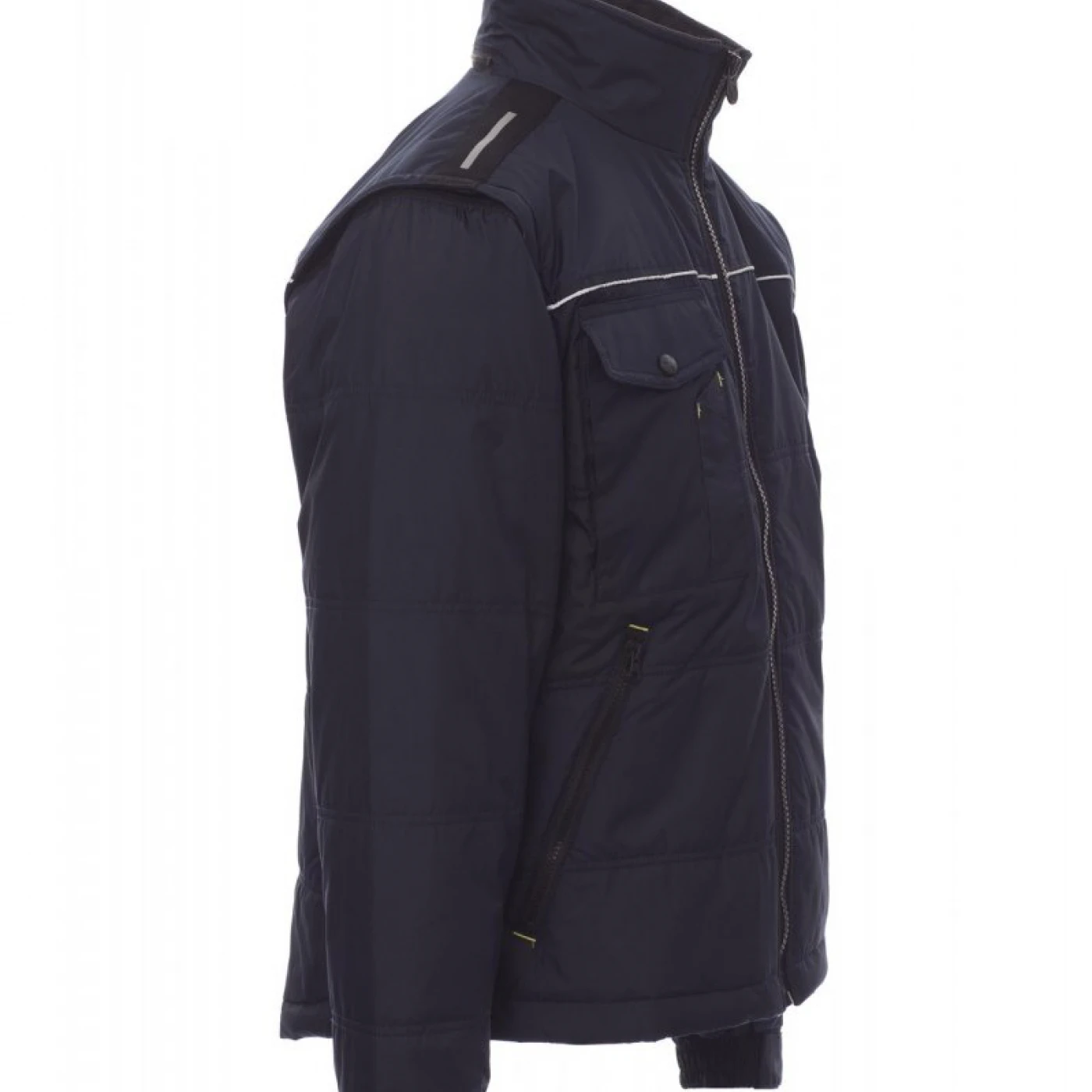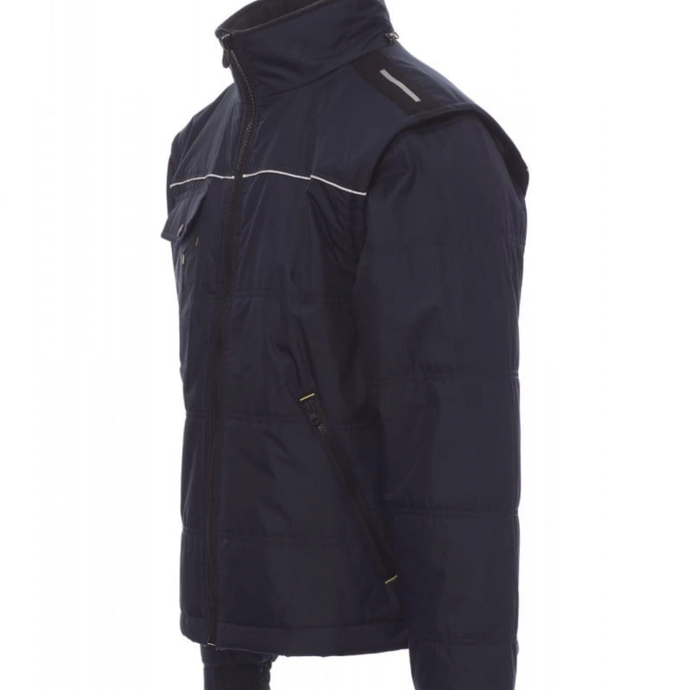 Jacheta pentru bărbați cu mâneci detașabile si reglabile cu velcro. Gluga este pliabila in guler, cu partea interioara a gulerului din fleece. Inchidere frontala cu fermoar de 8 mm din plastic, cu cursor metalic, două buzunare exterioare laterale cu fermoar si un buzunar la piept, inchis cu clapeta. Materialul exterior este fabricat dintr-o tesatura impermeabila si rezistenta la vant. Interiorul jachetei este matlasat, captusit cu materiale de inalta densitate. Umerii sunt evidentiati de un material contrastant, cu benzi reflectorizante. Pe piept si spate are dungi reflectorizante. \n
