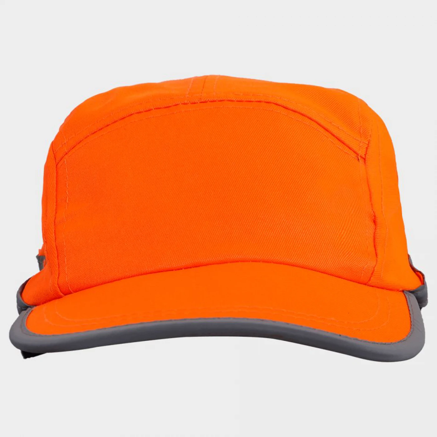 Șapcă portocalie cu vizor, cu vizibilitate ridicată, concepută pentru activități în aer liber și condiții de iluminare redusă.