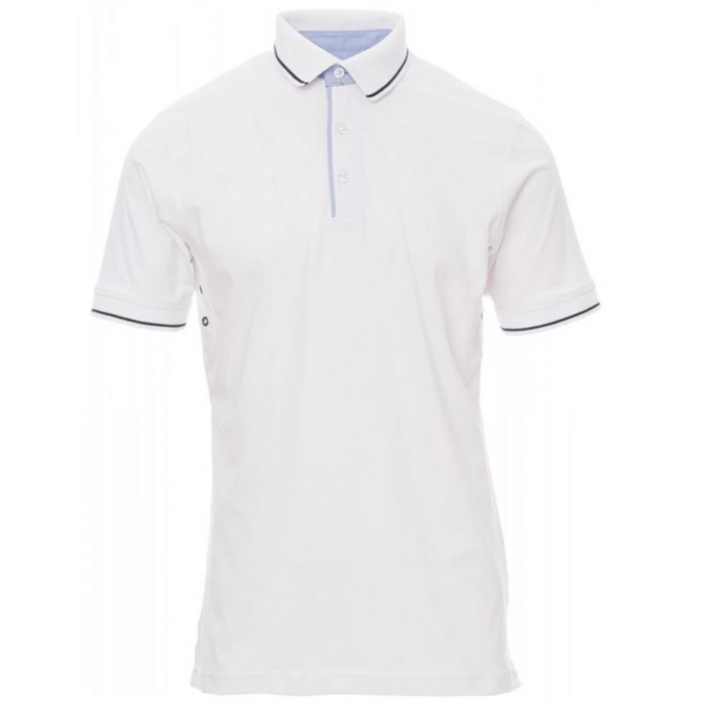 Tricou polo pentru bărbați cu mânecă scurtă, cu 3 nasturi albi, partea interioară a gulerului, banda și micile fante laterale din oxford bleu, guler și margine mânecă elastice cu profil contrastant, ochiuri sub braț, mici fante laterale cu cusături întărite, bandă de întăritură laterală, cusături stretch, întăritură modelată în partea din spate a gulerului.