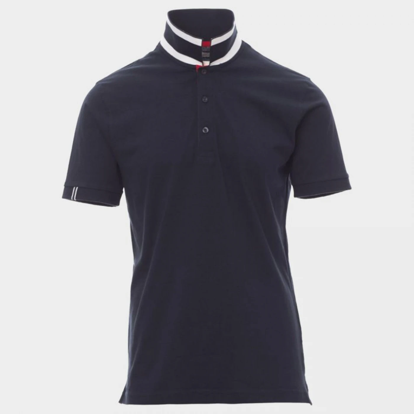 Tricou polo pentru bărbați cu mânecă scurtă, cu 3 nasturi în aceeași culoare cu tricoul și efect perlat, guler pe o parte în culoarea tricoului, iar pe cealaltă parte cu o bandă în culoare contrastantă vizibilă atunci când gulerul este ridicat. Banda interioară pe care sunt aplicați nasturii de la nivelul gulerului și micile fante laterale sunt în culoare contrastantă, mânecă cu margine elastică, cusăturile gulerului sunt acoperite cu bandă în nuanță contrastantă, bandă de întăritură laterală, întăritură modelată în partea din spate a gulerului.