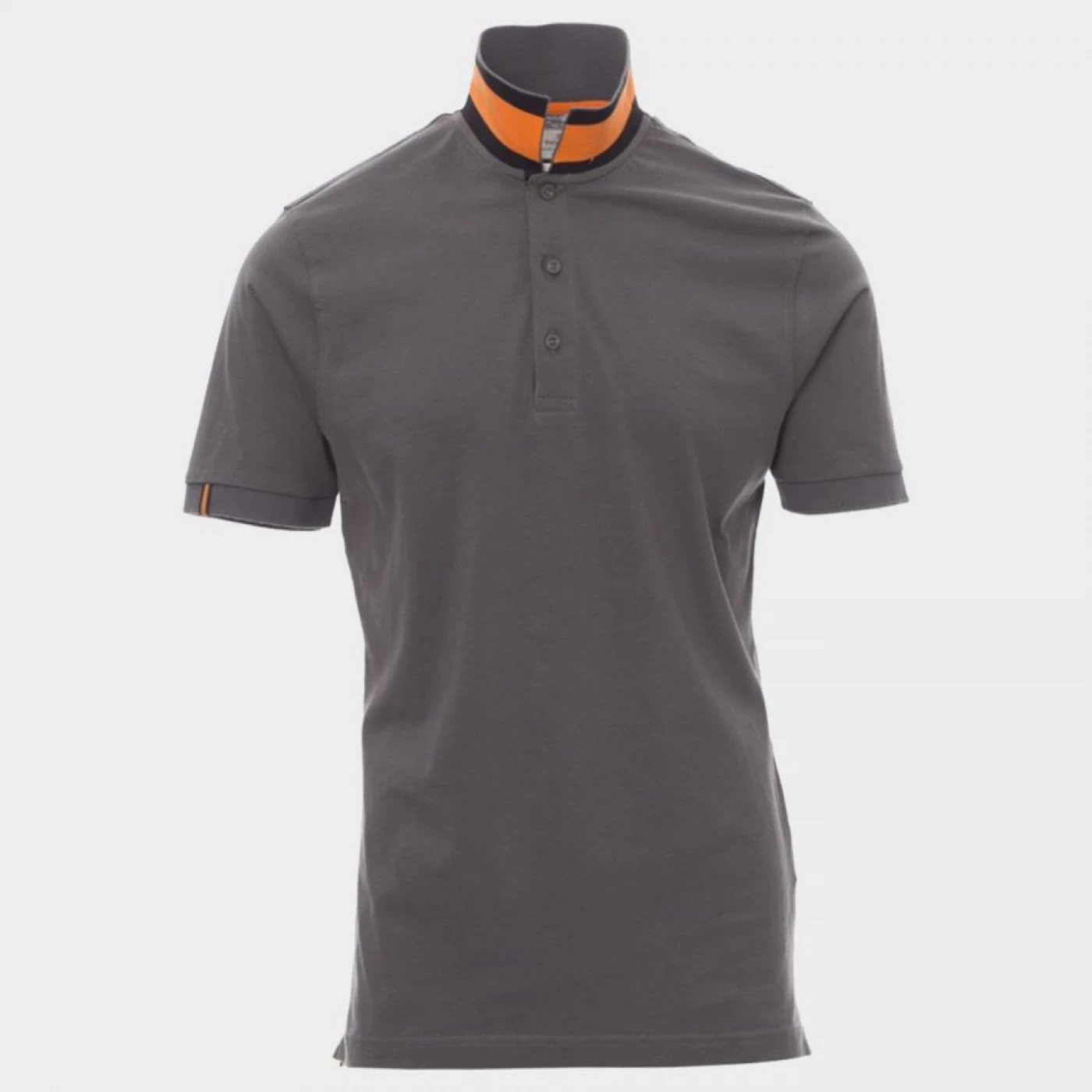 Tricou polo pentru bărbați cu mânecă scurtă, cu 3 nasturi în aceeași culoare cu tricoul și efect perlat, guler pe o parte în culoarea tricoului, iar pe cealaltă parte cu o bandă în culoare contrastantă vizibilă atunci când gulerul este ridicat. Banda interioară pe care sunt aplicați nasturii de la nivelul gulerului și micile fante laterale sunt în culoare contrastantă, mânecă cu margine elastică, cusăturile gulerului sunt acoperite cu bandă în nuanță contrastantă, bandă de întăritură laterală, întăritură modelată în partea din spate a gulerului.