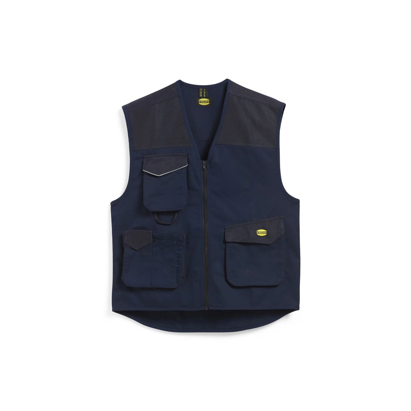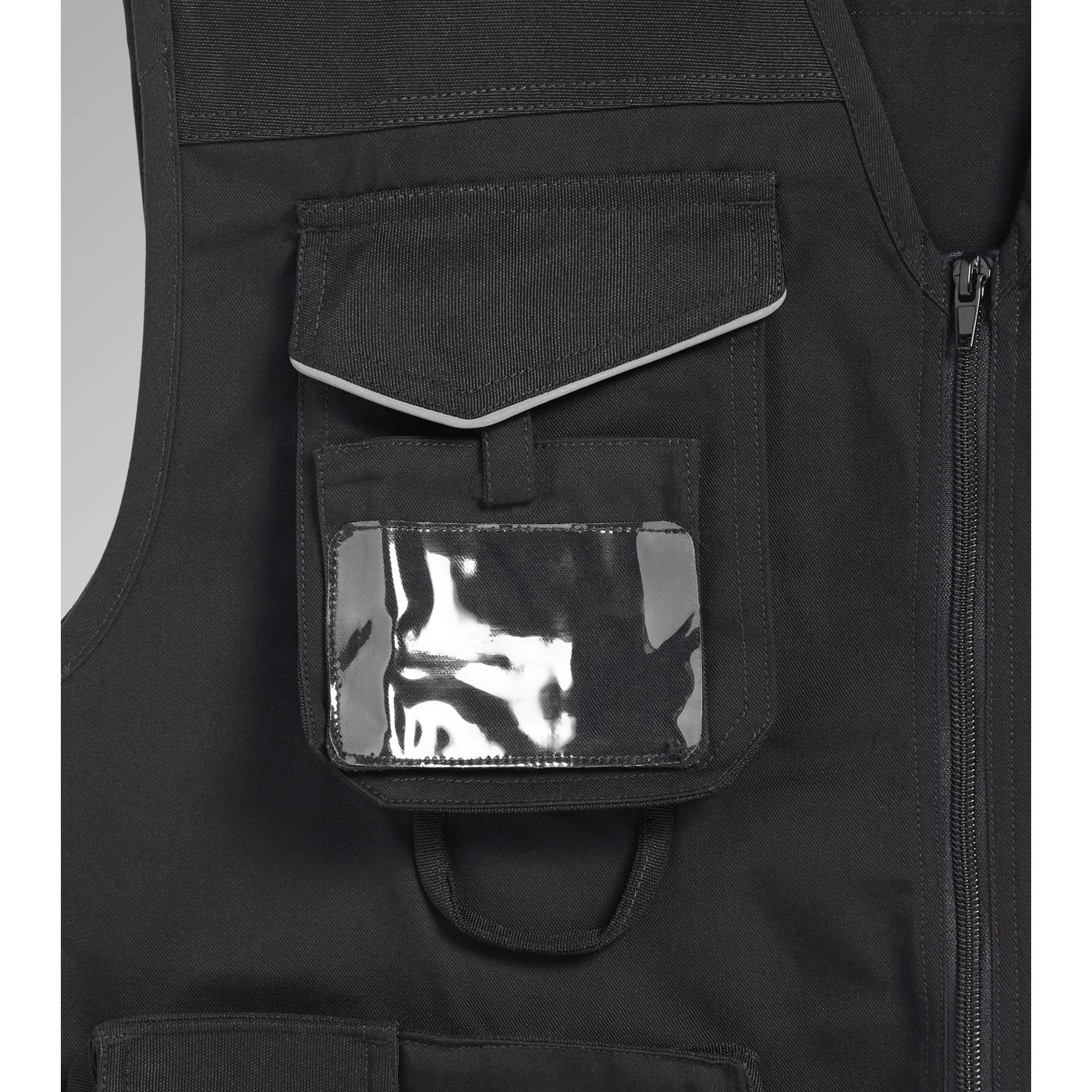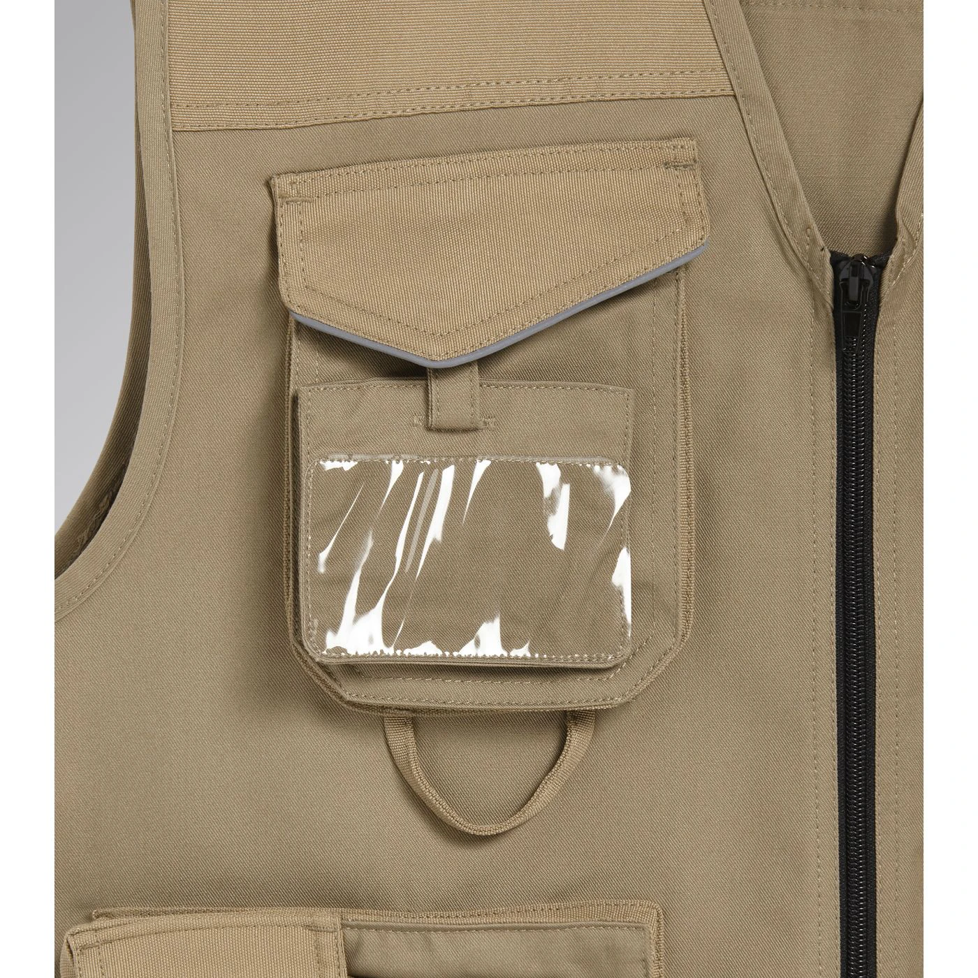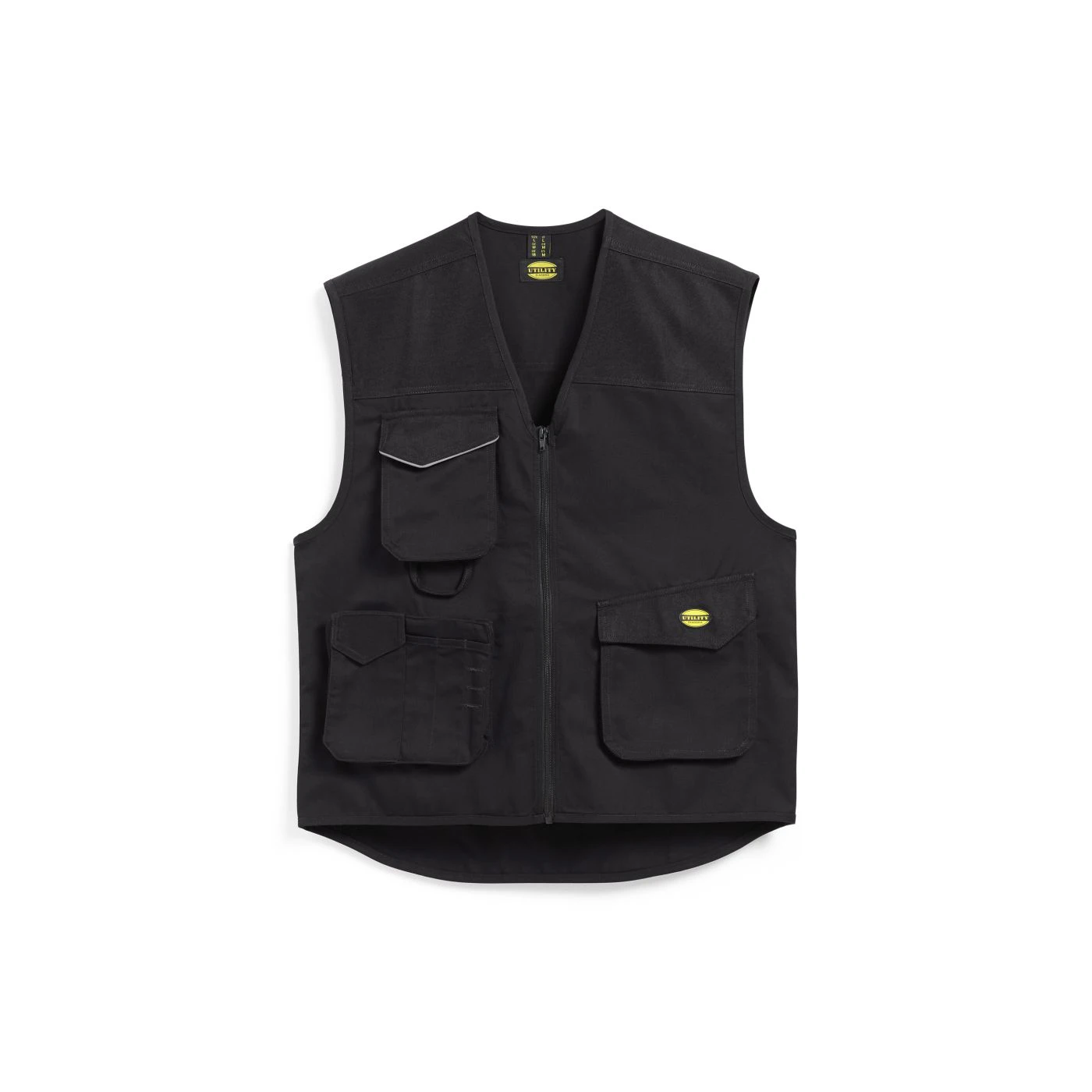 Vest with 3 front pockets, patch tool pockets, reflective details. Double stitching.
