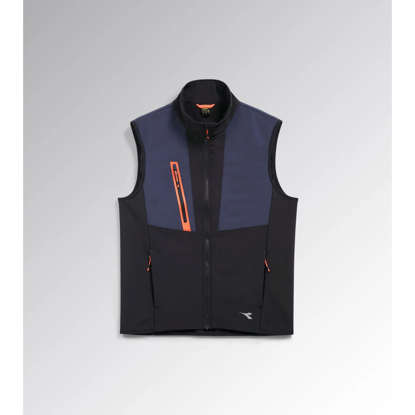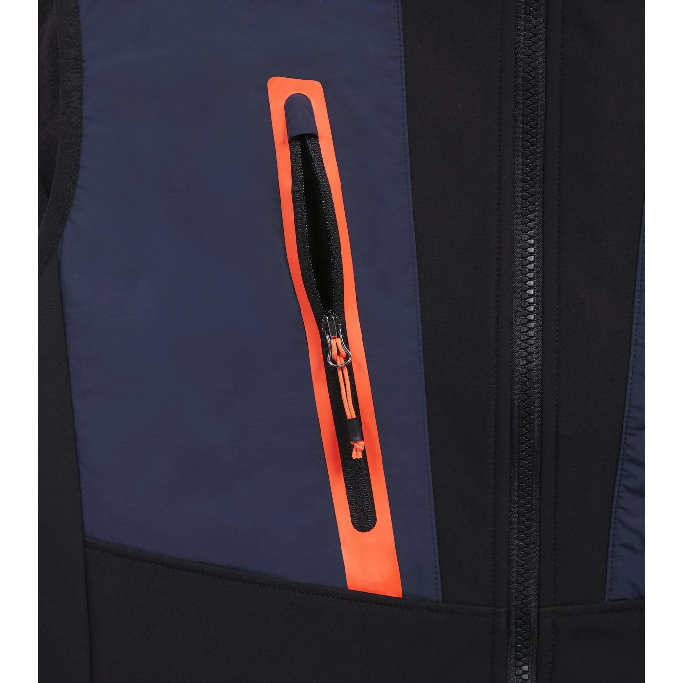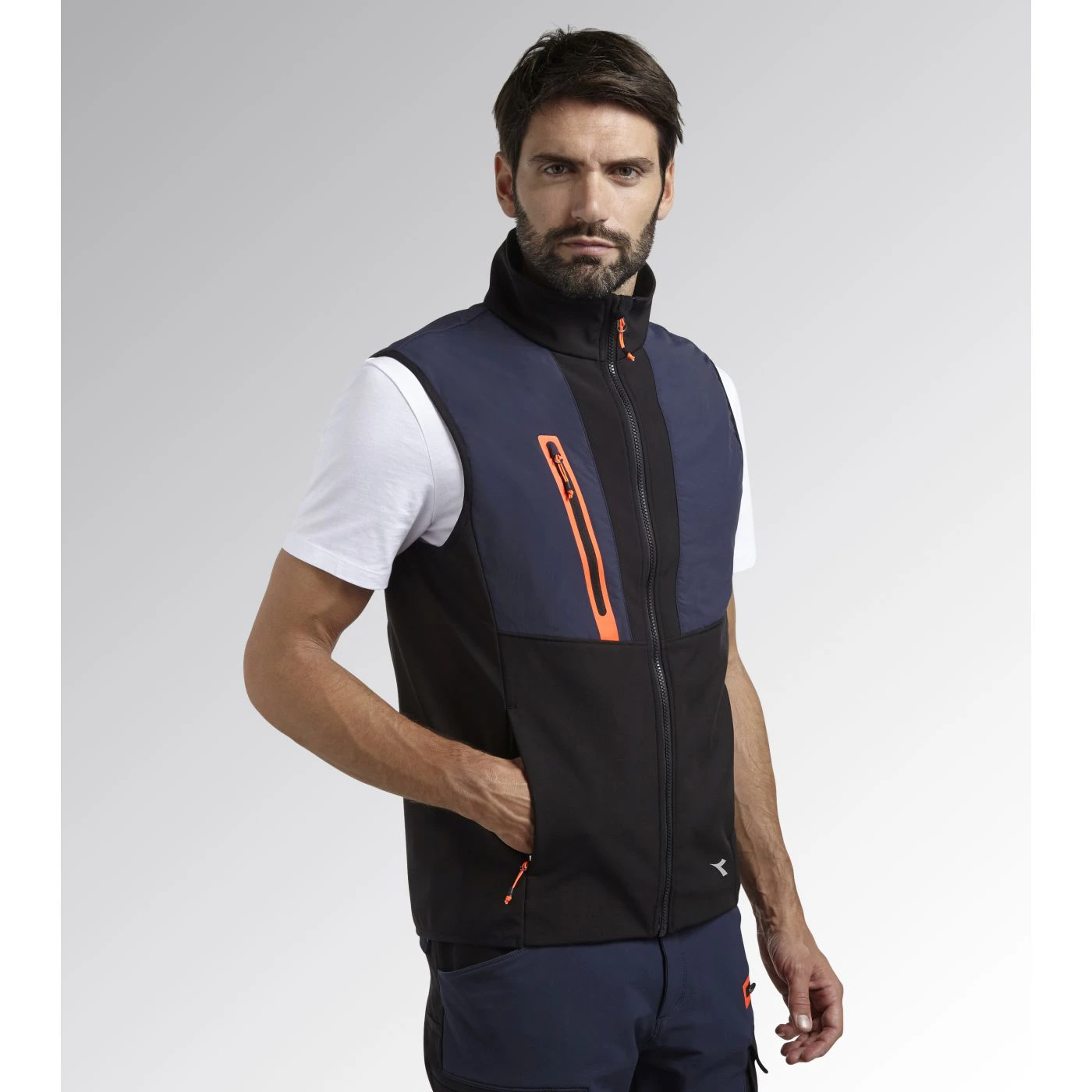 Ergonomic softshell and nylon dual-material vest. Two zipped side pockets and one front pocket with heat-sealed neon tape. Longer at the back for a better fit.