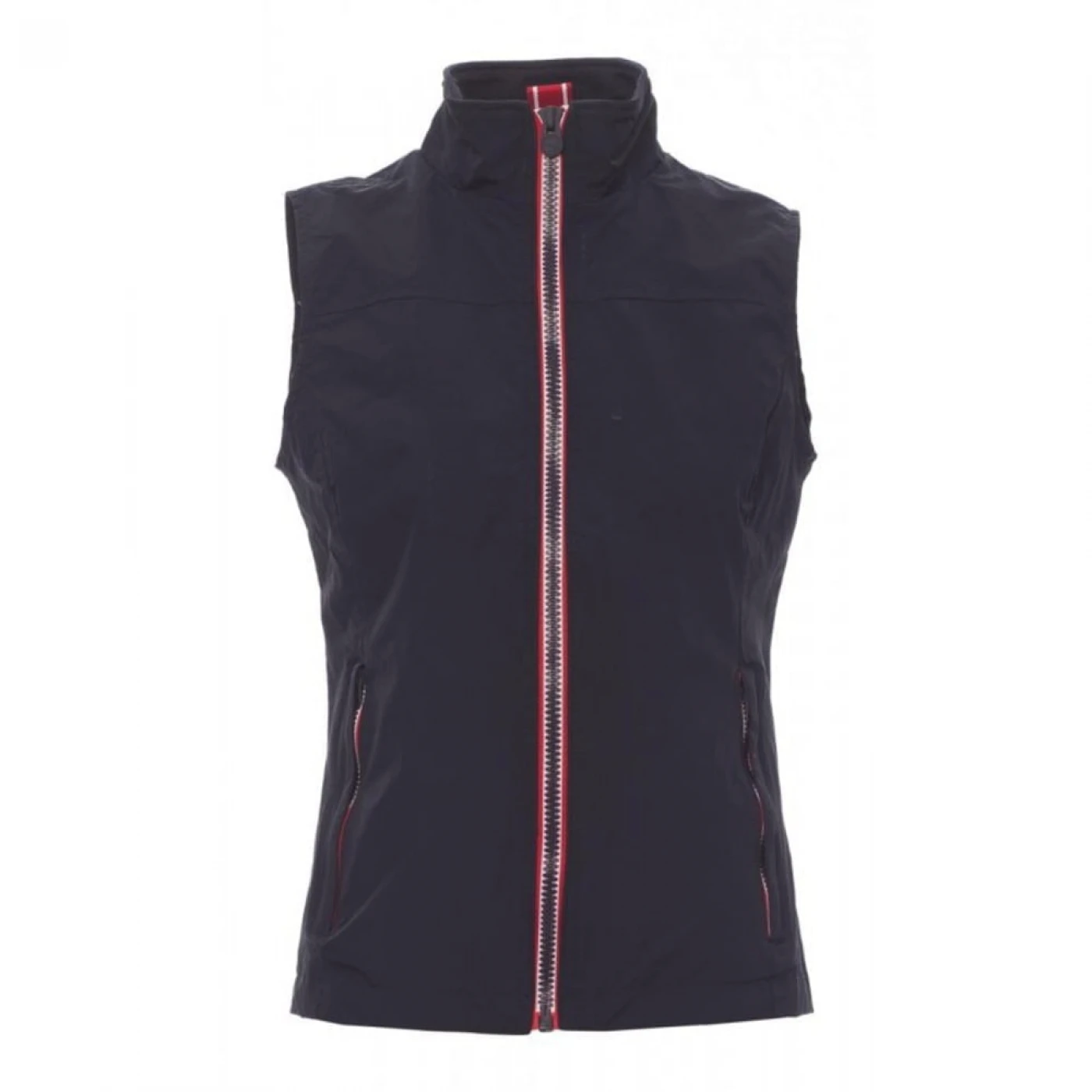 Vestă pentru femei, usoara si confortabila. Închiderea se face integral cu un fermoar din plastic de 8mm, de culoare contrastanta. Este echipata cu două buzunare exterioare cu fermoar acoperit. La interior vesta are o căptușeală tip plasă, cu fermoar in partea din spate care faciliteaza imprimarea si broderia. \n