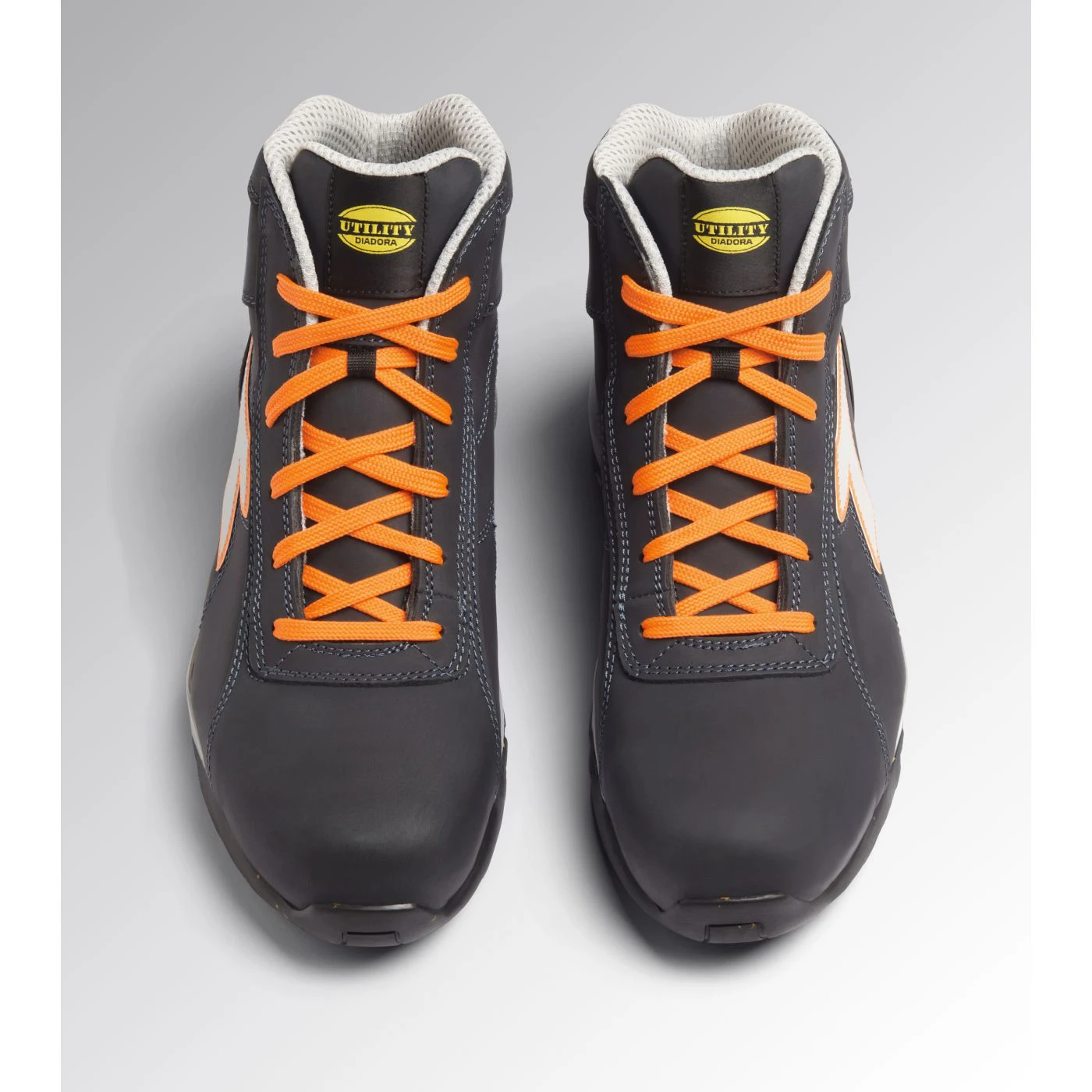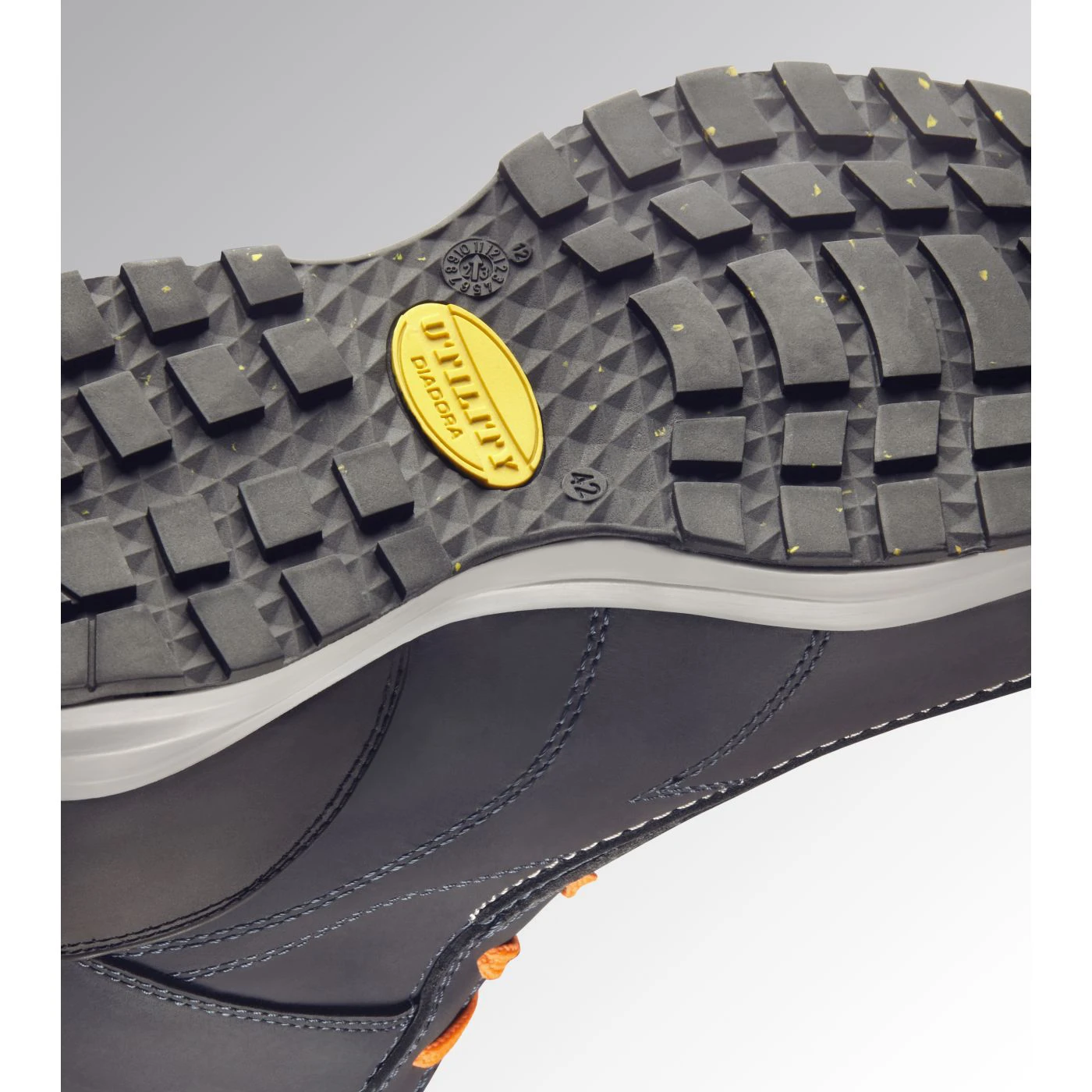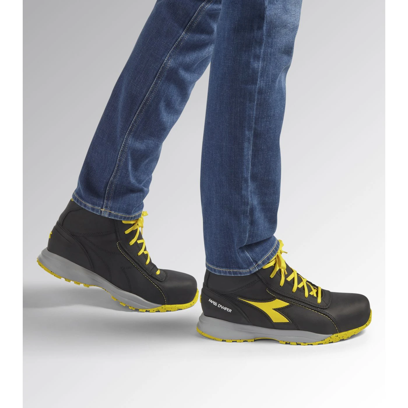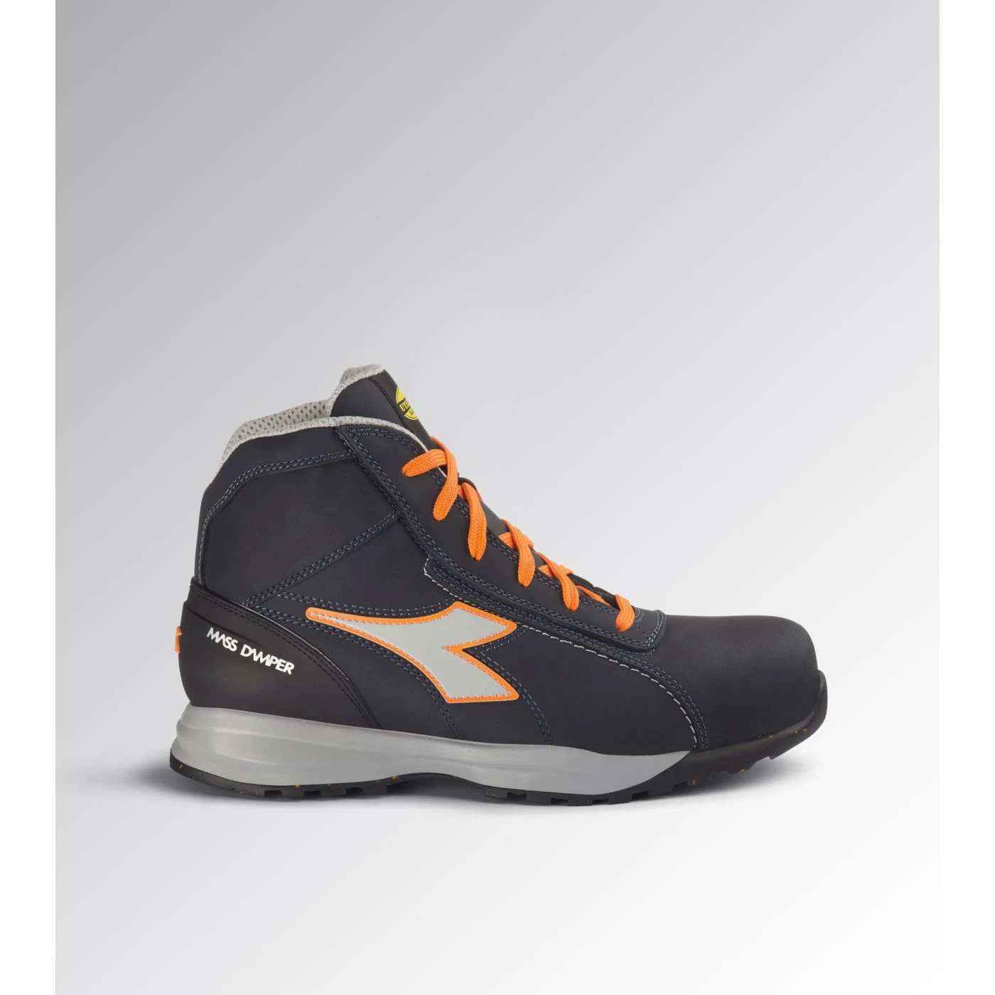 Water-repellent mid-cut S3S safety shoes in cowhide nubuck. Ergonomic TPU heel support. 200J aluminium toe cap. Anti-puncture K-SOLE insert. Width 11. Mass Damper System technology. Air mesh lining with a non-slip microfibre insert. Removable ergonomic insole in PU foam and activated carbon.