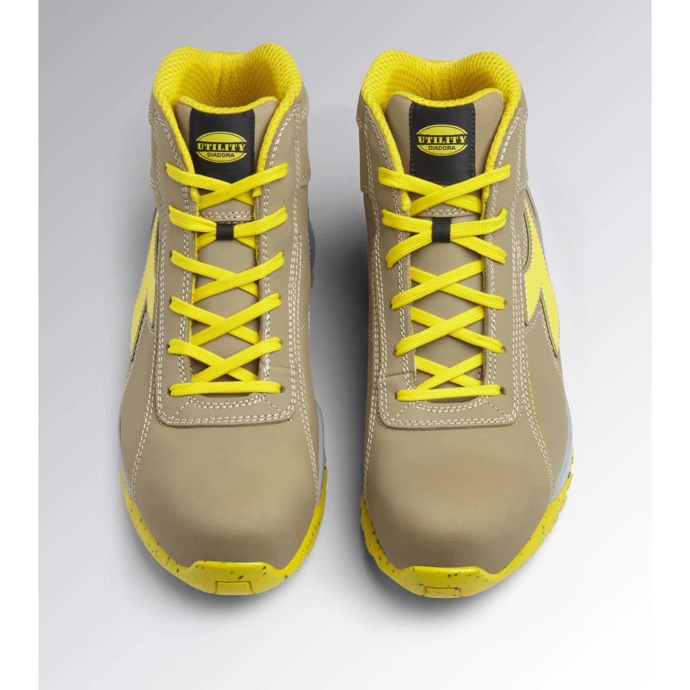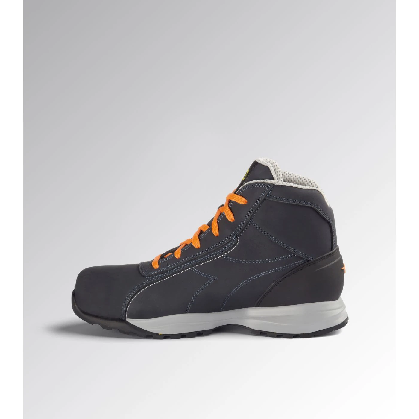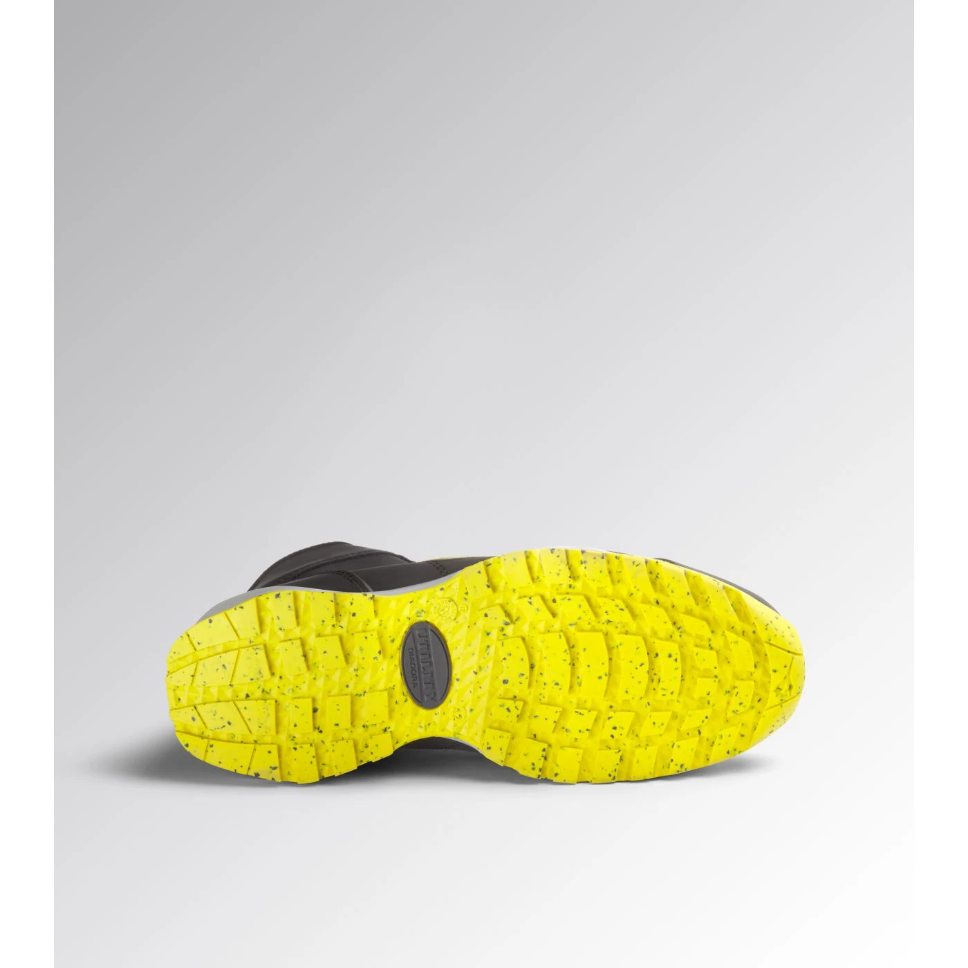 Water-repellent mid-cut S3S safety shoes in cowhide nubuck. Ergonomic TPU heel support. 200J aluminium toe cap. Anti-puncture K-SOLE insert. Width 11. Mass Damper System technology. Air mesh lining with a non-slip microfibre insert. Removable ergonomic insole in PU foam and activated carbon.