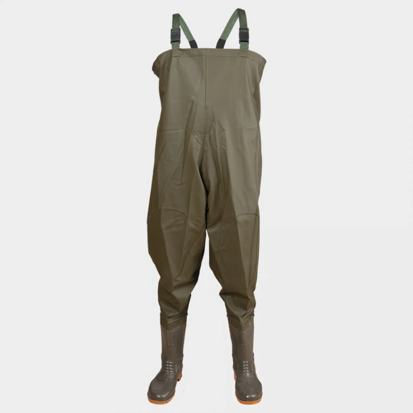 Salopetă de pescuit confecționată din material PVC impermeabil, oferind protecție la lucrul în medii umede.