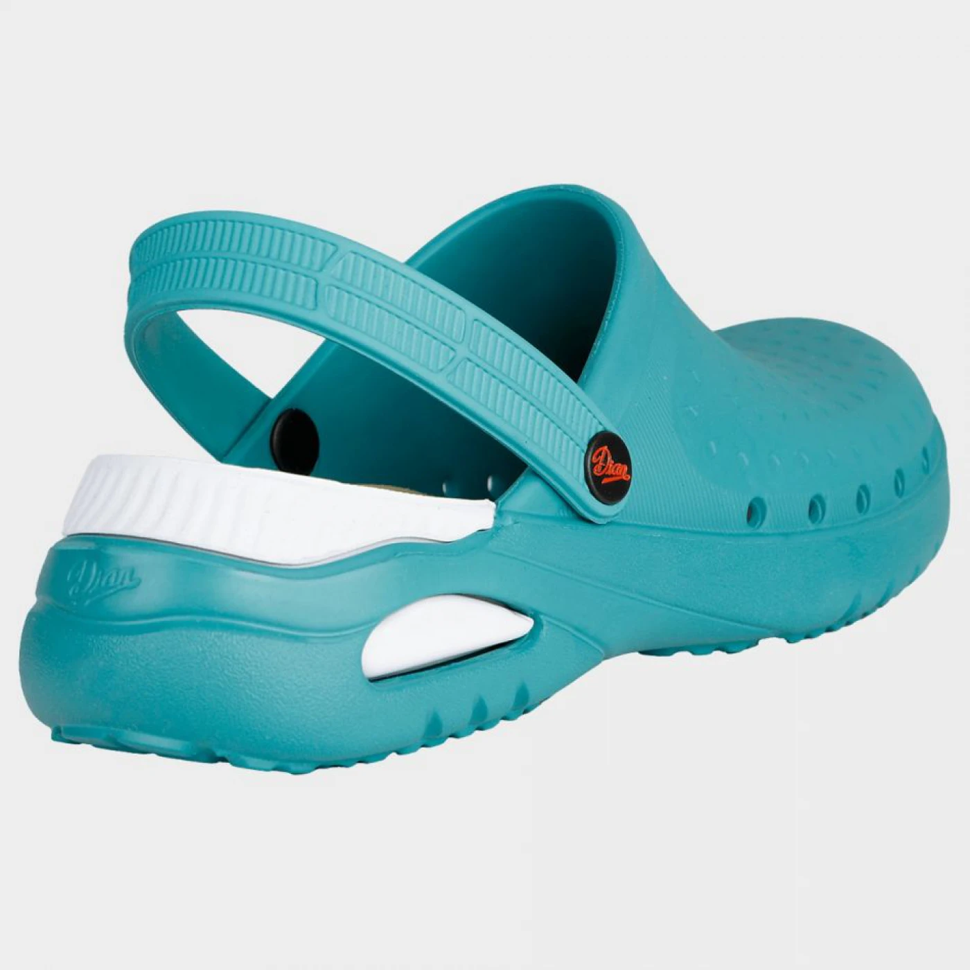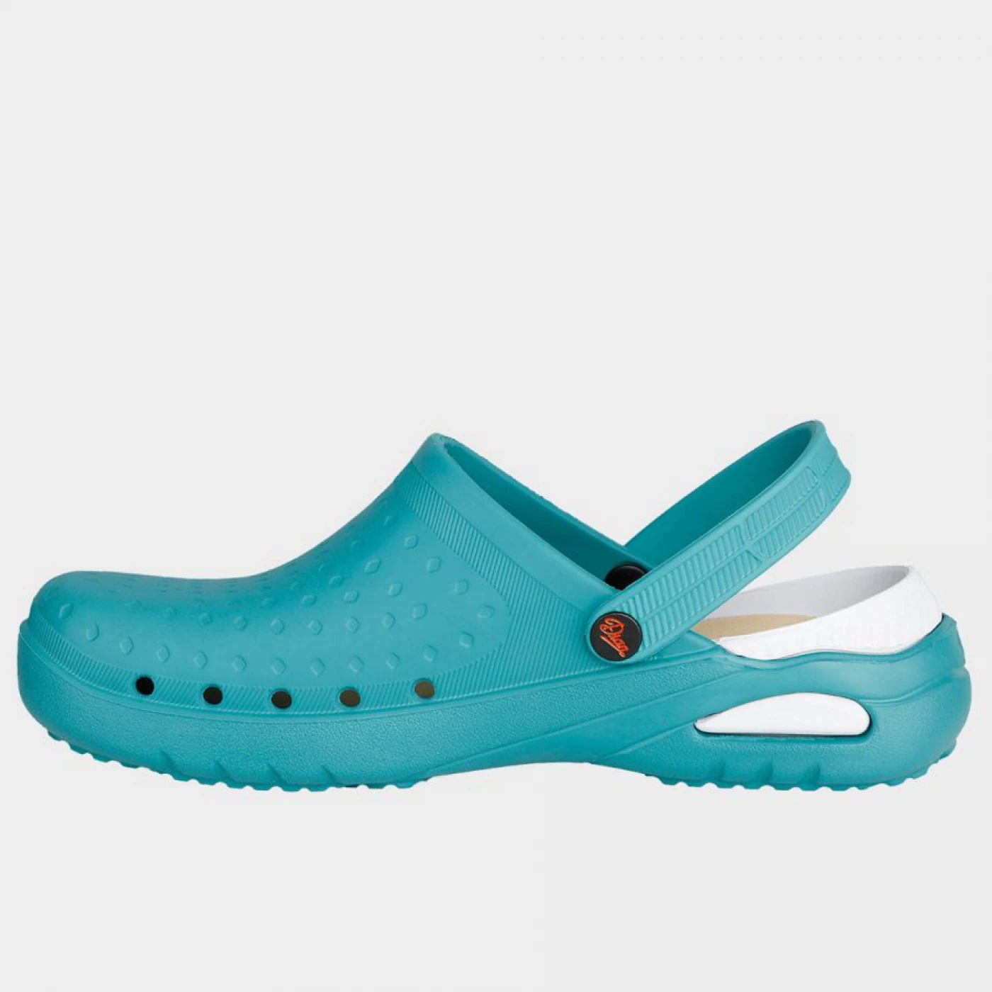 Saboți EVA ultraușori, antibacterieni, fără latex, anatomici și antiderapanți. Lavabili până la 40°C. Curea din spate pliabilă, orificii laterale pentru a facilita transpirația, curățarea și pentru a evita pătrunderea directă a lichidului în saboți. Talpă detașabilă din PU cu proprietăți excelente de recuperare a energiei la mers căptușită cu material D’DRY®.