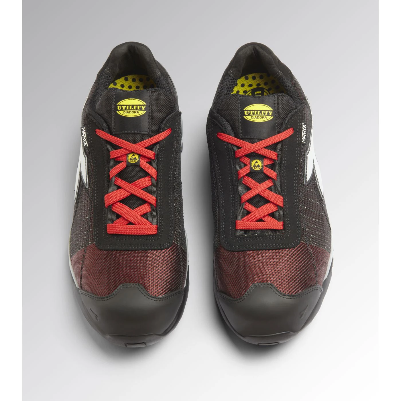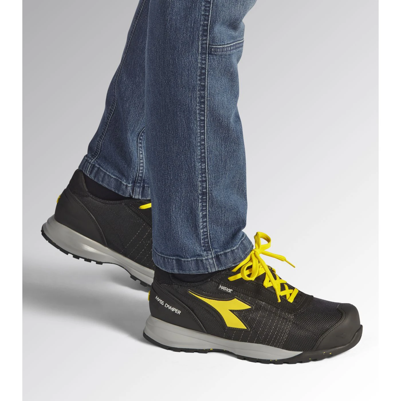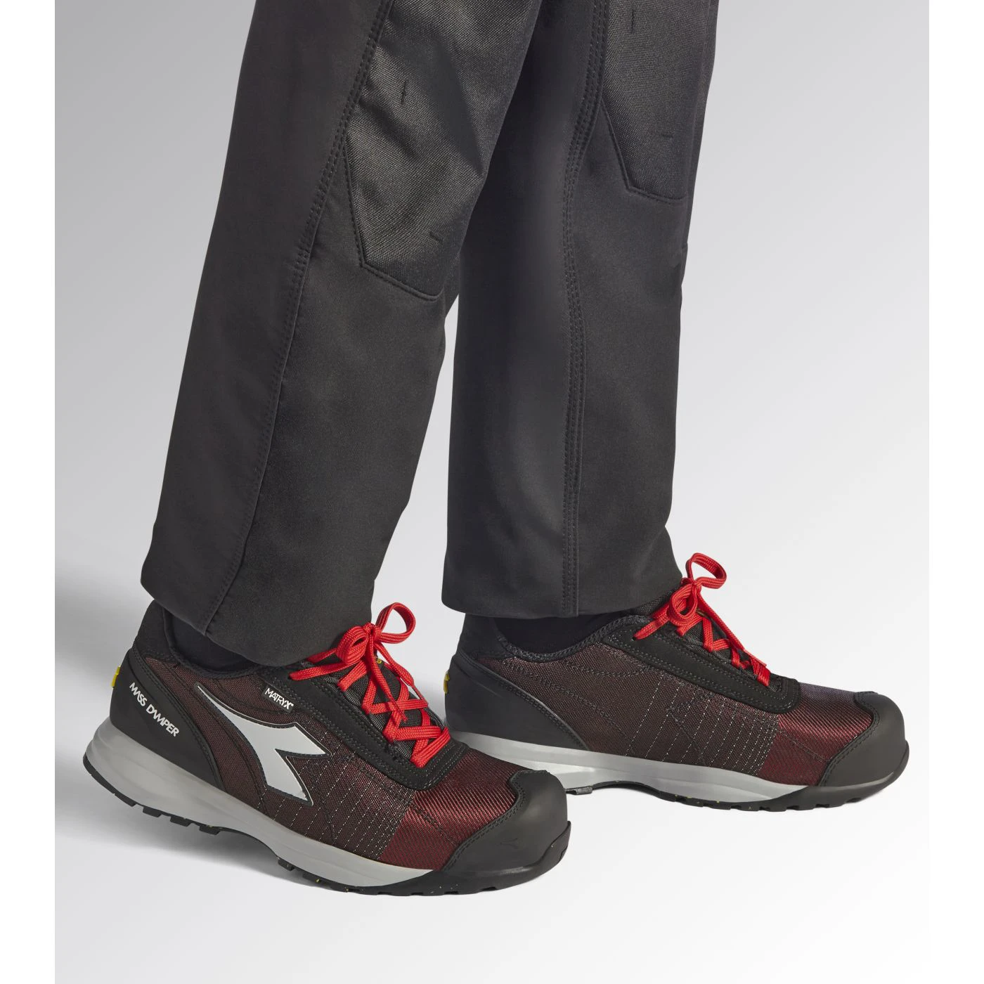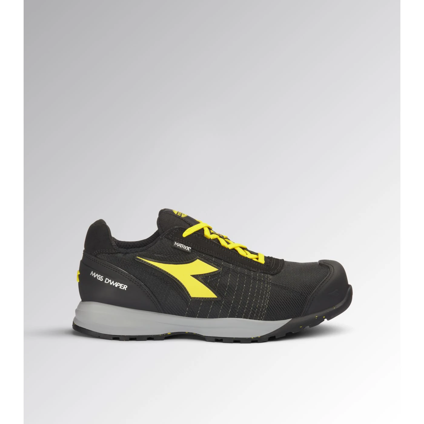Low-cut S1PS safety shoes in breathable and abrasion-resistant multi-fibre Matryx technical fabric. TPU toe cap and ergonomic heel support. 200J aluminium toe cap. Anti-puncture K SOLE insert. Width 11. Mass Damper System cushioning technology. Air mesh lining with a non-slip microfibre insert. Removable ergonomic antistatic insole in recycled open cell PU foam that is breathable thanks to activated carbon. ESD.