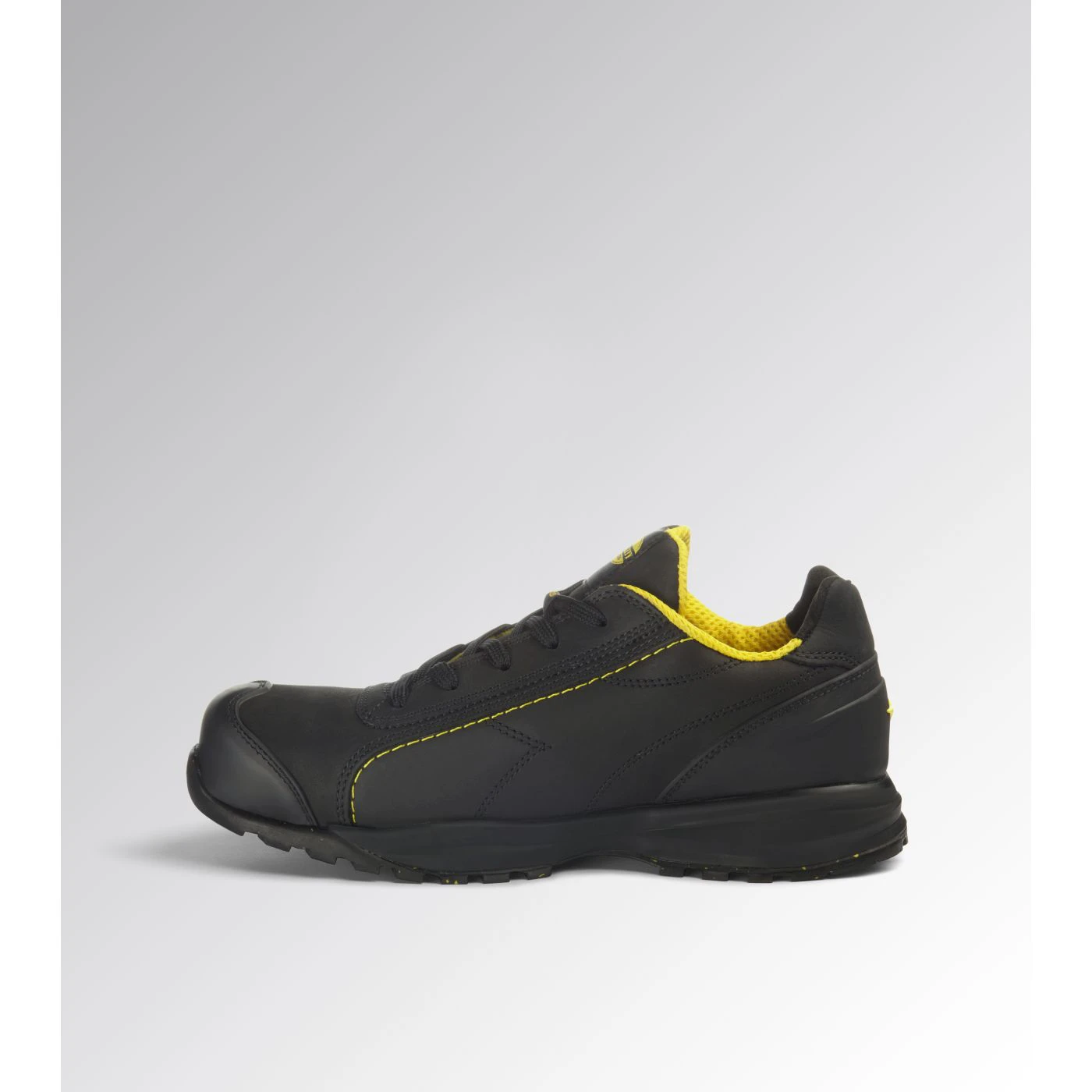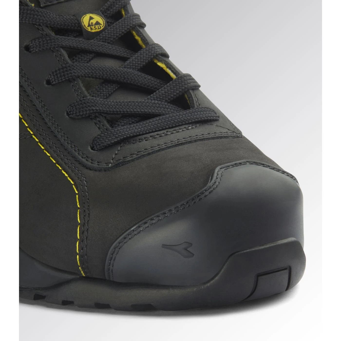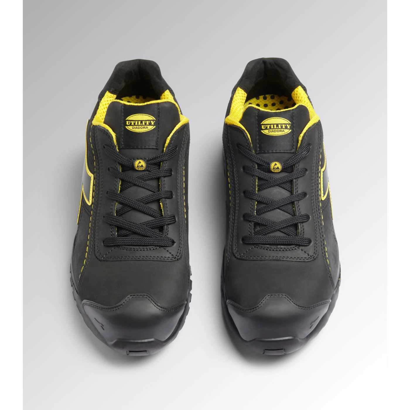 Water-repellent low-cut S3S safety shoes in cowhide nubuck. TPU toe cap and ergonomic heel support. 200J aluminium toe cap. Anti-puncture K-SOLE insert. Width 11. Mass Damper System technology. Air mesh lining with a non-slip microfibre insert. Removable ergonomic insole in PU foam and activated carbon. ESD.
