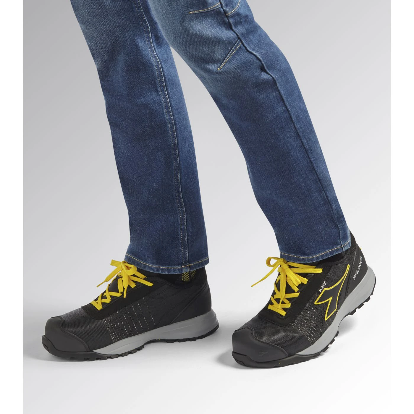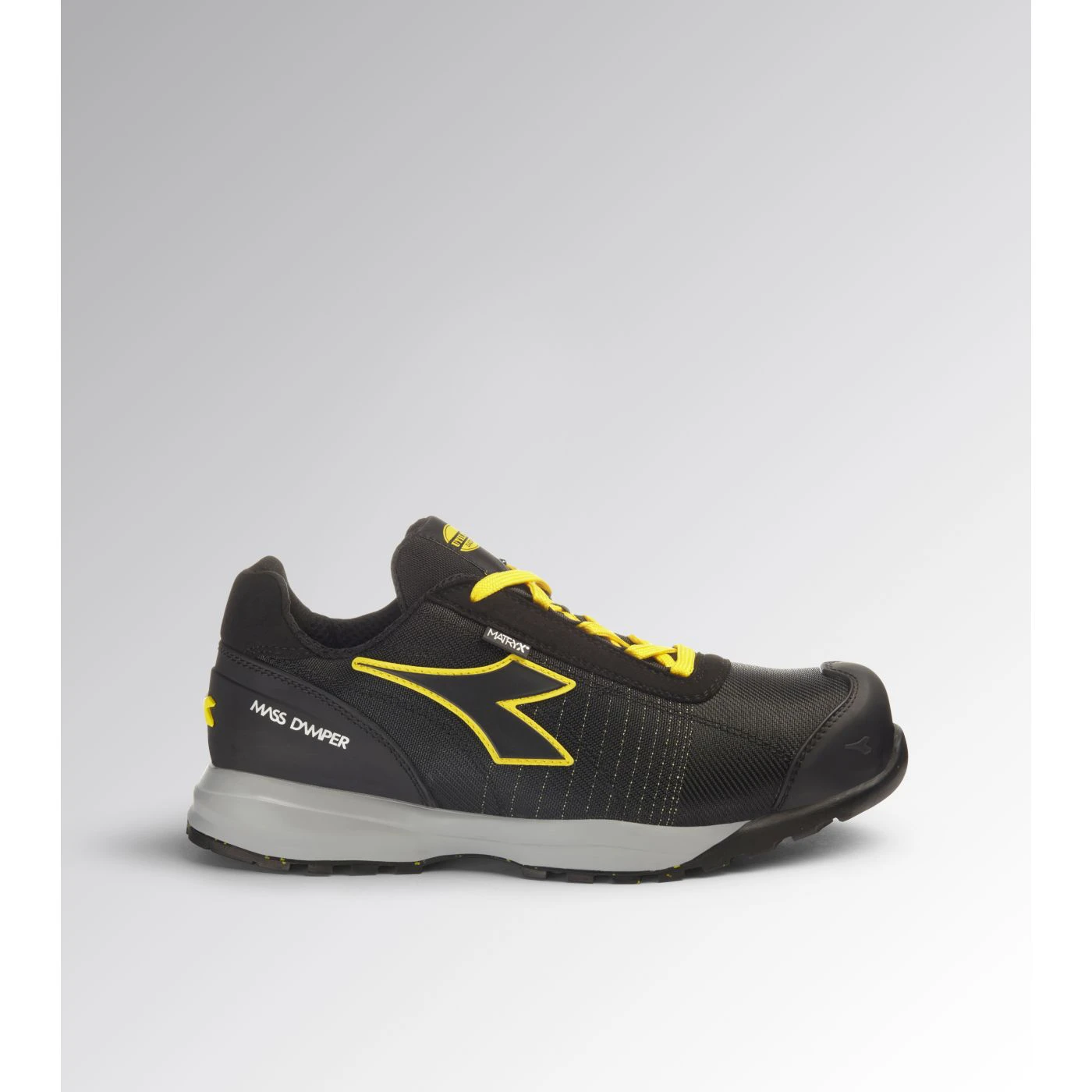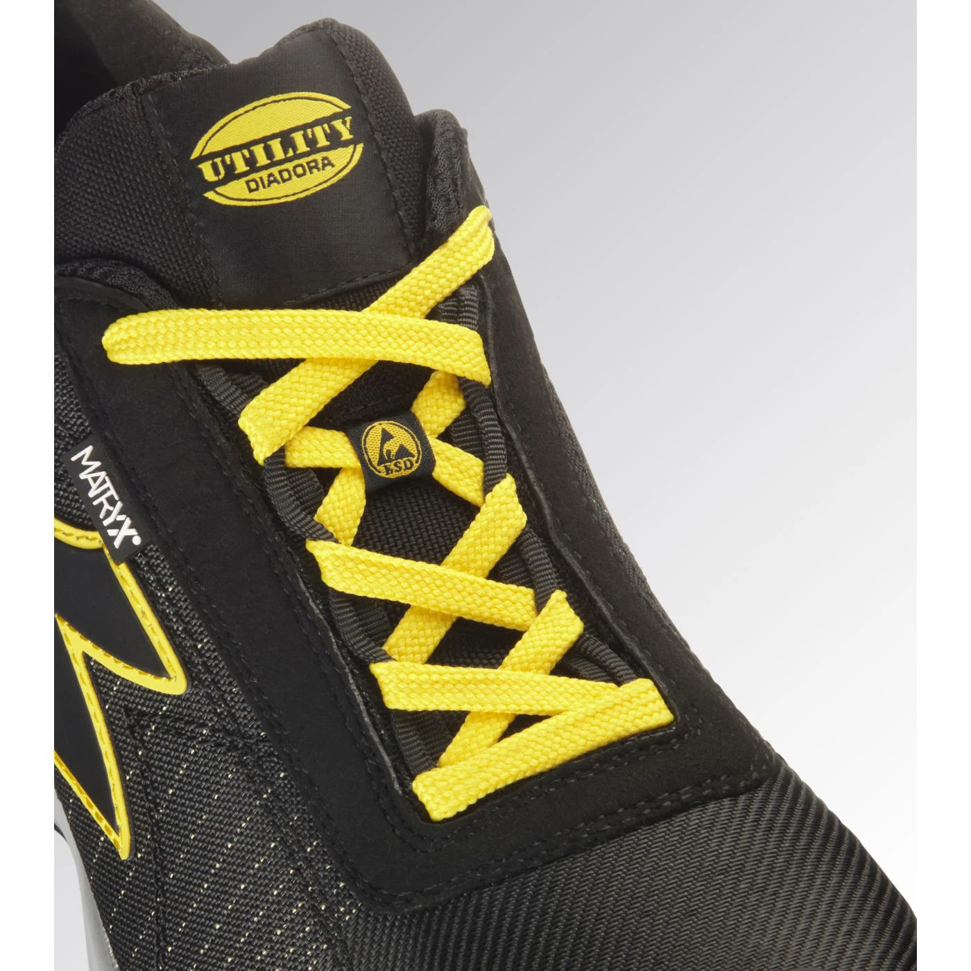 Water-repellent low-cut S3S safety shoes in breathable, abrasion-resistant and water-repellent multi-fibre Matryx technical fabric. TPU toe cap and ergonomic heel support. 200J aluminium toe cap. Anti-puncture K SOLE insert. Width 11. Mass Damper System cushioning technology. Air mesh lining with a non-slip microfibre insert. Removable ergonomic antistatic insole in recycled open cell PU foam that is breathable thanks to activated carbon. ESD.