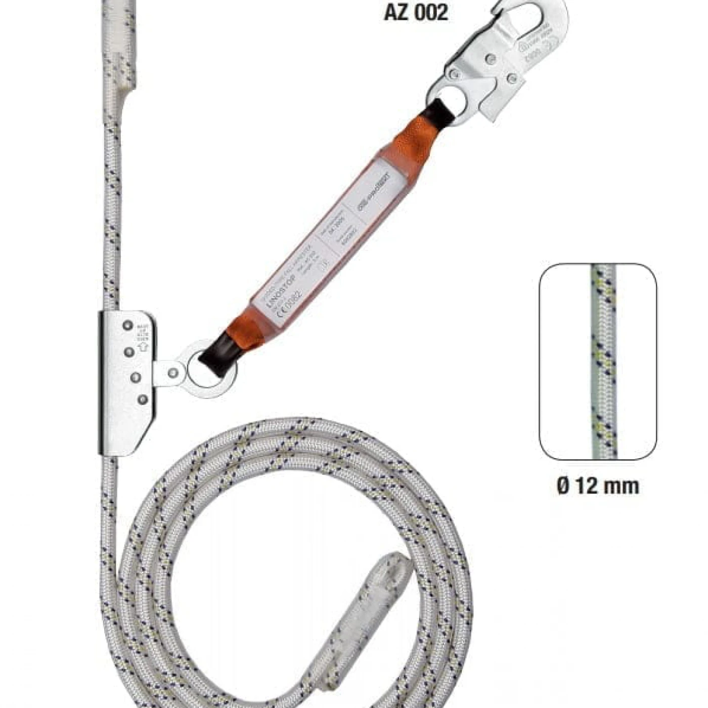 Franghie de legatura, cu opritor de cadere si absorbitor. Franghia este din poliamida cu Ø 12mm iar chinga absorbitoare din poliamida 100% cu latime de 45mm. Prevazuta cu opritor din otel inox. Chinga are un capat incorporat la opritor iar la celalalt este prevazut cu conector din otel galvanizat-AZ002 (deschidere 18mm). \n