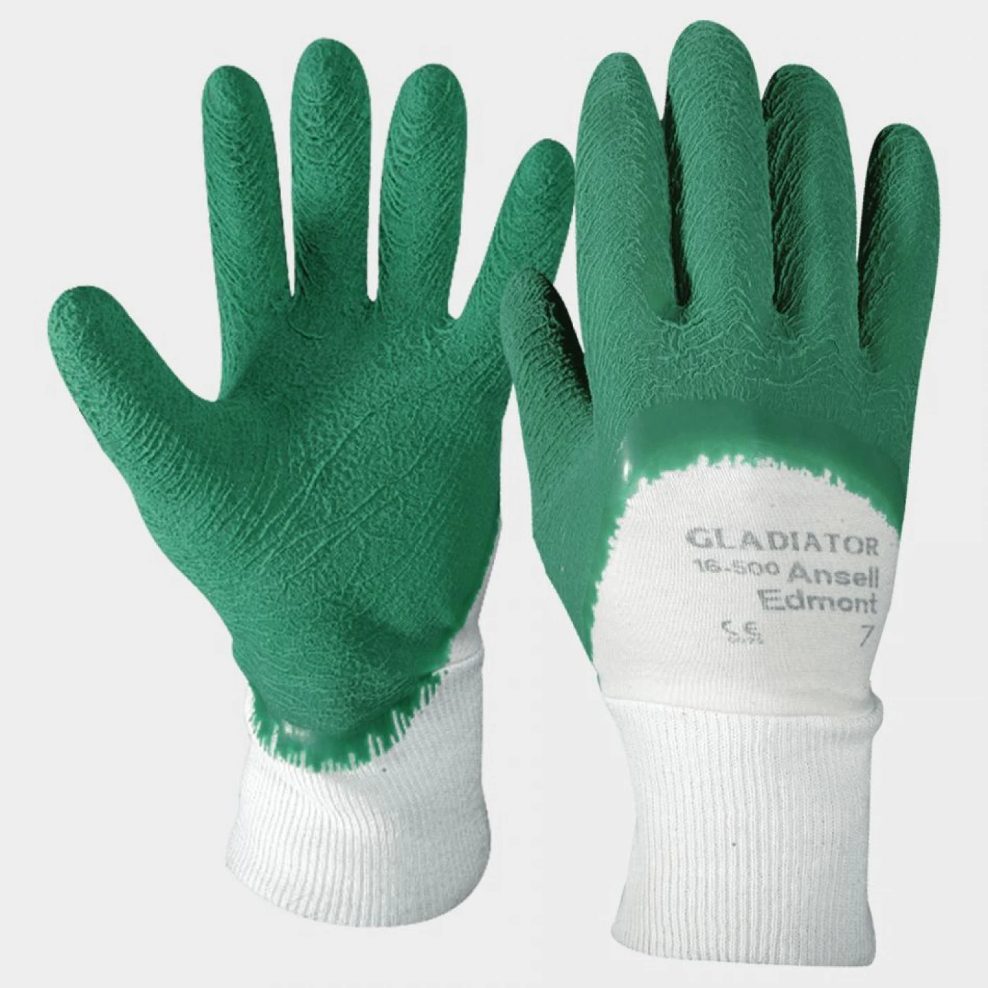 Mănuși marca ANSELL din tricot de bumbac, palmă și degete topite în cauciuc, manșetă elastică. Mănușile respectă standardele europene: