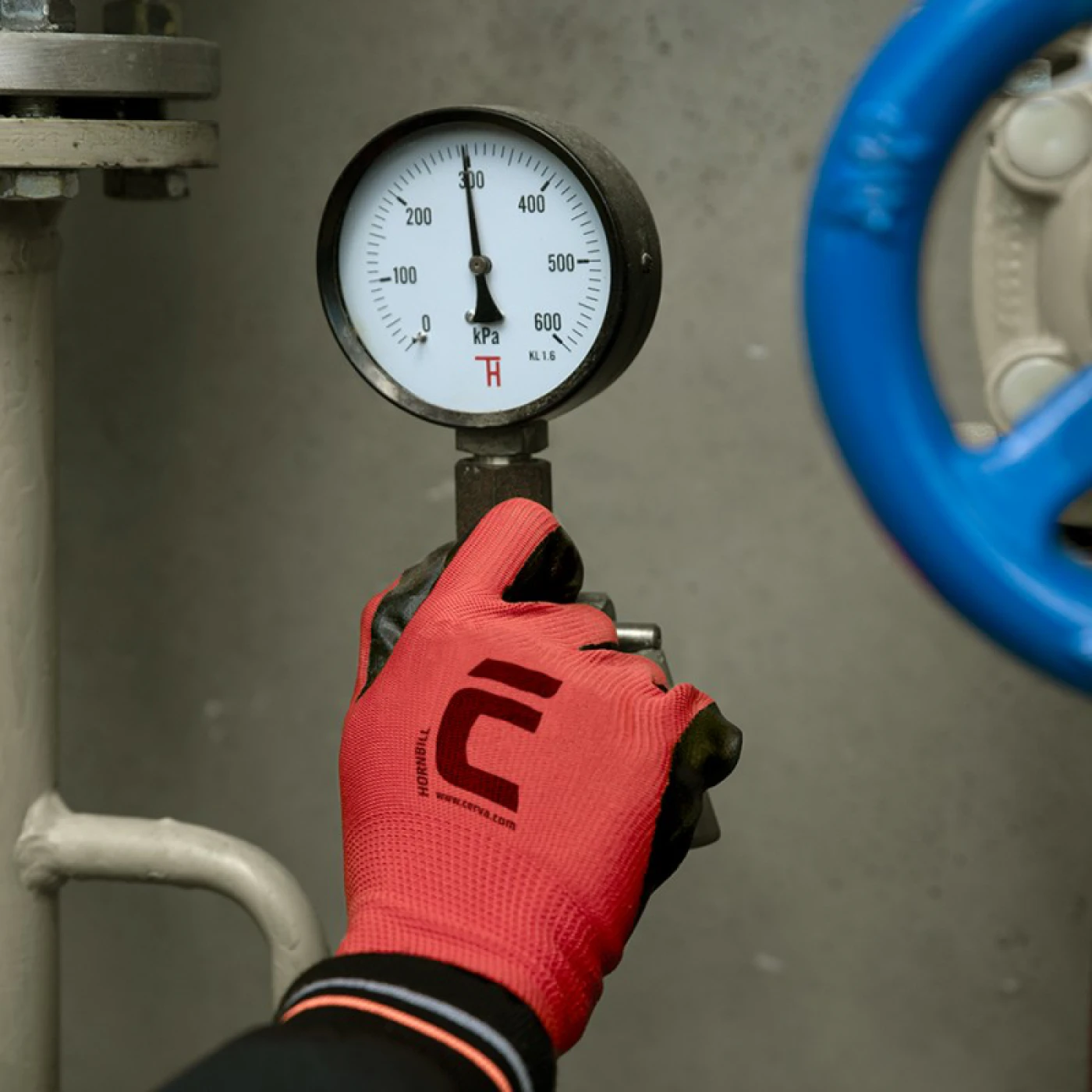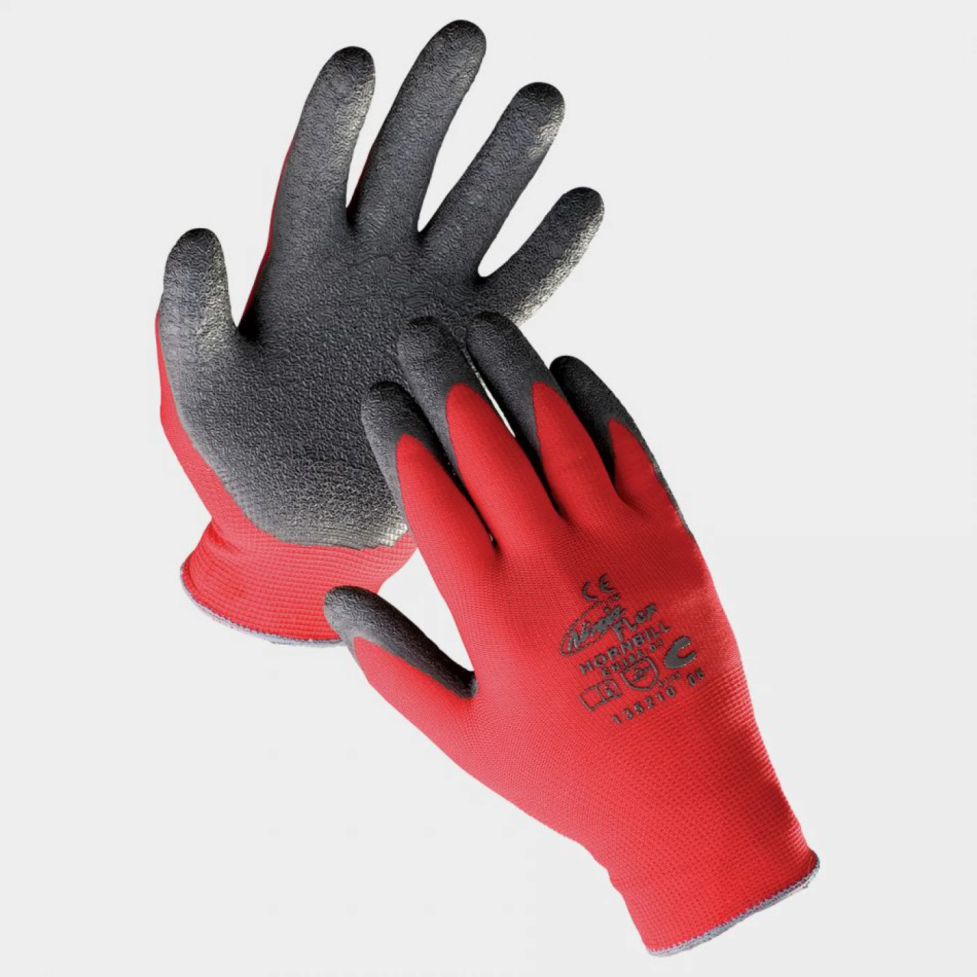 Mănuși din nailon tricotate fără cusături, cu aplicare elastică de cauciuc pe palmă și degete și manșetă elastică. Rezistent până la 100°C