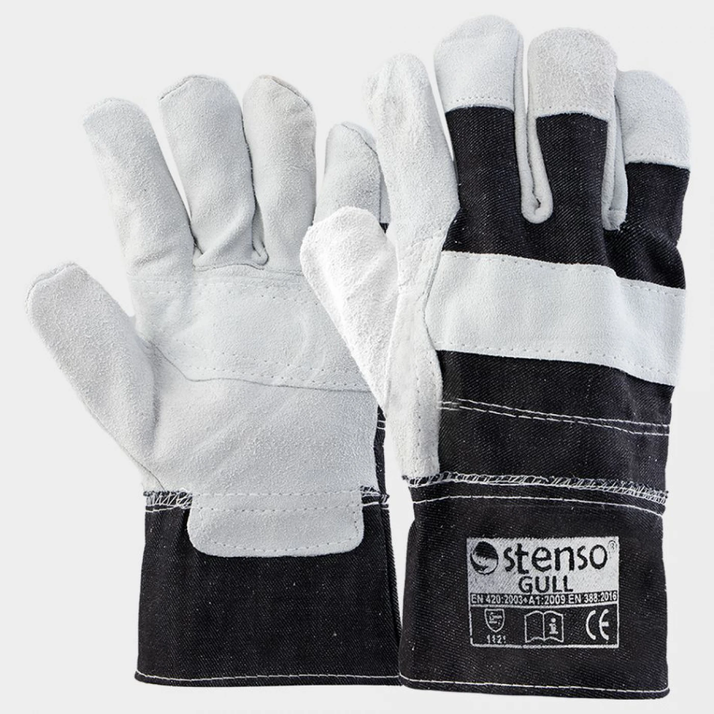 Mănuși făcute din piele de vițel despicată, palmă și degete întărite, spate din bumbac și căptușeală.