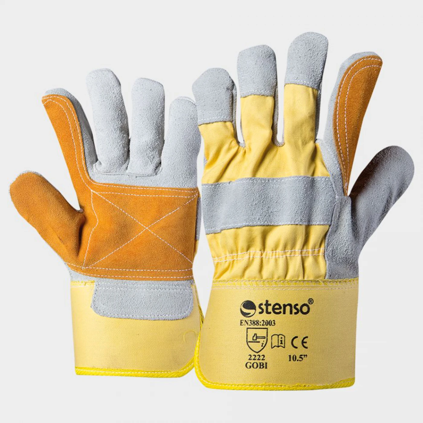 Mănuși din piele de vițel despicată, spate și manșetă din țesătură de bumbac, căptușeală, întărite în zona palmei, degetului mare și a arătătorului.