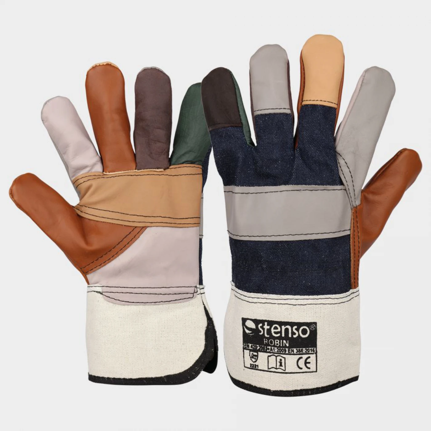 Mănuși din piele de vițel multicolor, căptușeală, palmă, spate și manșetă întărite din MATERIAL denim de bumbac.