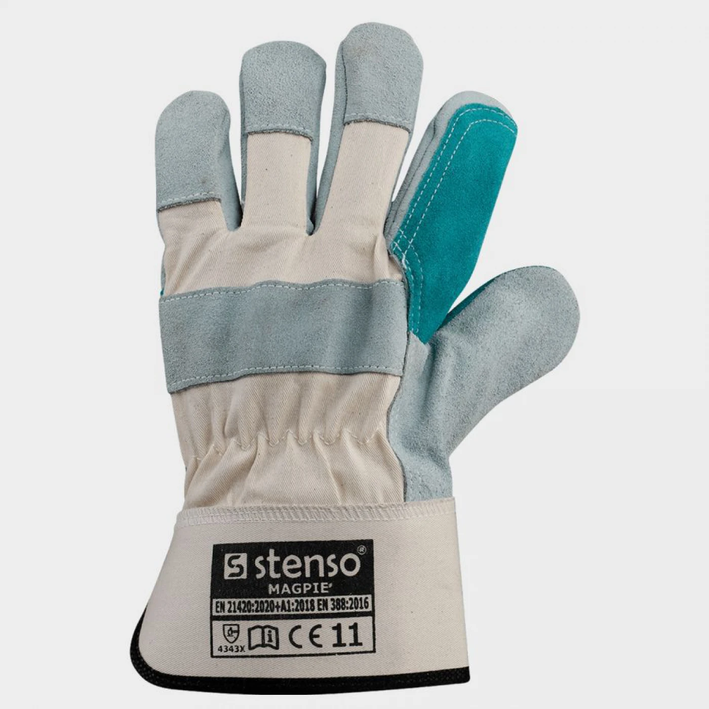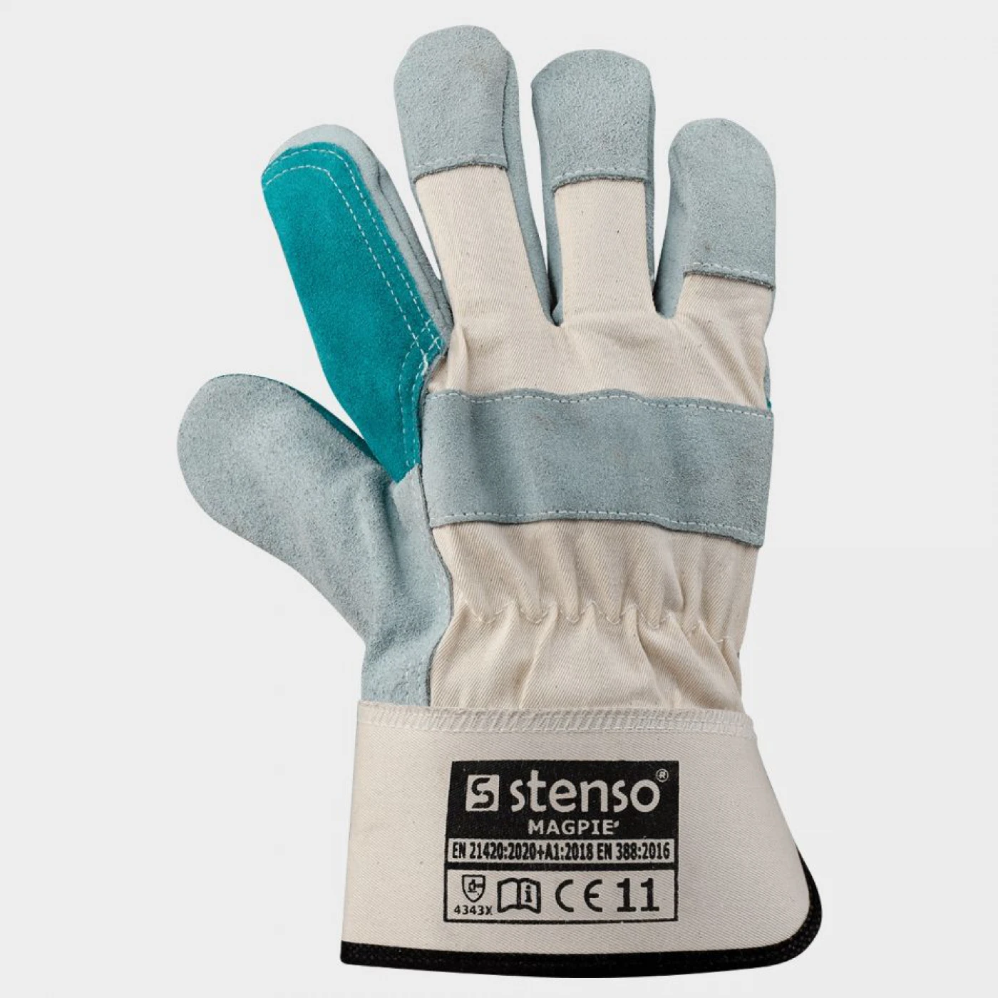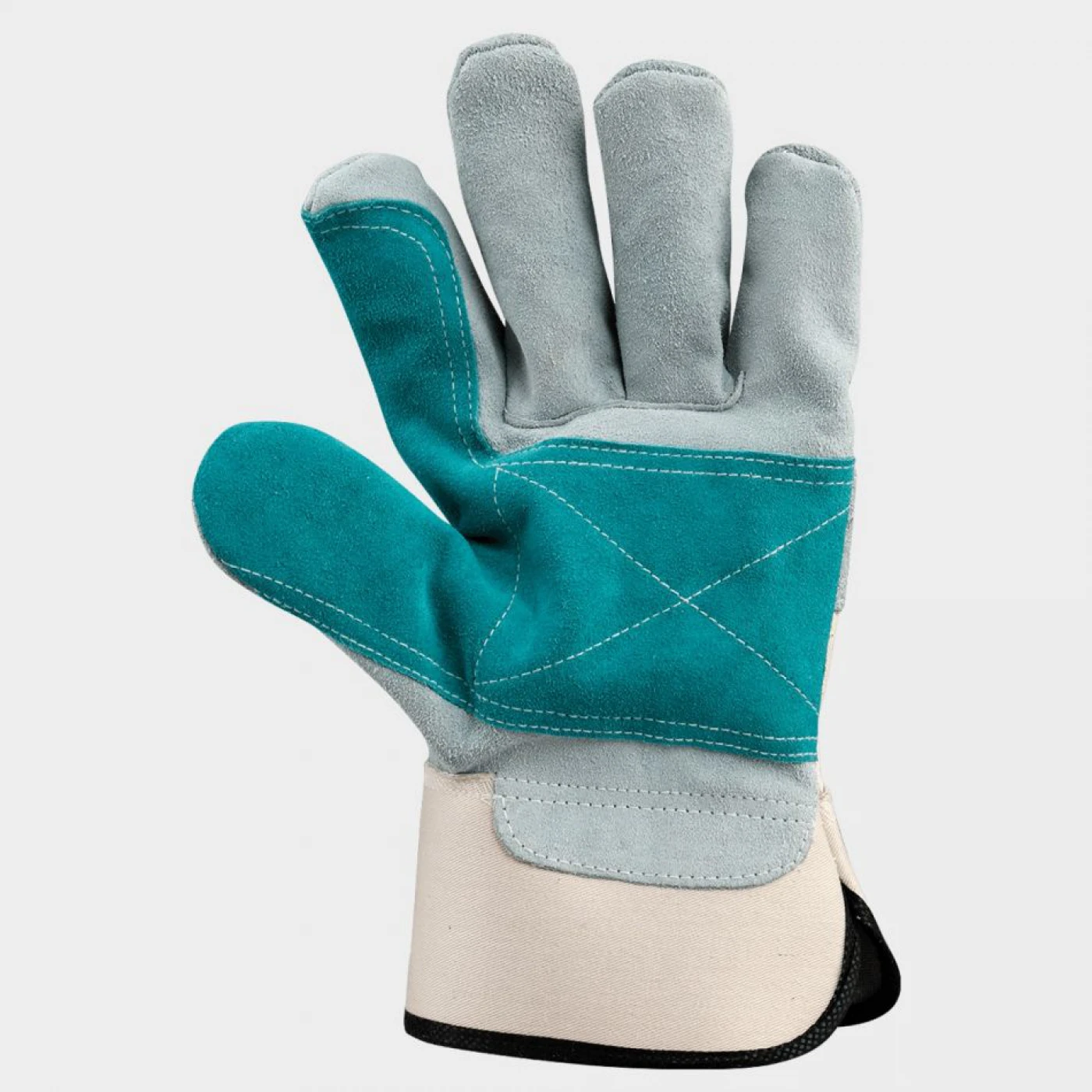 Mănuşi cu strat dublu din şpalt de bovină ca întăritură pe palmă, căptuşite, ţesătură albă din bumbac pe dos palmă, manşetă rigidă şi întărită.