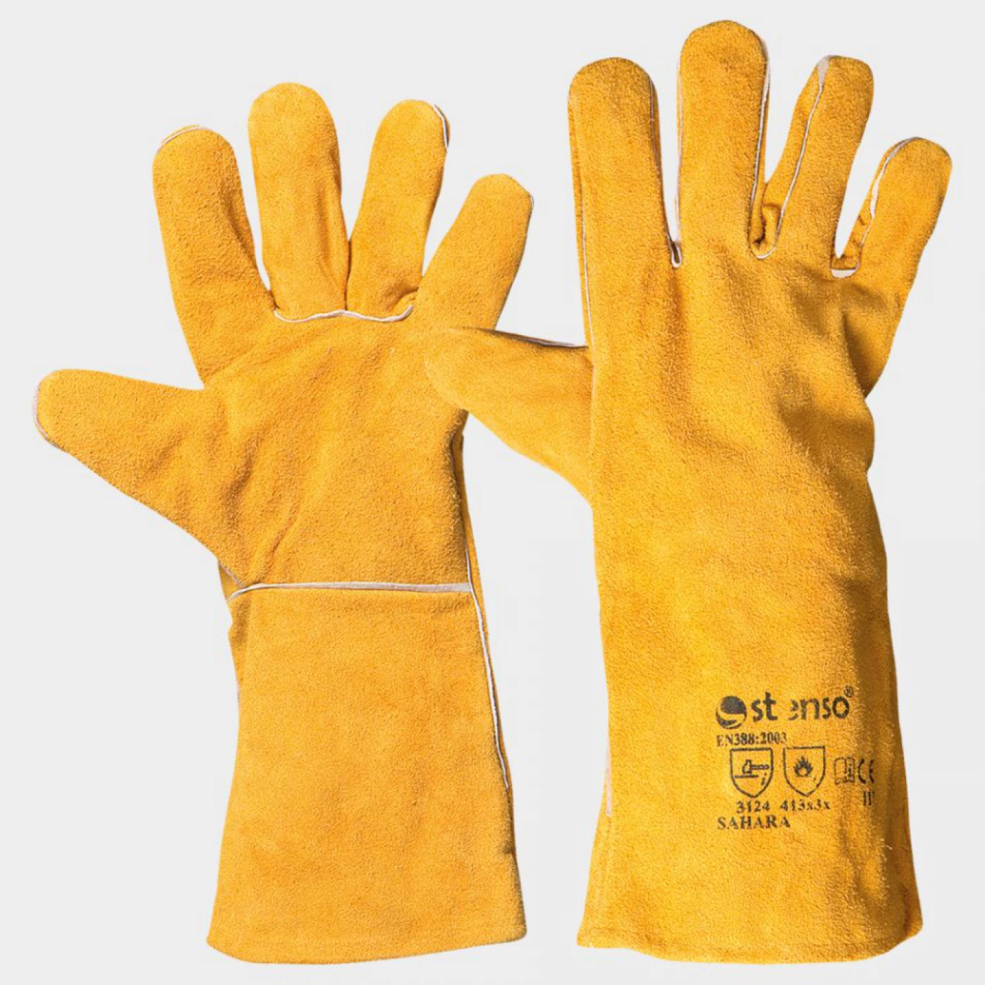 Mănuși pentru sudori tip A cu cinci degete, confecționate din piele de vițel despicat de înaltă calitate cu căptușeală din bumbac, lungime manșetă 15 cm.