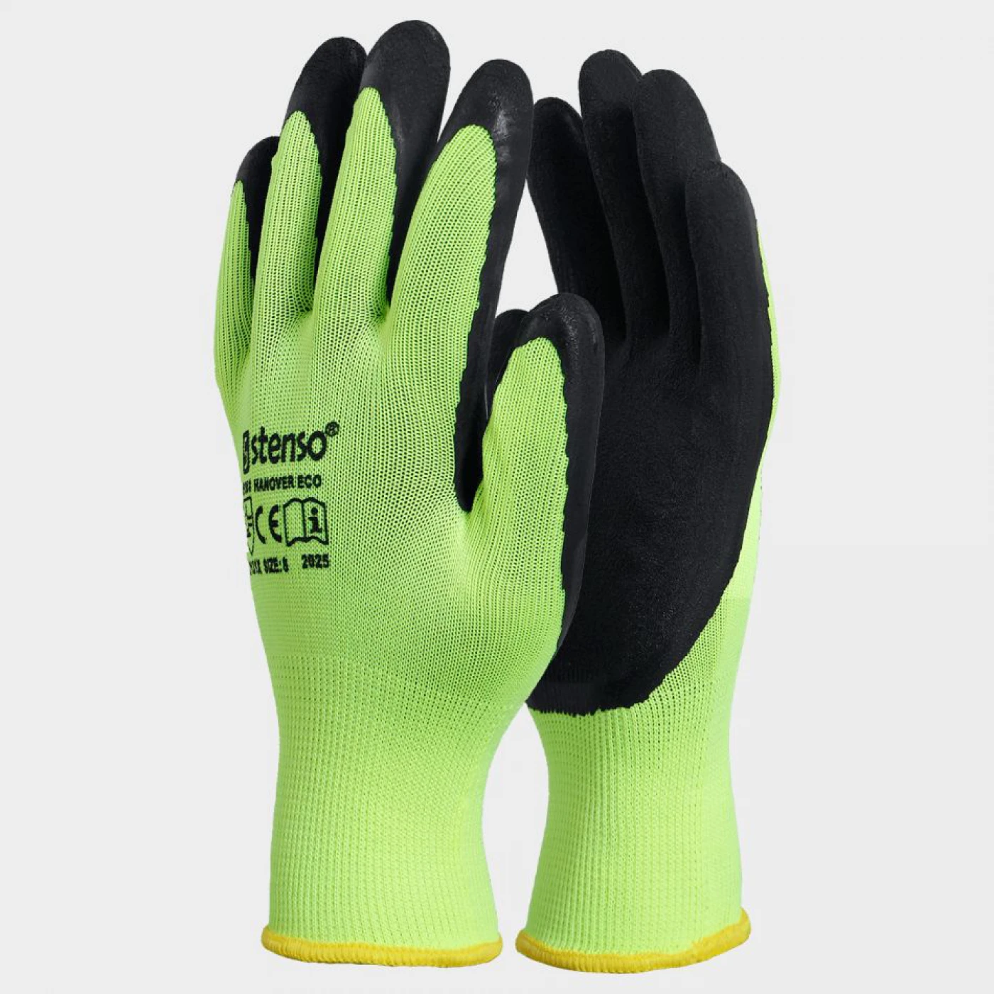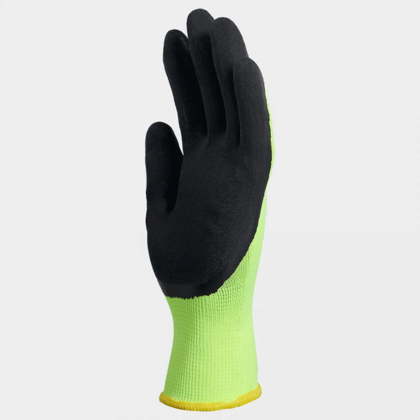 Mănuși de lucru din poliester tricotat fără cusături (13G) în culoare de HV, cu strat de spumă de latex pe palmă și degete și manșetă elastică pentru o fixare confortabilă.
