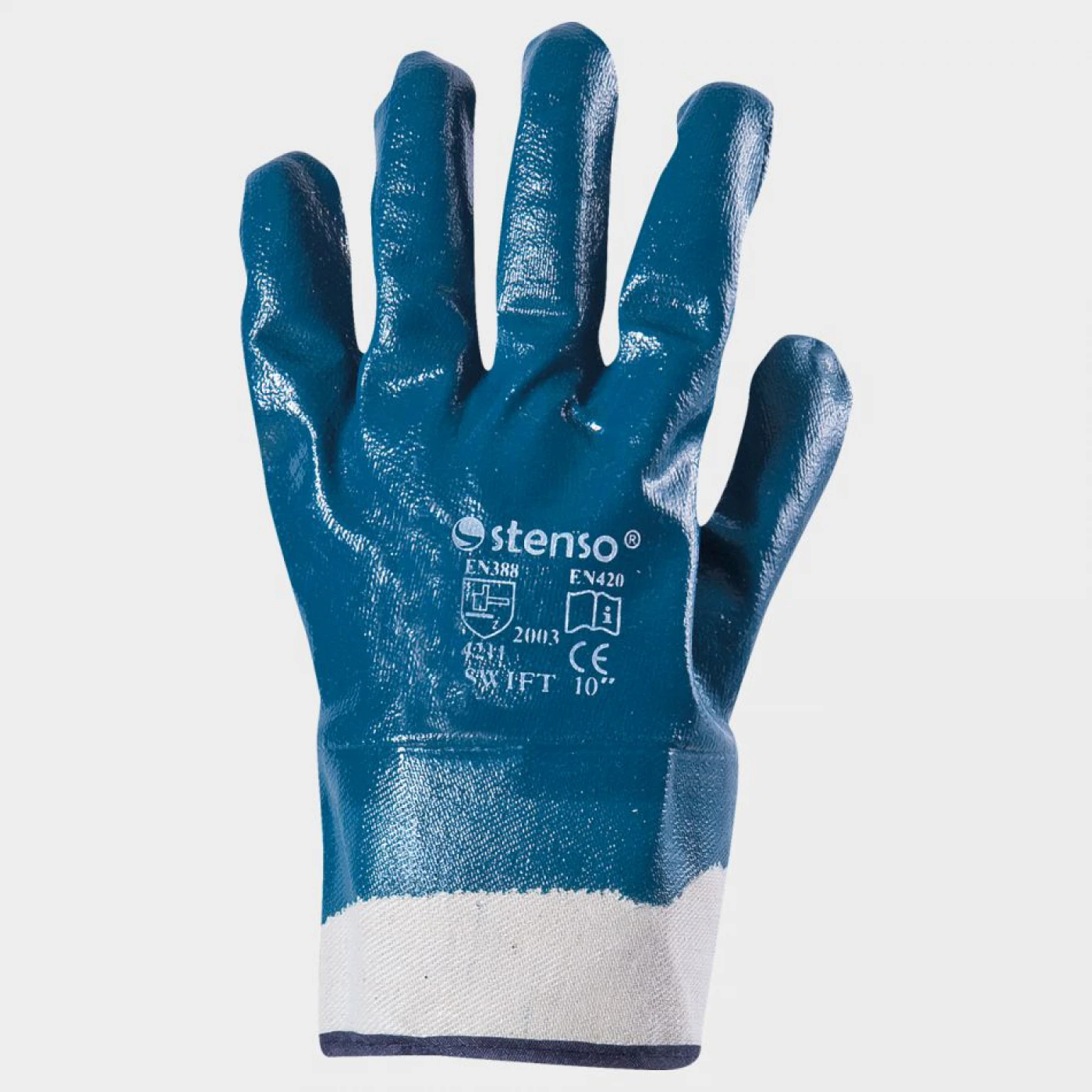 Mănuşi cusute - tricot din bumbac interlock, palma şi degetele imersate în nitril, manşetă rigidă, culoare albastră
