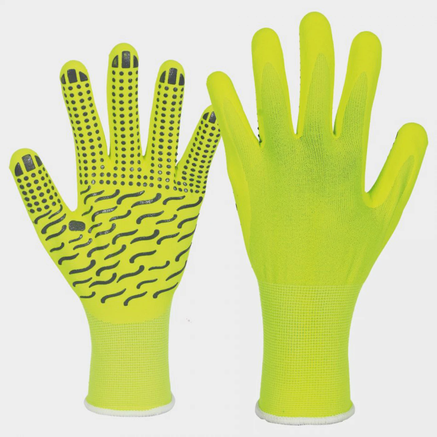Mănuși cu cinci degete din poliester/lycra 15G, de culoare verde aprins, înmuiate în nitril microporos galben, cu puncte polimerice pe palme pentru o mai bună aderență în medii uscate, umede și uleioase.