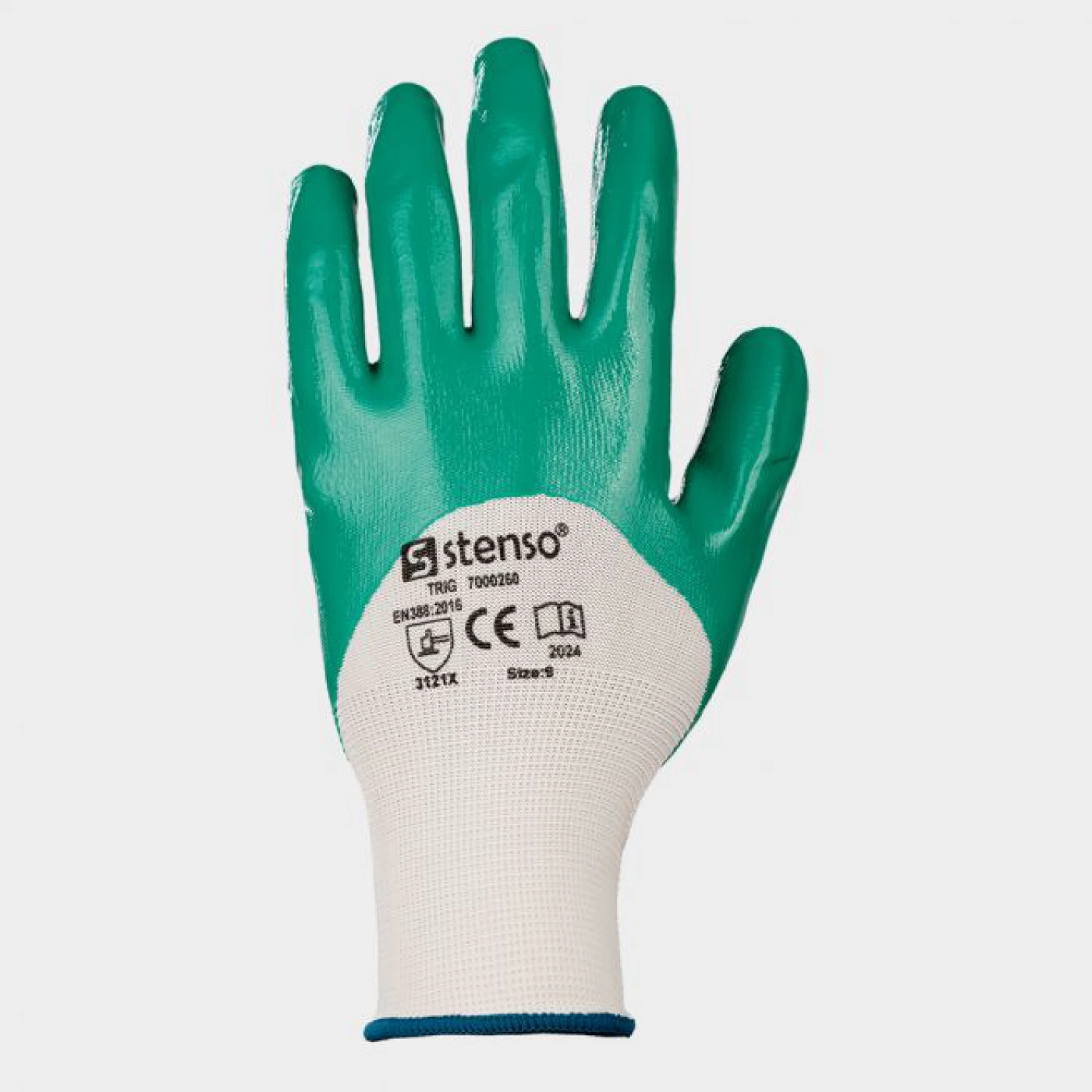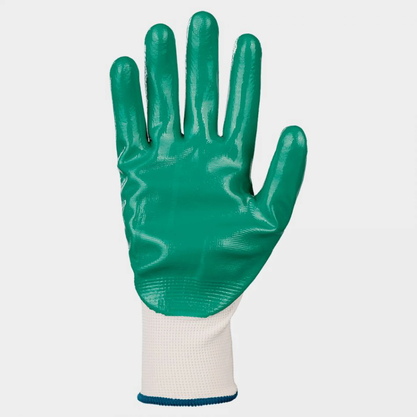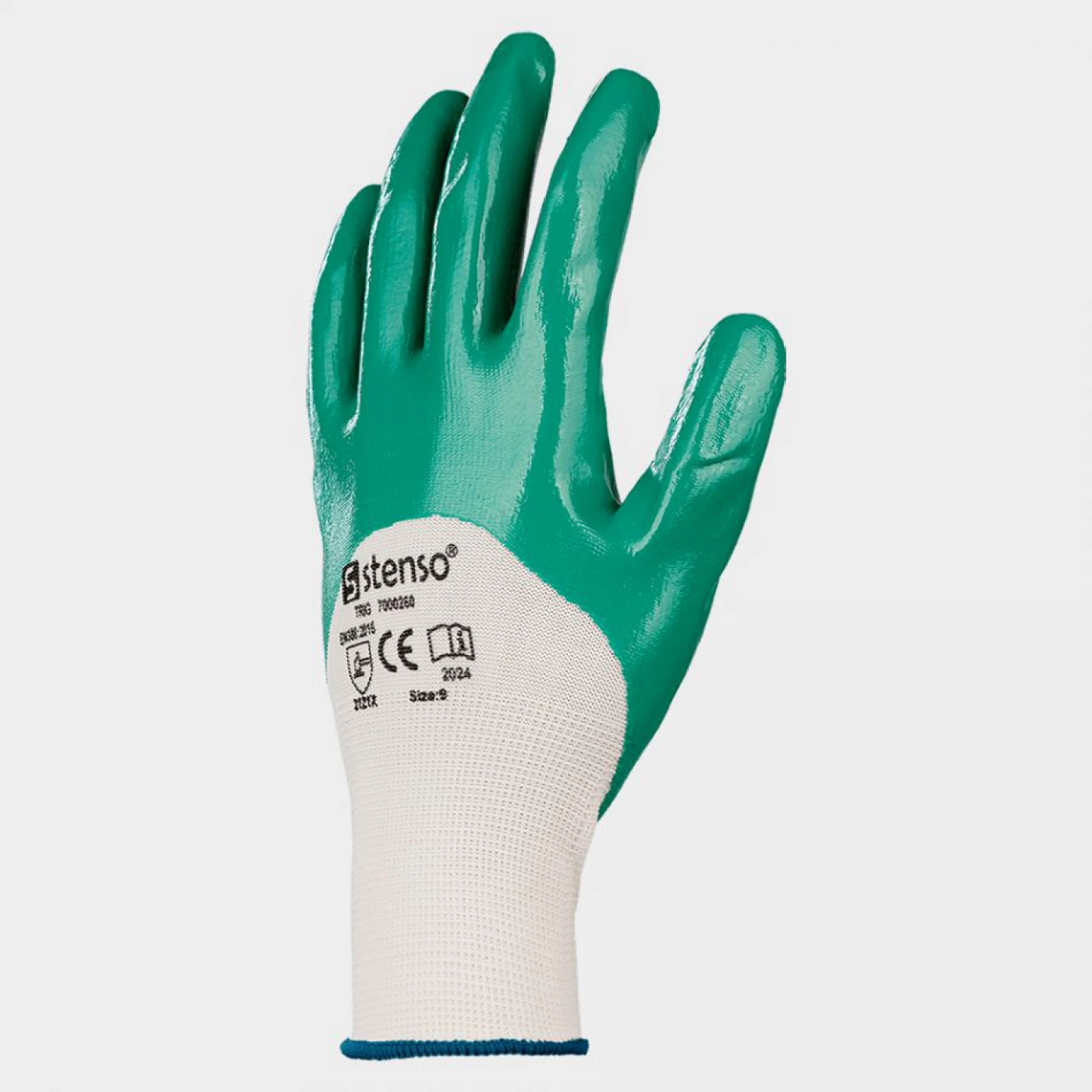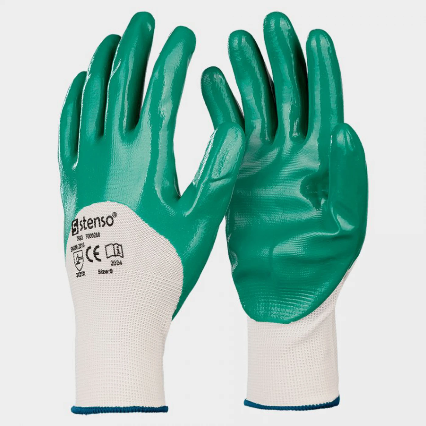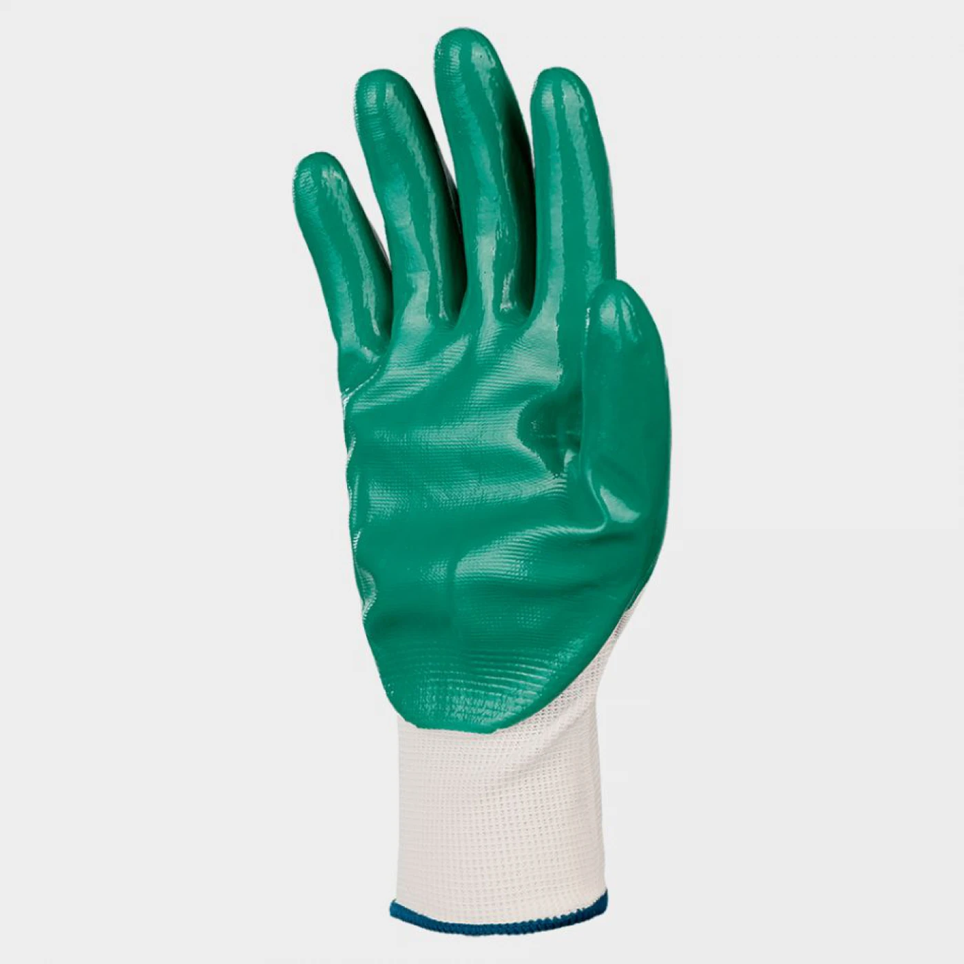 Mănuși din poliester albi, ușoare și respirabile, cu un strat de nitril verde neted 3/4 pentru aderență și protecție. MĂRIME: 9,10 EN 388