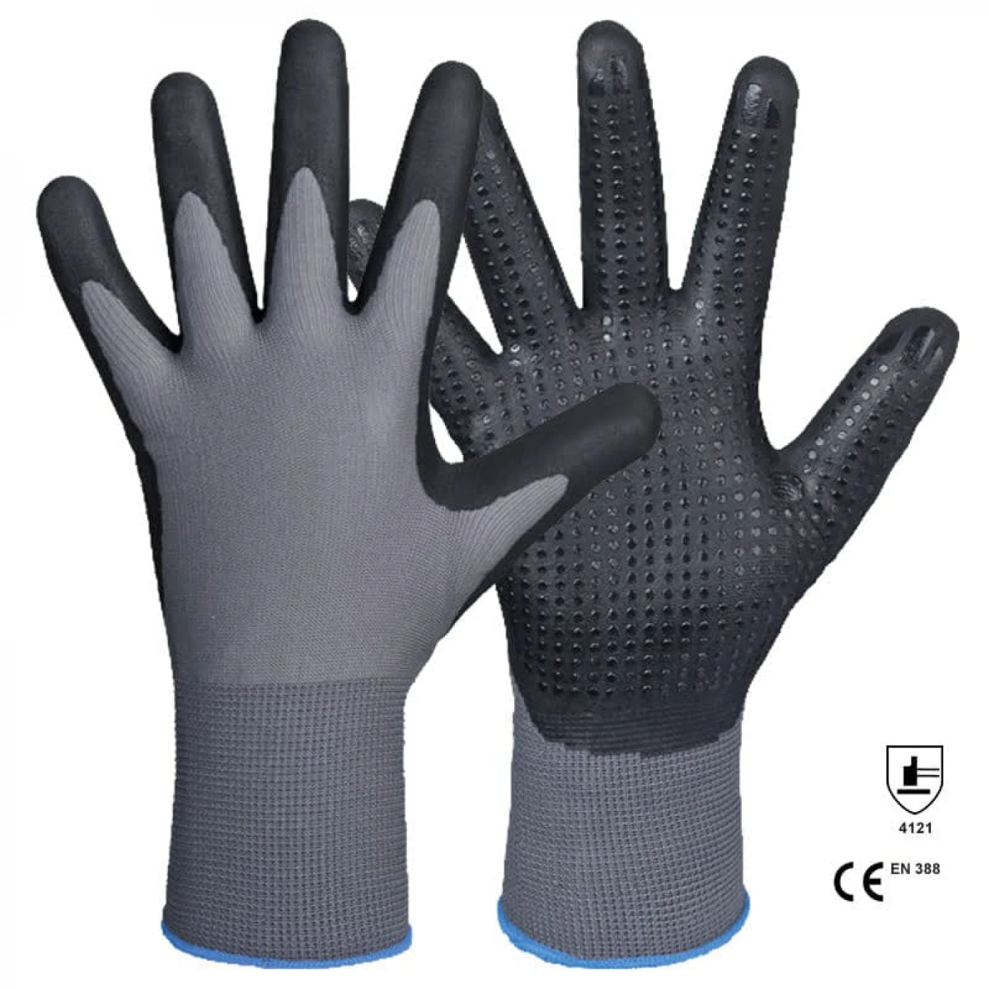 Manusi din tricot fin compozitie 100% poliester cu strat de nitril in palma si pe degete. Aplicatii punctiforme din PVC in palma. Asigura o foarte buna aderenta si rezistenta la uleiuri si grasimi.