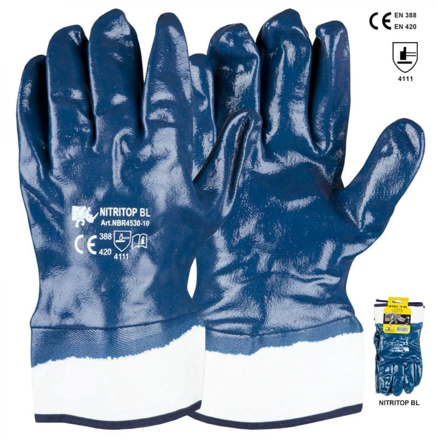Manusi din bumbac imersate in nitril, cu manseta elastica si dosul palmei aerisit. Foarte buna rezistenta la abraziune si rupere dar si la uleiuri si grasimi.