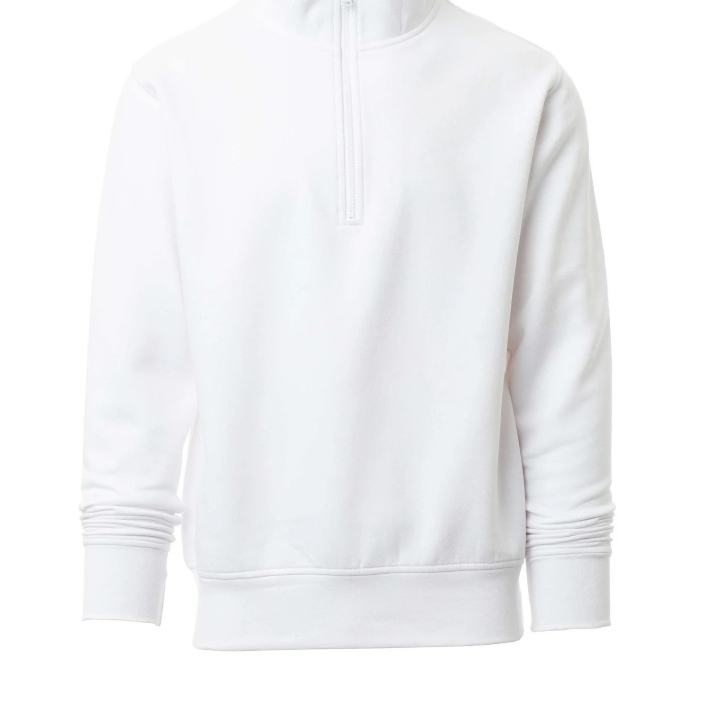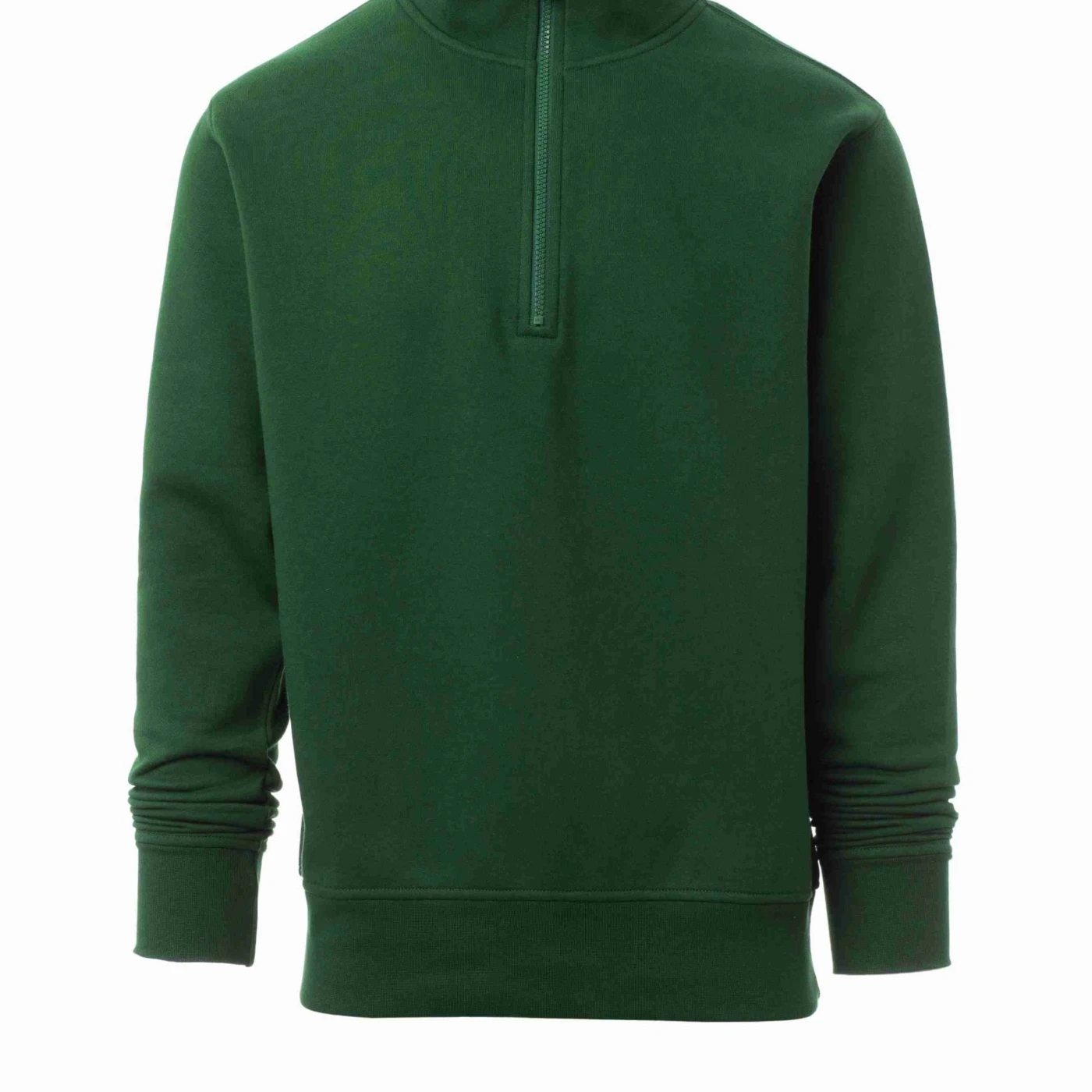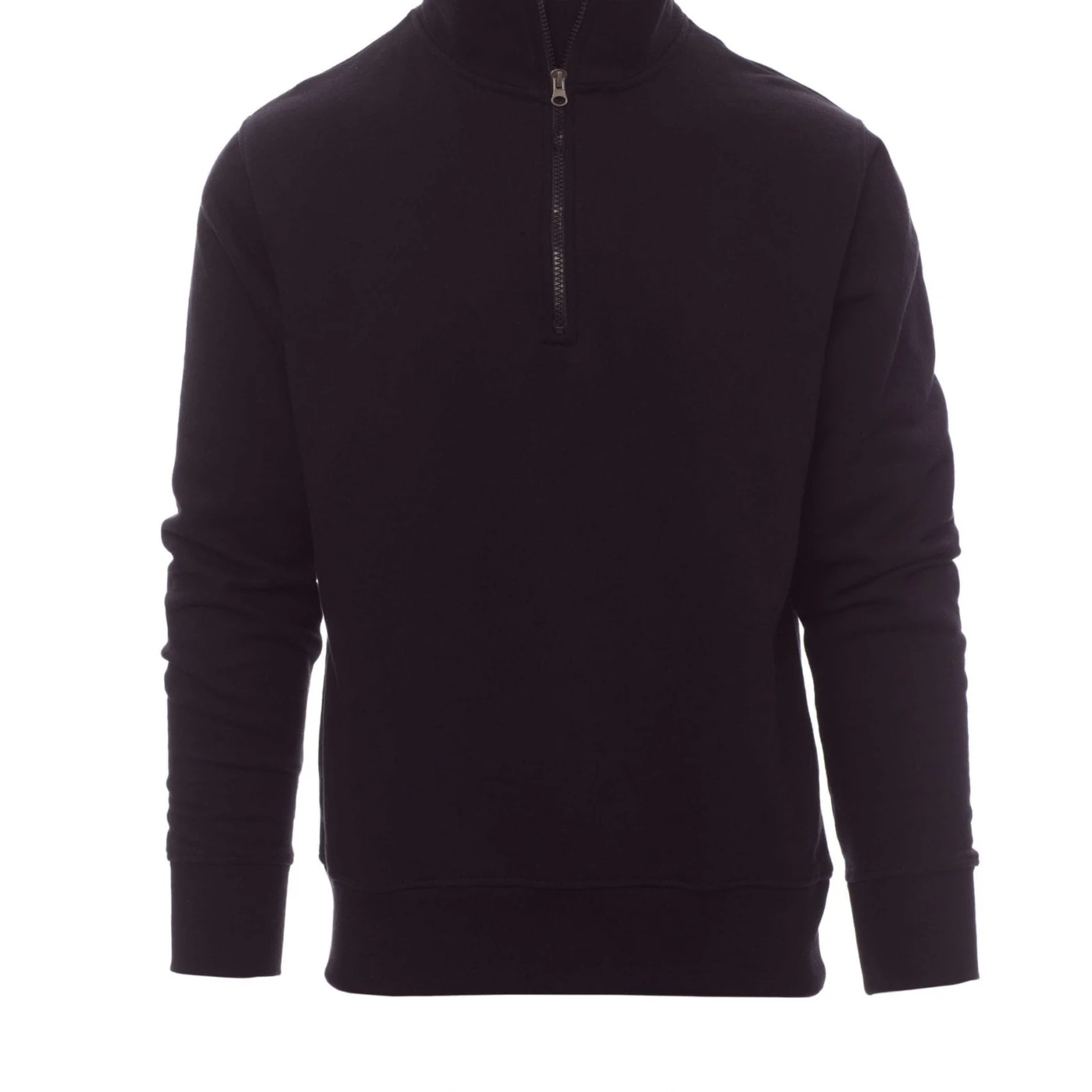Bluză de trening pentru bărbați, cu fermoar la baza gâtului, într-o singură culoare, din plastic cu cursor metalic, mânecă ajustată, cu bandă elastică la manșete și în talie, cusături întărite.