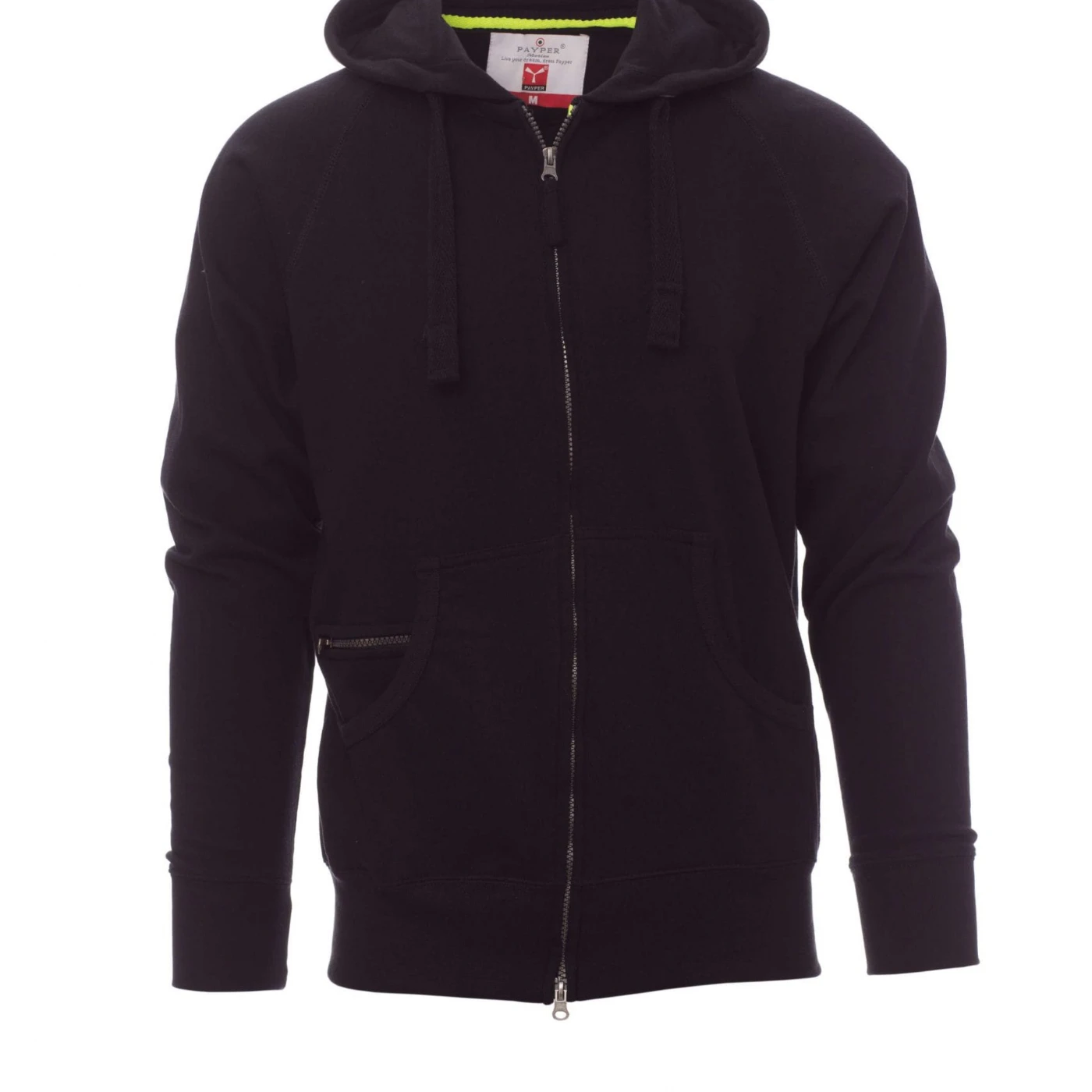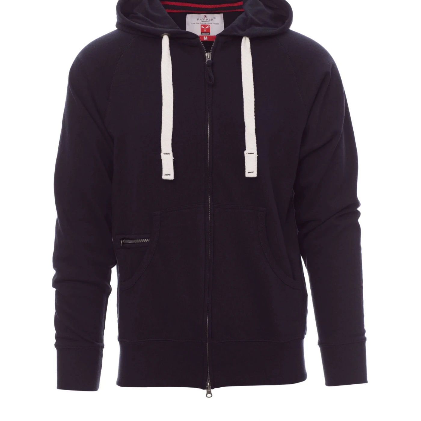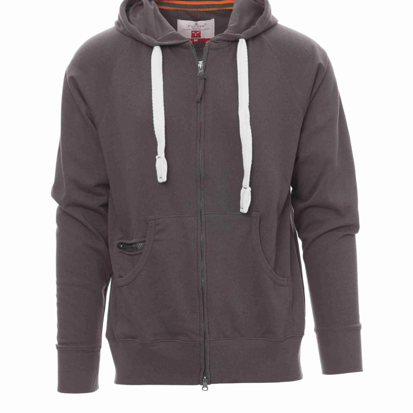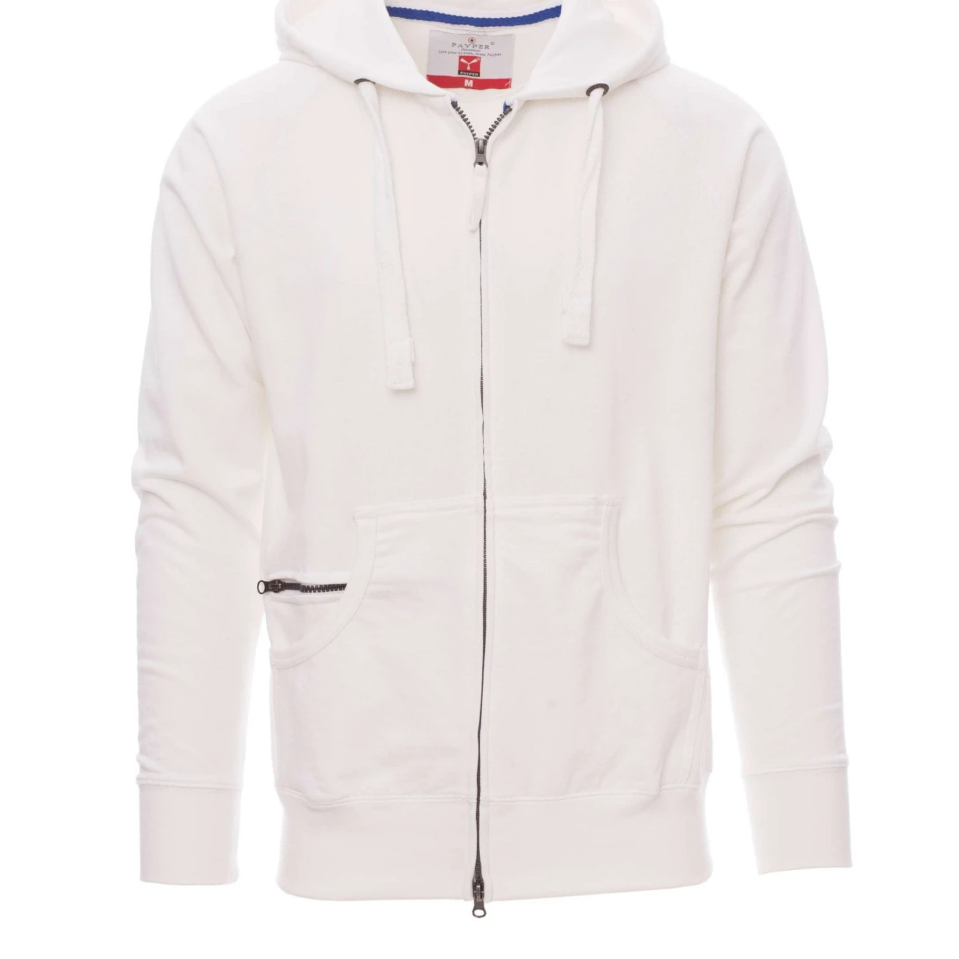 Hanorac pentru bărbați, cu fermoar integral SBS acoperit, cu dublu cursor metalic, glugă cu două cusături, șnur alb cu cusături în aceeași culoare cu hanoracul, cu ochiuri metalice, mânecă raglan, buzunare de tip marsupiu, buzunar cu fermoar, bandă elastică la manșete și în talie. Cusături întărite.