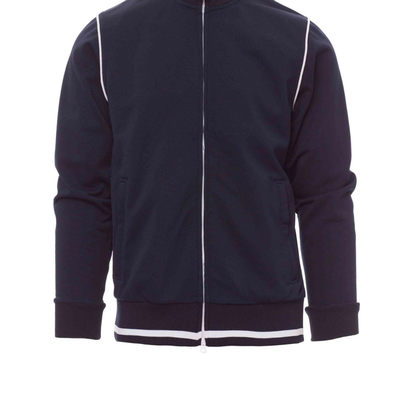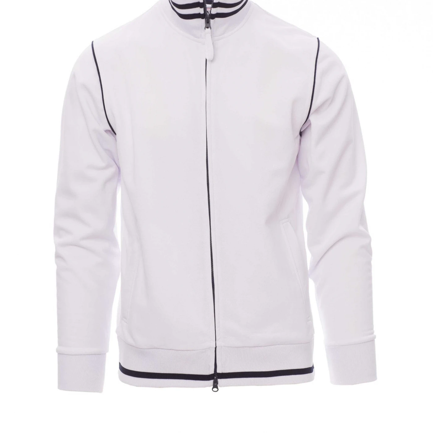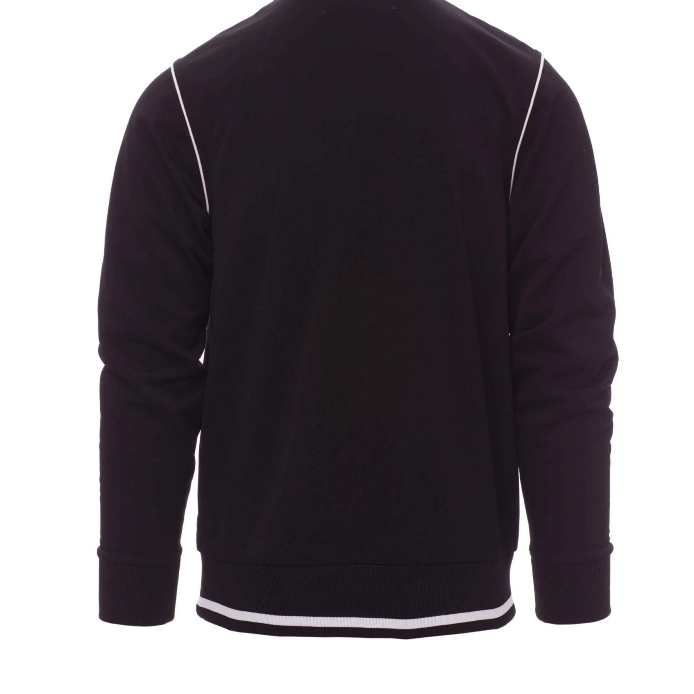 Bluză de trening pentru bărbați, cu fermoar integral în culoare contrastantă, acoperit, din plastic cu cursor dublu metalic. Guler și talie elastice cu dungi contrastante, bandă elastică la manșete, paspoal la nivelul cusăturii umărului, două buzunare laterale cu fermoar, cusături întărite, strat exterior simil piquet ce asigură caracterul respirabil îmbunătățit al țesăturii.