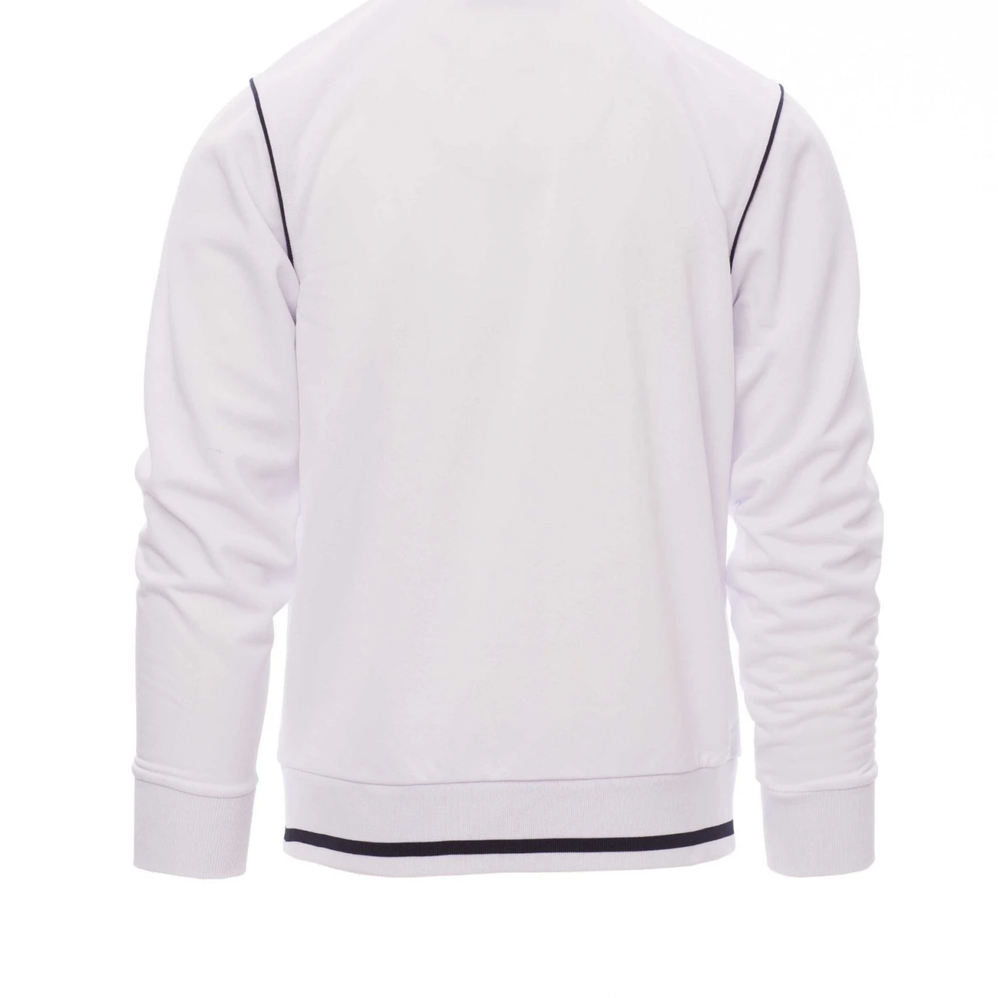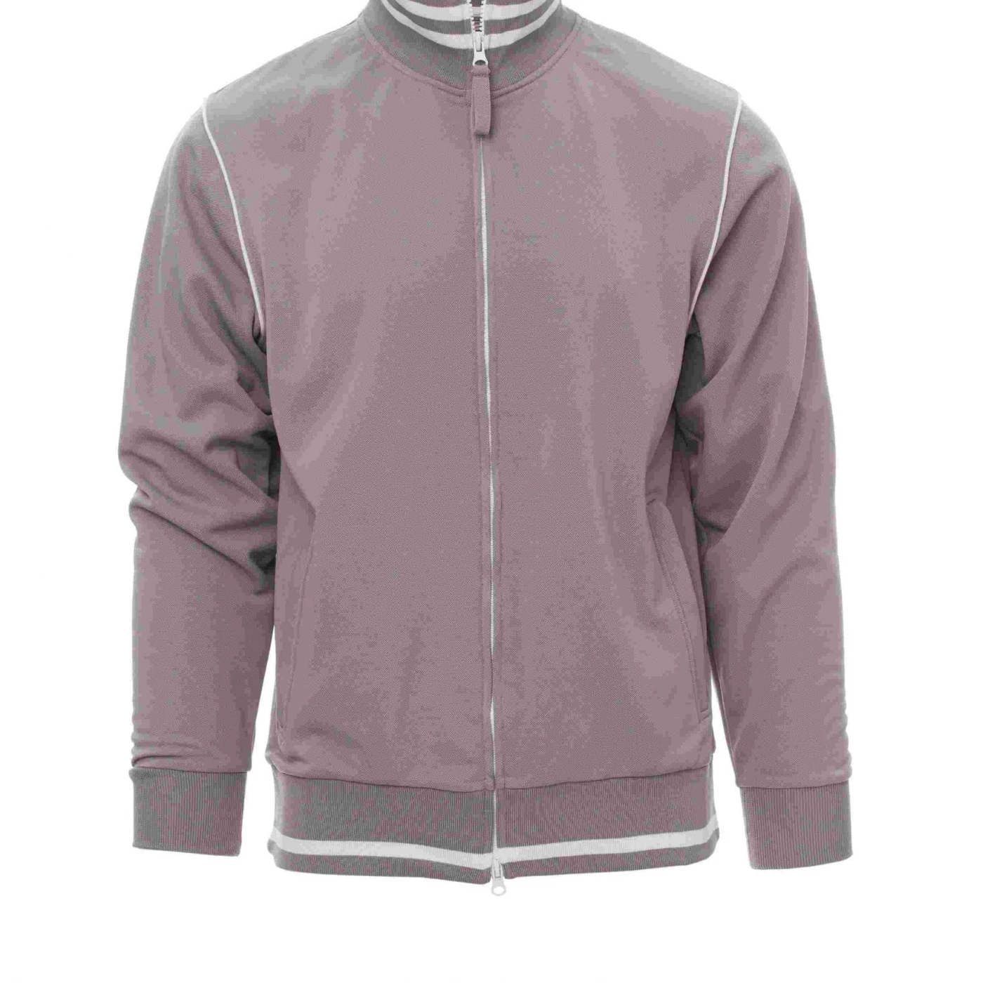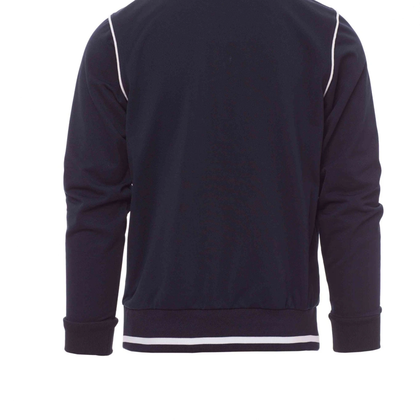 Bluză de trening pentru bărbați, cu fermoar integral în culoare contrastantă, acoperit, din plastic cu cursor dublu metalic. Guler și talie elastice cu dungi contrastante, bandă elastică la manșete, paspoal la nivelul cusăturii umărului, două buzunare laterale cu fermoar, cusături întărite, strat exterior simil piquet ce asigură caracterul respirabil îmbunătățit al țesăturii.