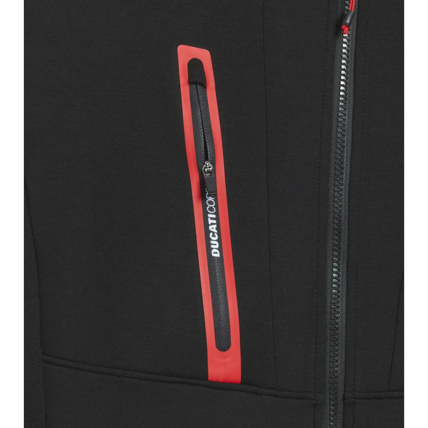 Felpa in scuba personalizzata DUCATI CORSE. Due tasche laterali e una frontale chiusa con zip e dettaglio termonastrato con personalizzazione DUCATI CORSE. Maniche ergonomiche e polsini in Lycra. Finiture rosse a contrasto e dettagli reflex. Emblema DUCATI CORSE sulla manica. Fit regolare.