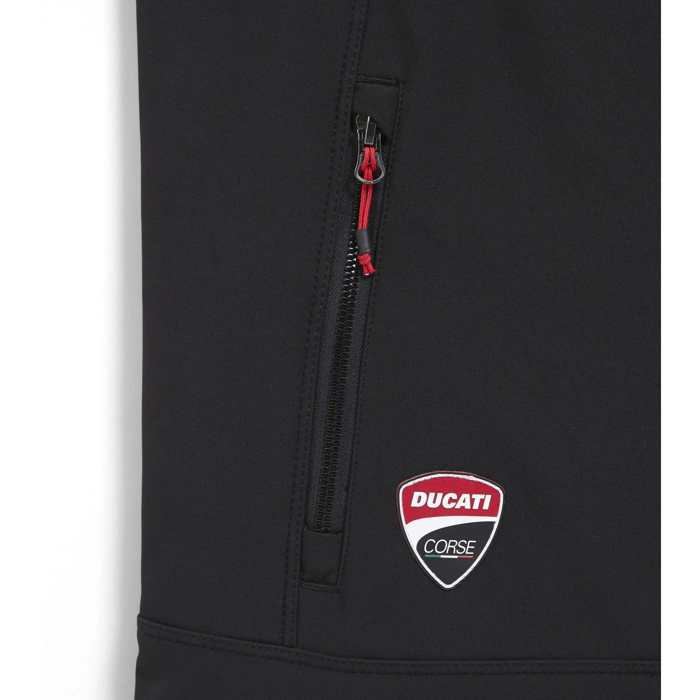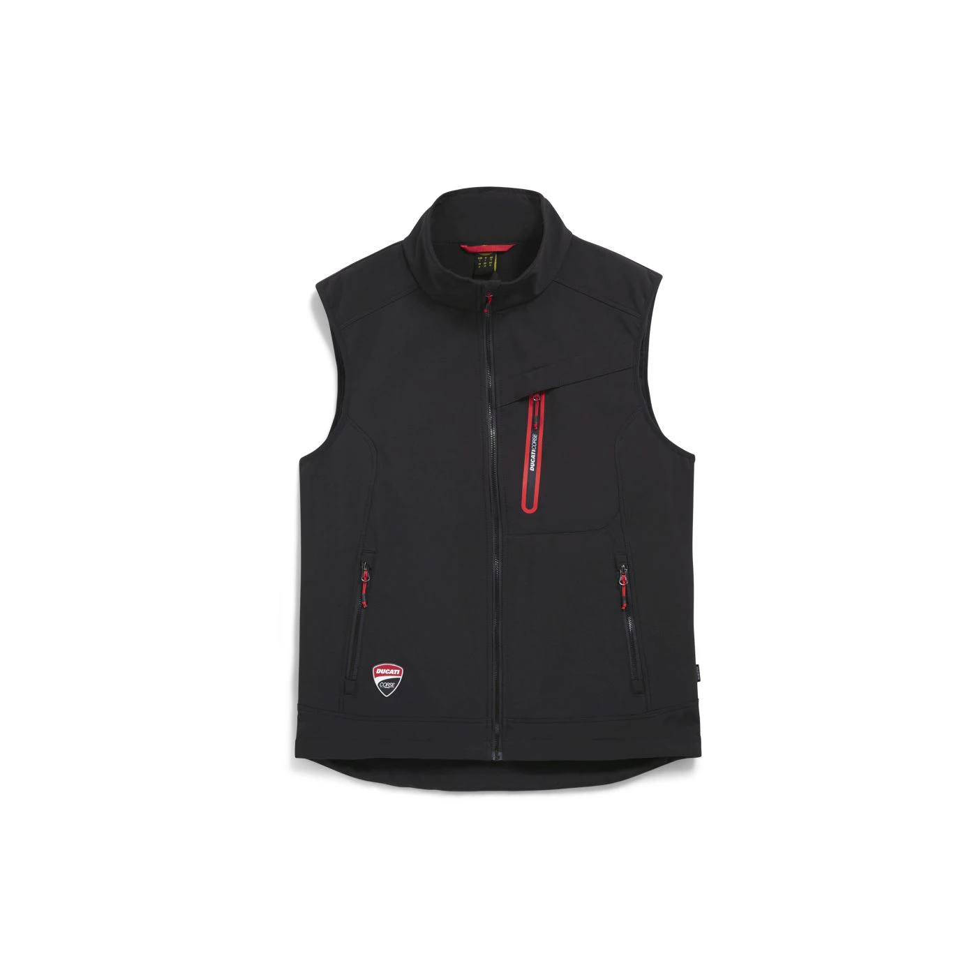 Gilet in tessuto idrorepellente elasticizzato con personalizzazione DUCATI CORSE. Tasca petto con zip a contrasto e dettagli reflex. Tasche laterali con bottone a pressione. Tasca interna porta oggetti.