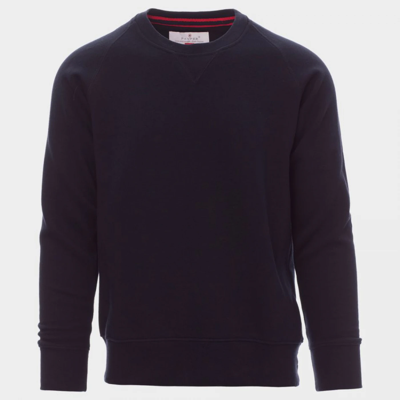 Bluză de trening pentru bărbați, cu guler rotund, mânecă raglan, cu cusătură în V estetică la nivelul gulerului. Bandă elastică la manșete și în talie, cusături întărite.