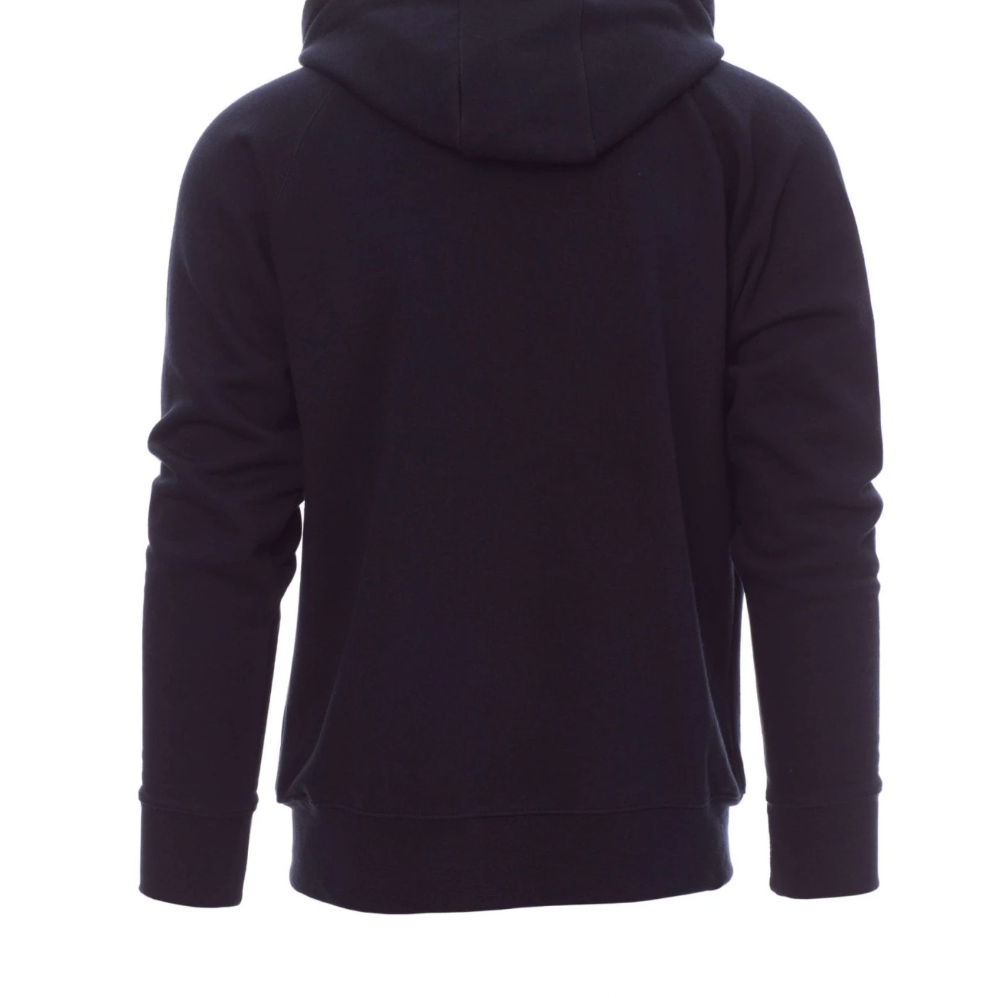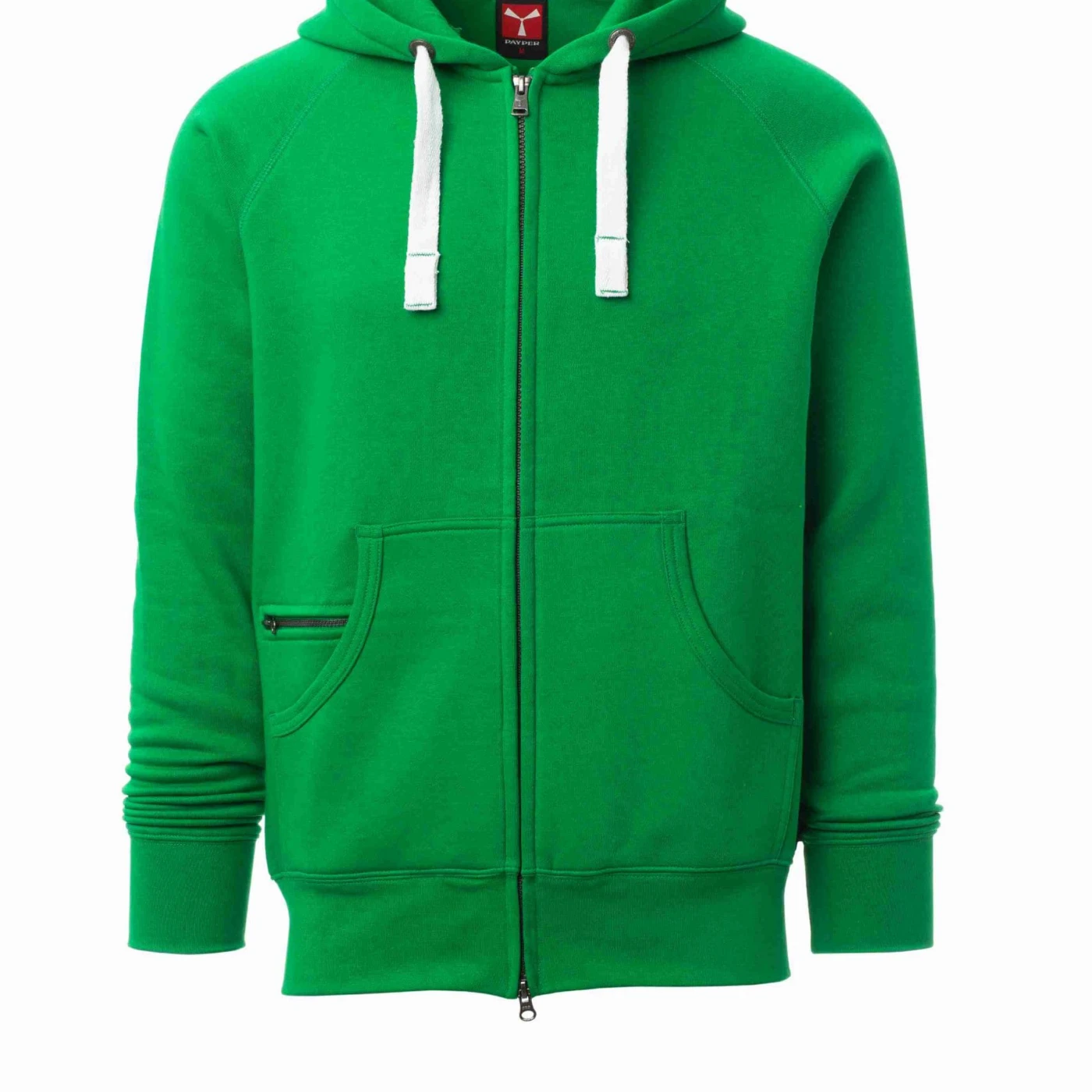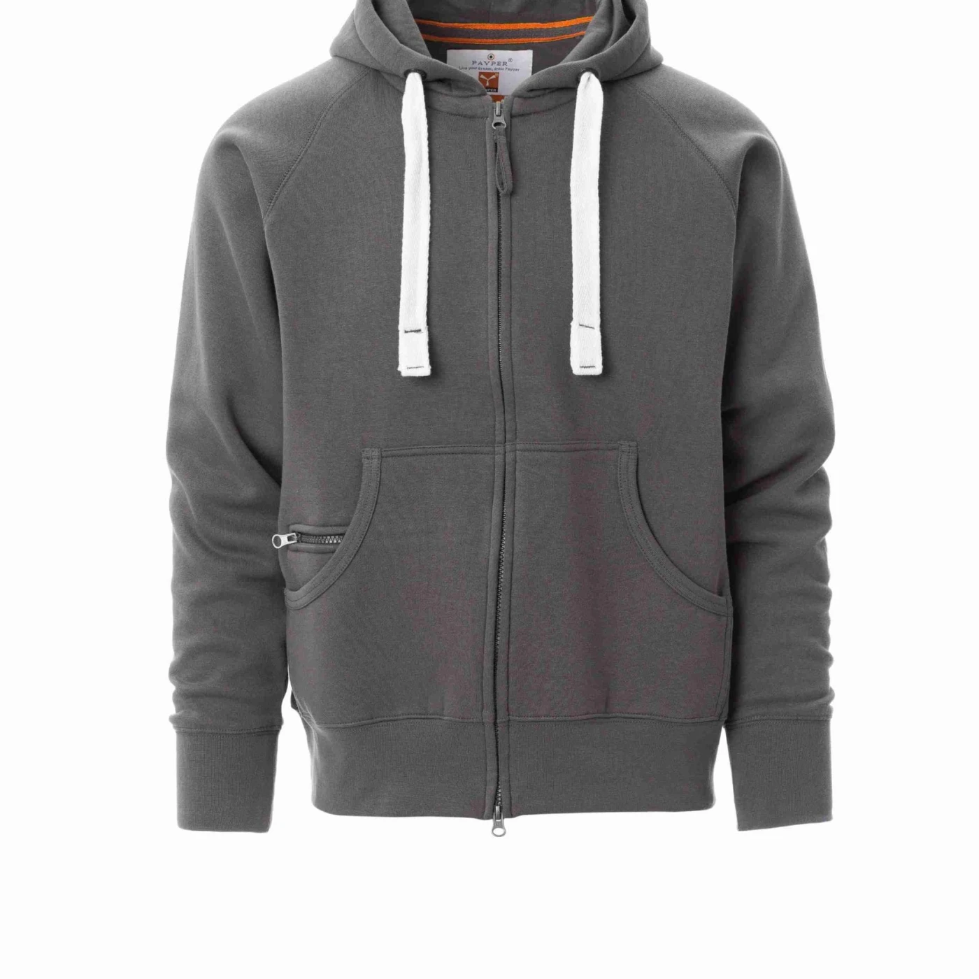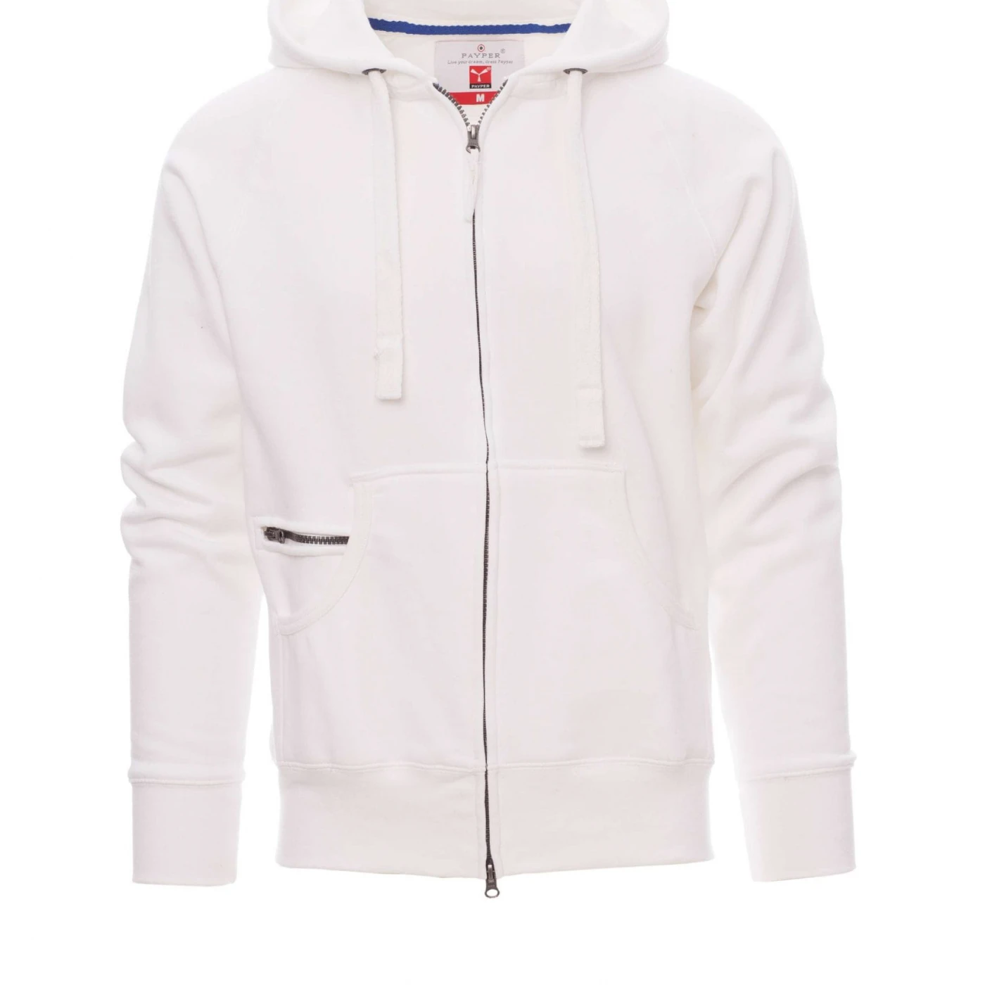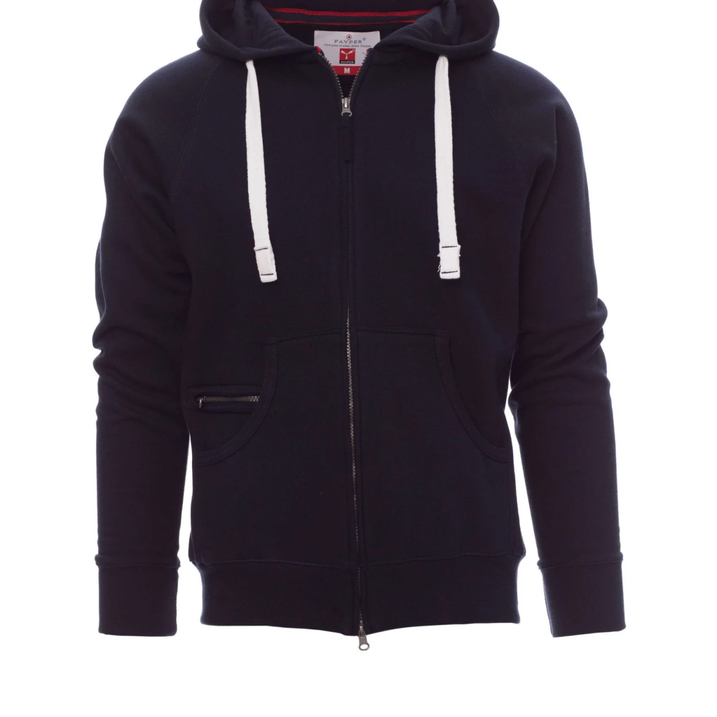 Hanorac pentru bărbați, cu fermoar integral SBS acoperit, din plastic cu dublu cursor metalic, glugă cu două cusături, șnur alb din material textil cu cusături în aceeași culoare cu hanoracul, cu ochiuri metalice, mânecă raglan, buzunare de tip marsupiu cu buzunar mic cu fermoar, bandă elastică la manșete și în talie. Cusături întărite.