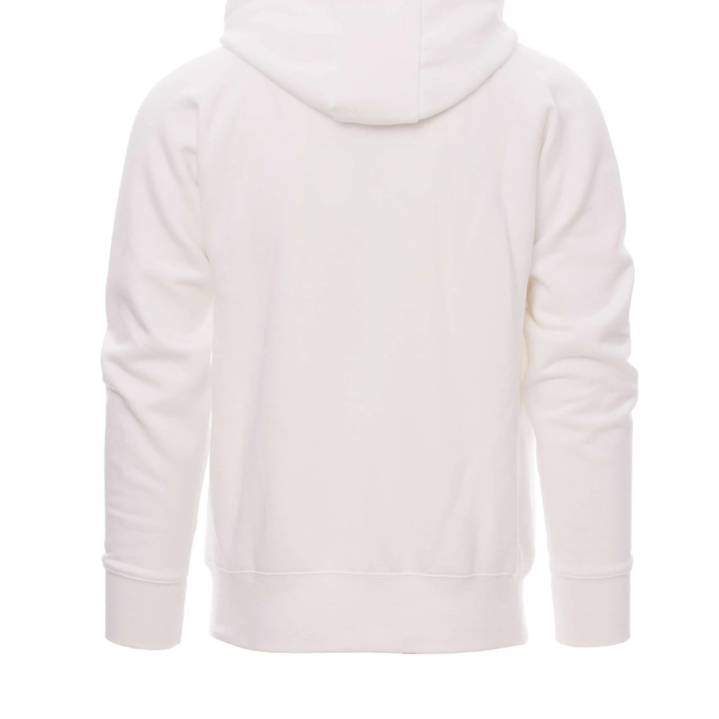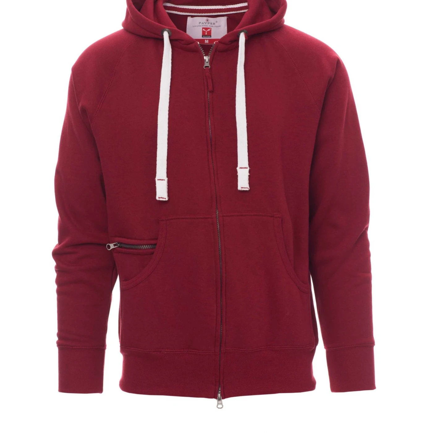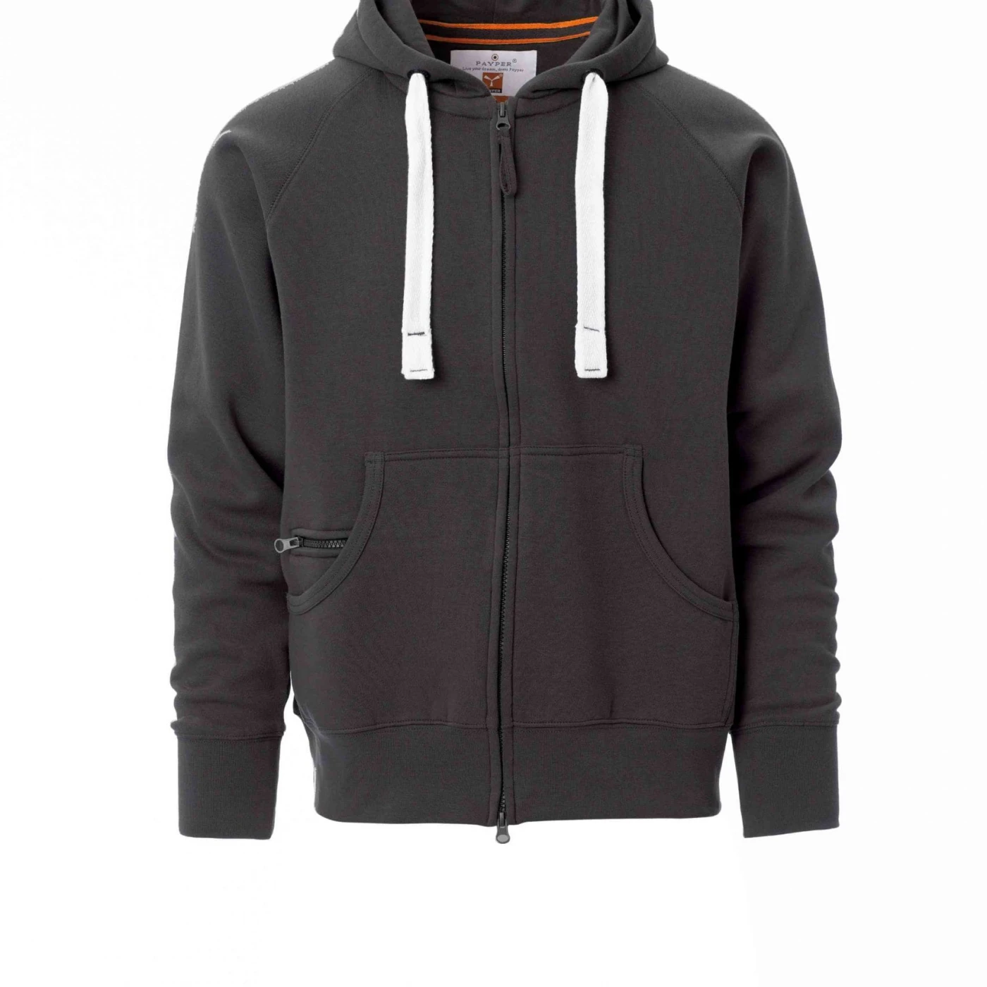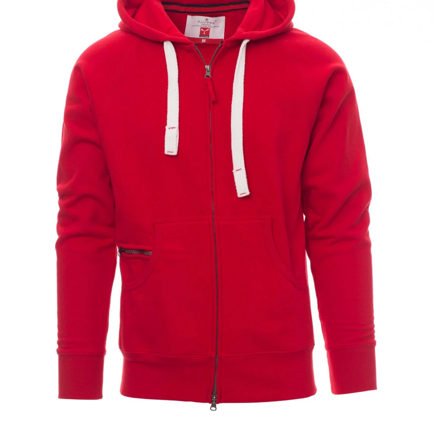 Hanorac pentru bărbați, cu fermoar integral SBS acoperit, din plastic cu dublu cursor metalic, glugă cu două cusături, șnur alb din material textil cu cusături în aceeași culoare cu hanoracul, cu ochiuri metalice, mânecă raglan, buzunare de tip marsupiu cu buzunar mic cu fermoar, bandă elastică la manșete și în talie. Cusături întărite.