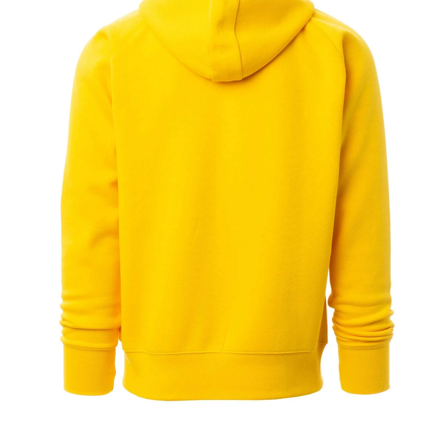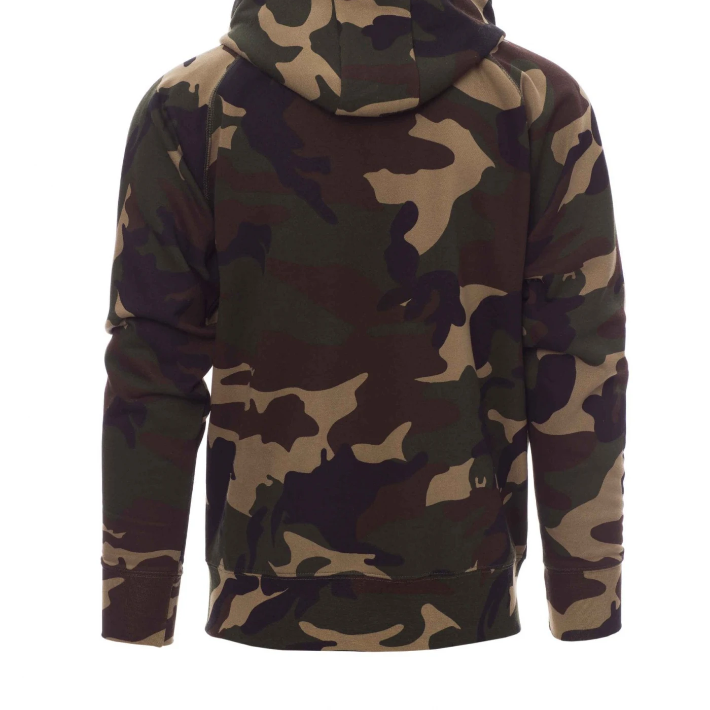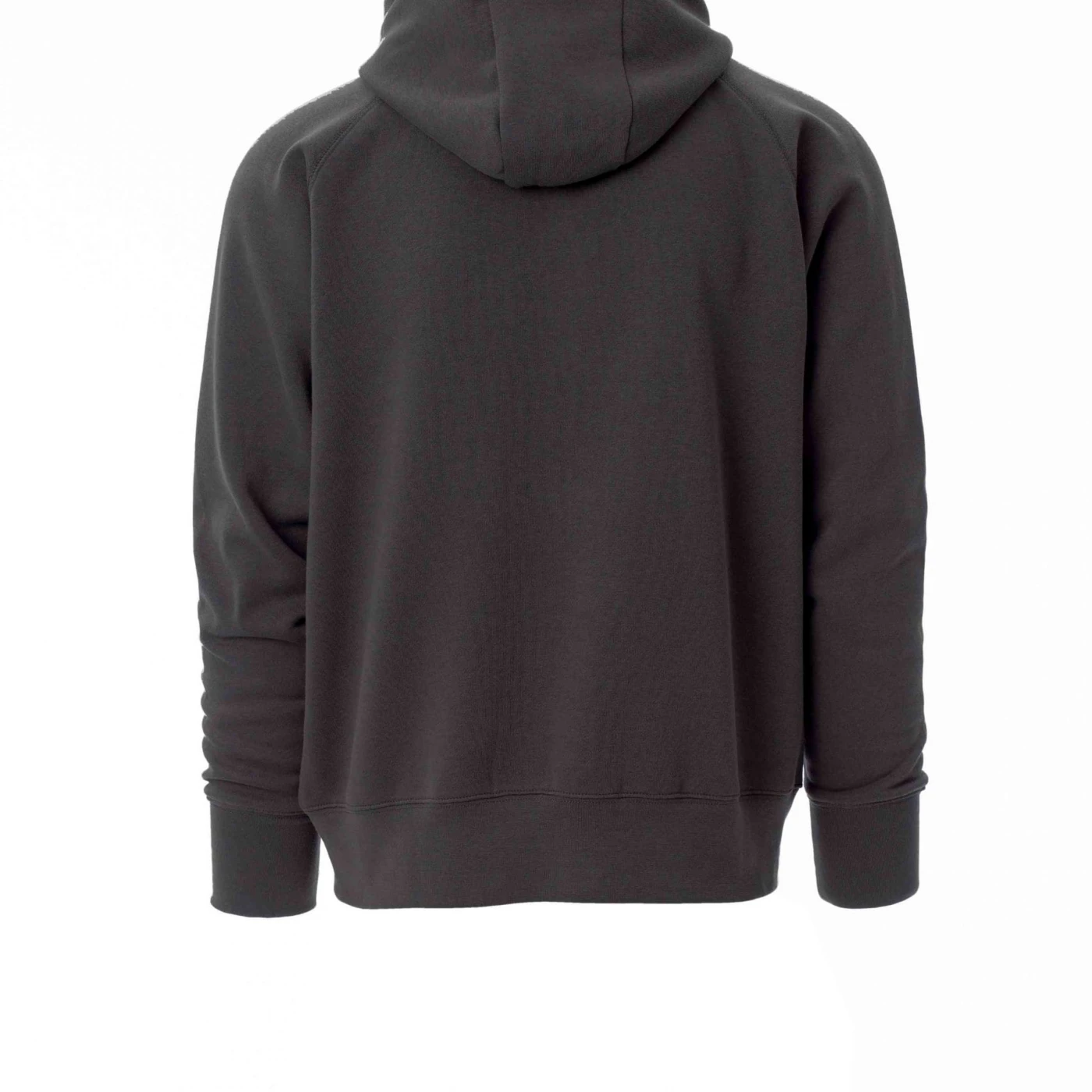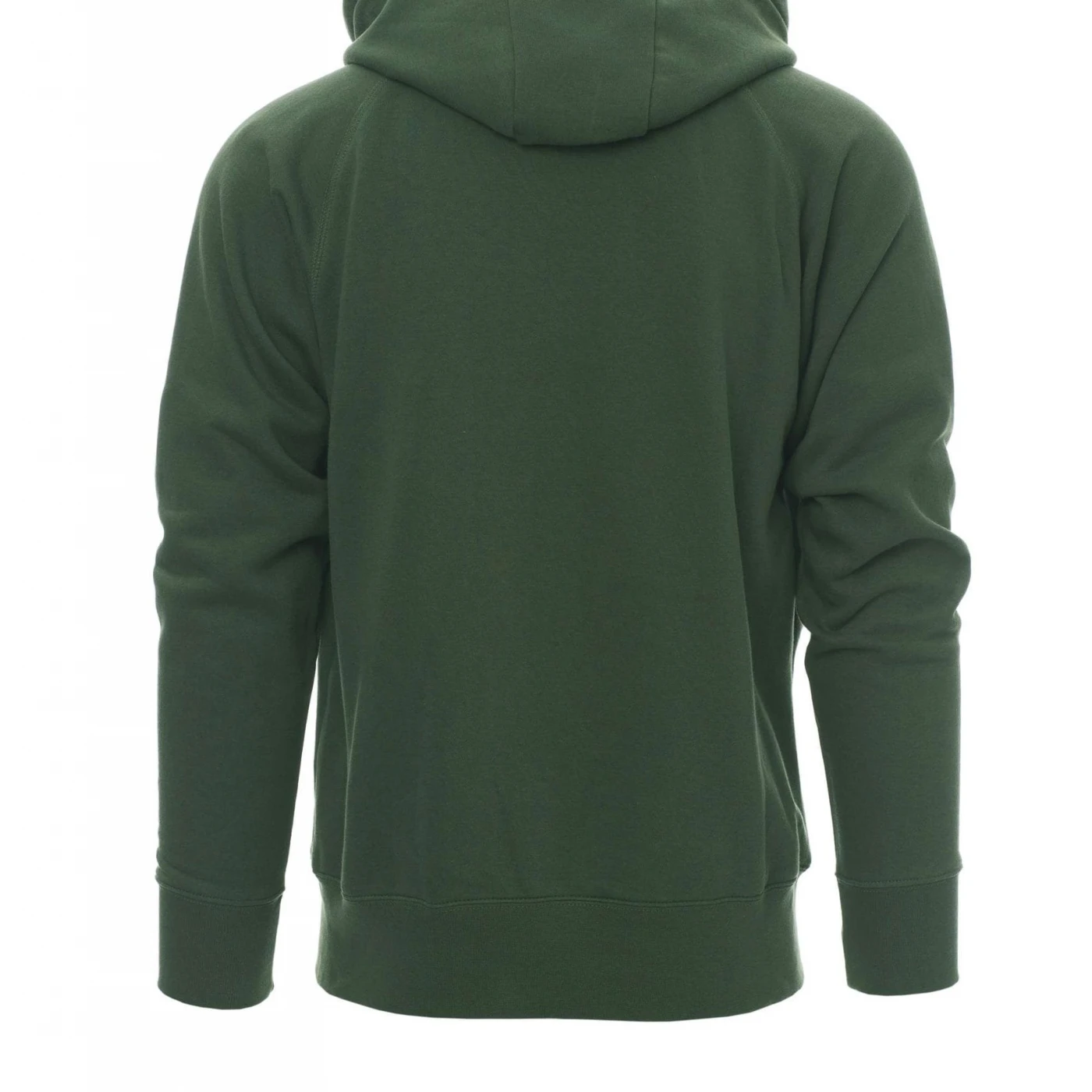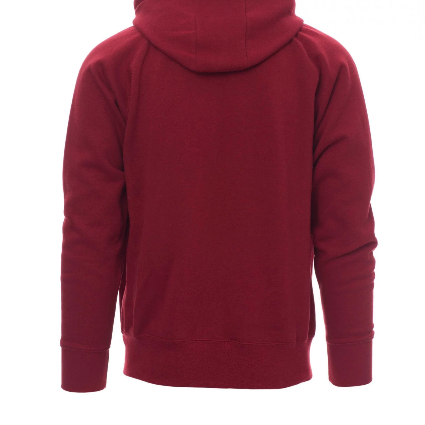 Hanorac pentru bărbați, cu fermoar integral SBS acoperit, din plastic cu dublu cursor metalic, glugă cu două cusături, șnur alb din material textil cu cusături în aceeași culoare cu hanoracul, cu ochiuri metalice, mânecă raglan, buzunare de tip marsupiu cu buzunar mic cu fermoar, bandă elastică la manșete și în talie. Cusături întărite.