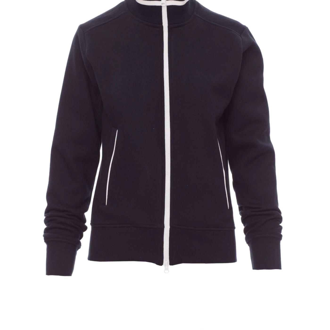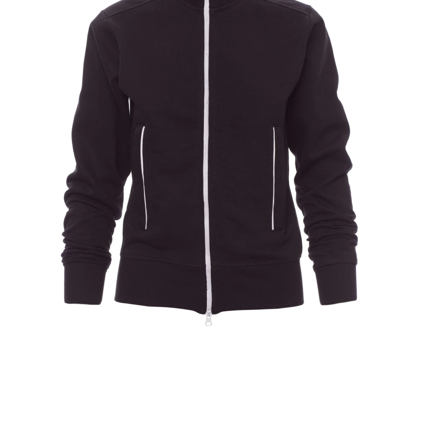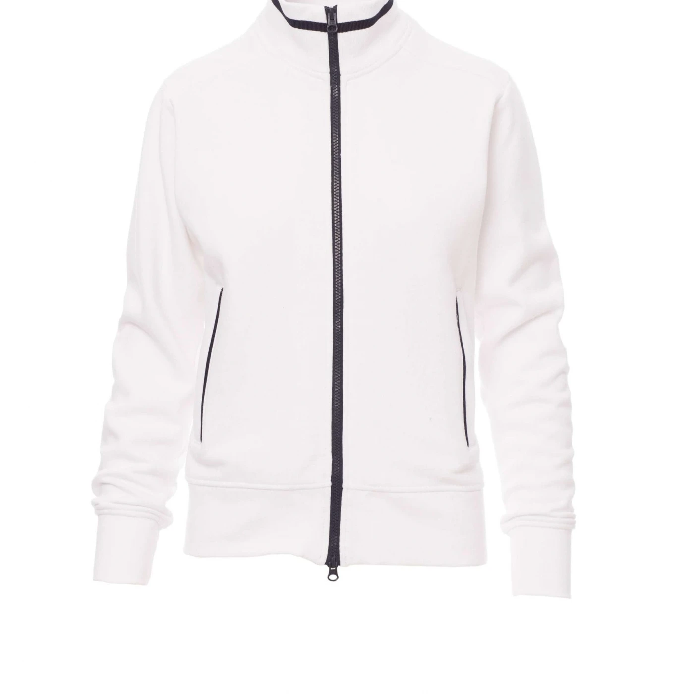 Bluză de trening ajustată pentru femei, cu fermoar integral SBS din plastic, în culoare contrastantă, cu cursor dublu metalic. Guler cu bandă elastică cu profil contrastant, prezent și la nivelul buzunarelor laterale, mânecă ajustată, două buzunare exterioare cu fermoar contrastant, bandă elastică la manșete și în talie. Cusături întărite.
